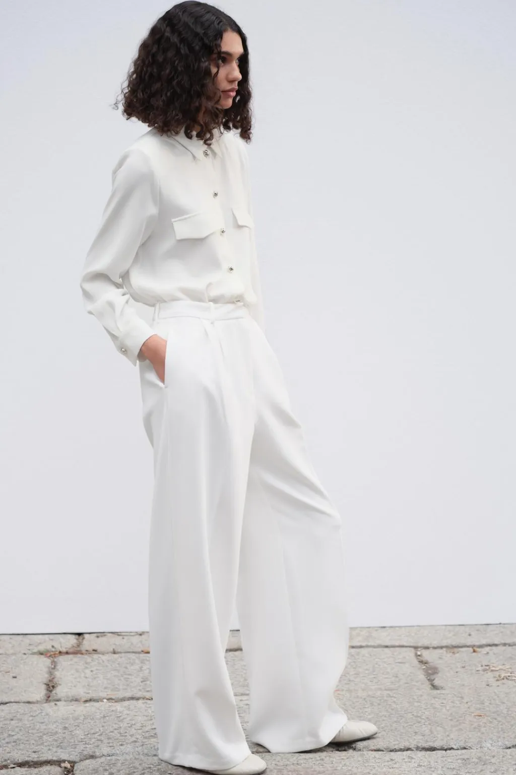 Camisa de cuello solapa y manga larga con hombreras. Detalle de tapetas delanteras. Cierre frontal con botones dorados.