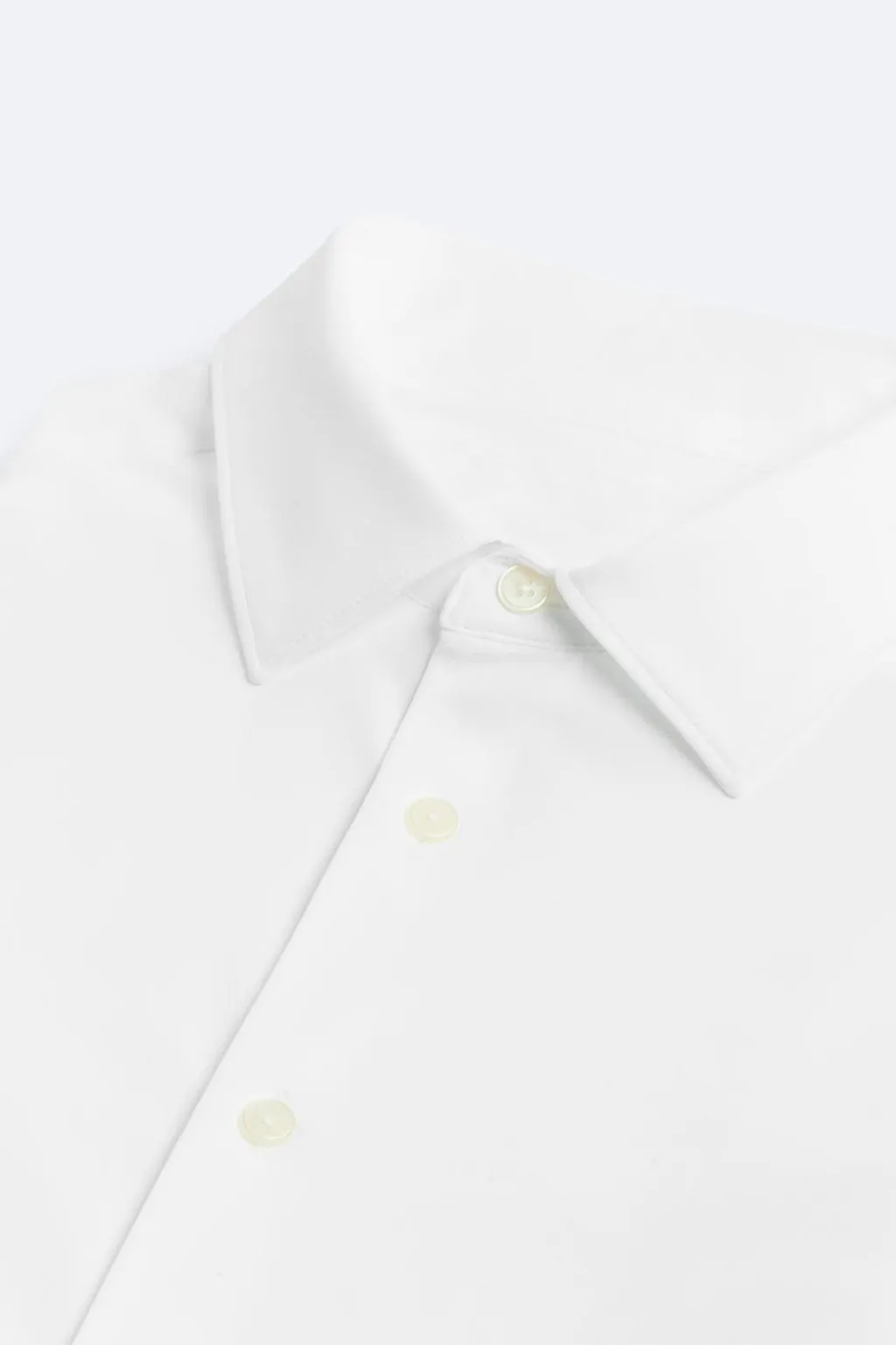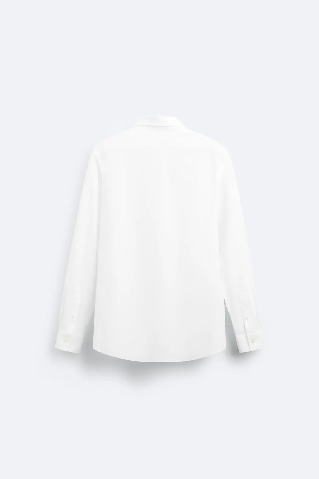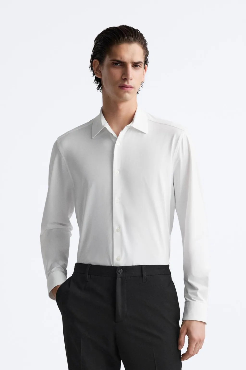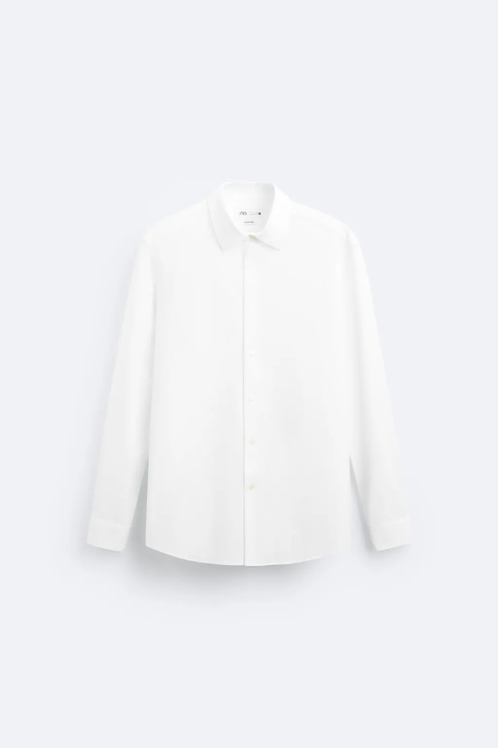 Camisa slim fit confeccionada en un tejido que minimiza la necesidad de plancha después del lavado. Cuello italiano y manga larga acabada en puño con botón. Cierre frontal de botonadura.