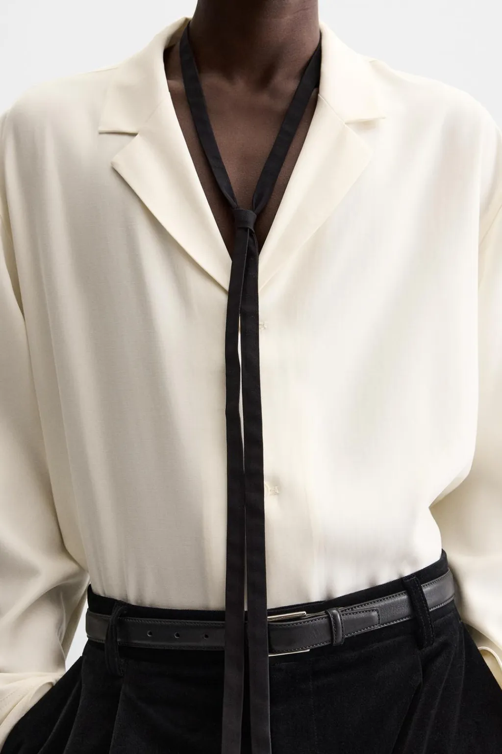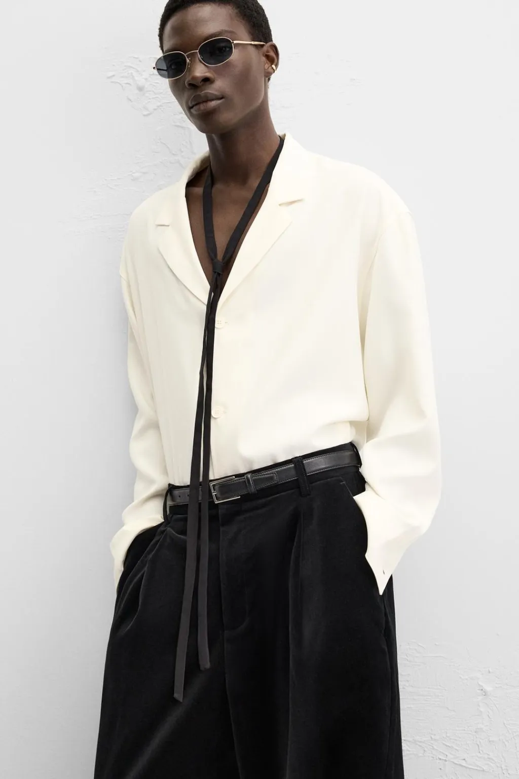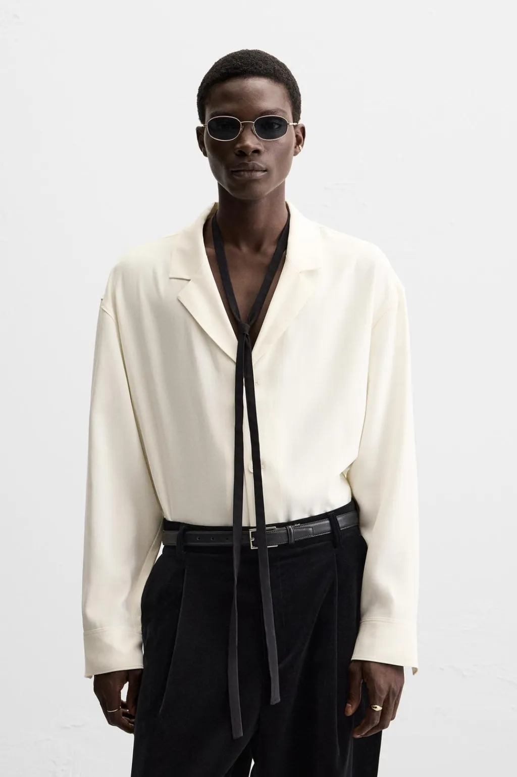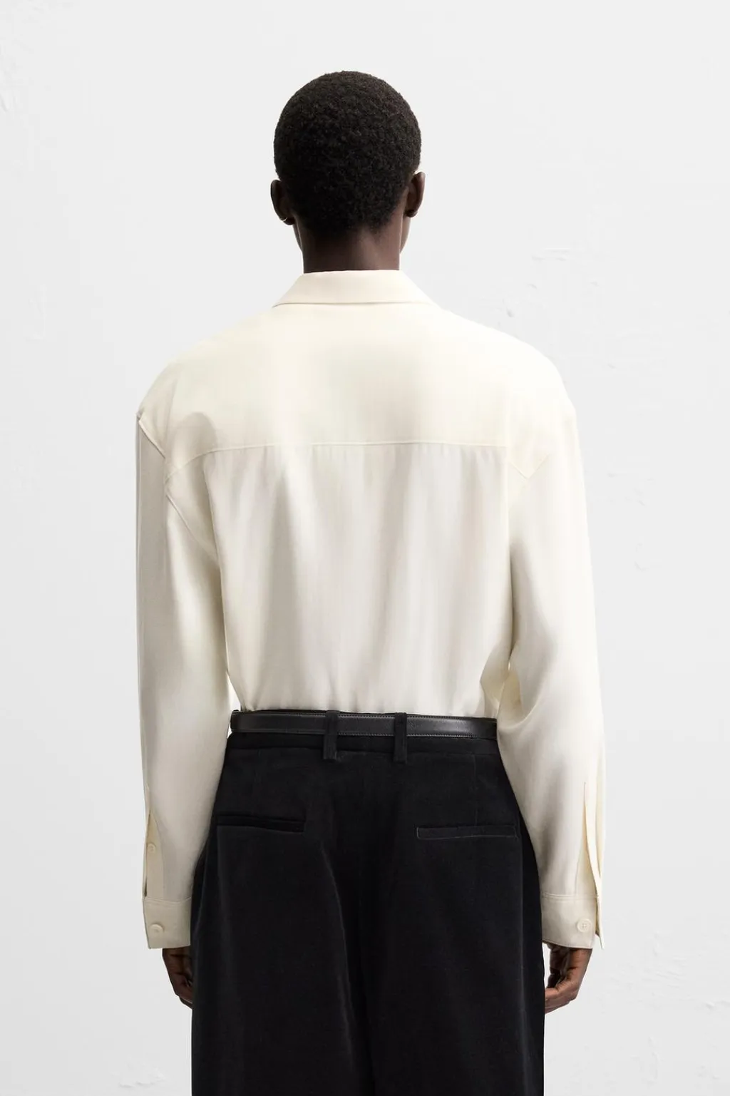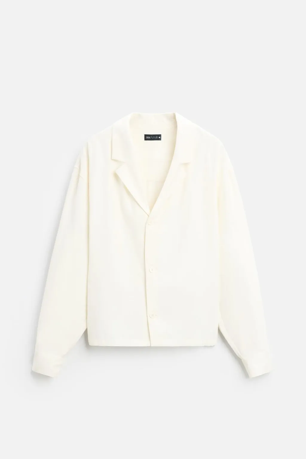 Camisa relaxed fit confeccionada en tejido con mezcla de viscosa. Cuello bowling y manga larga acabada en puño con botón. Bajo con aberturas laterales. Largo cropped. Cierre frontal de botonadura.