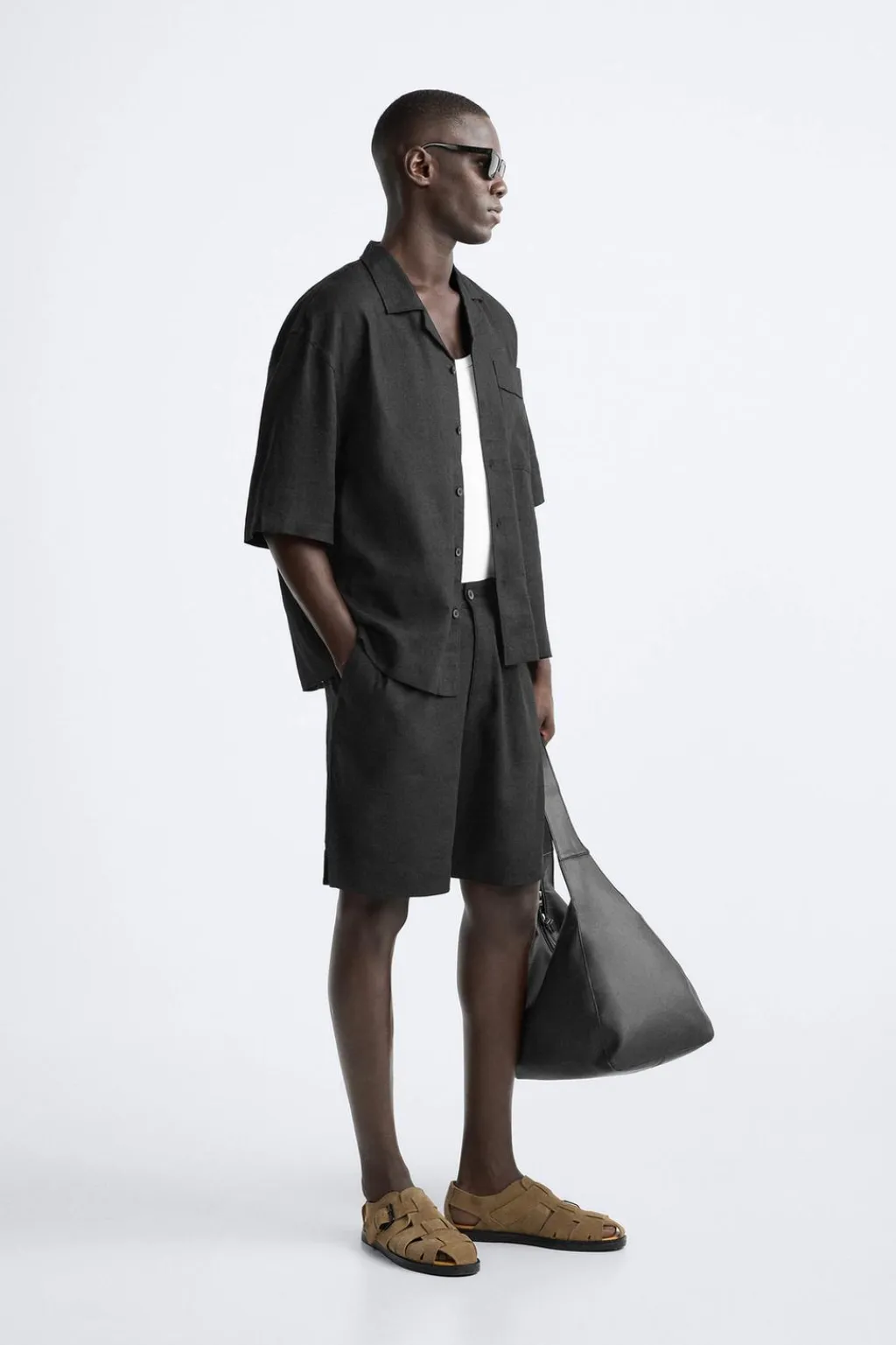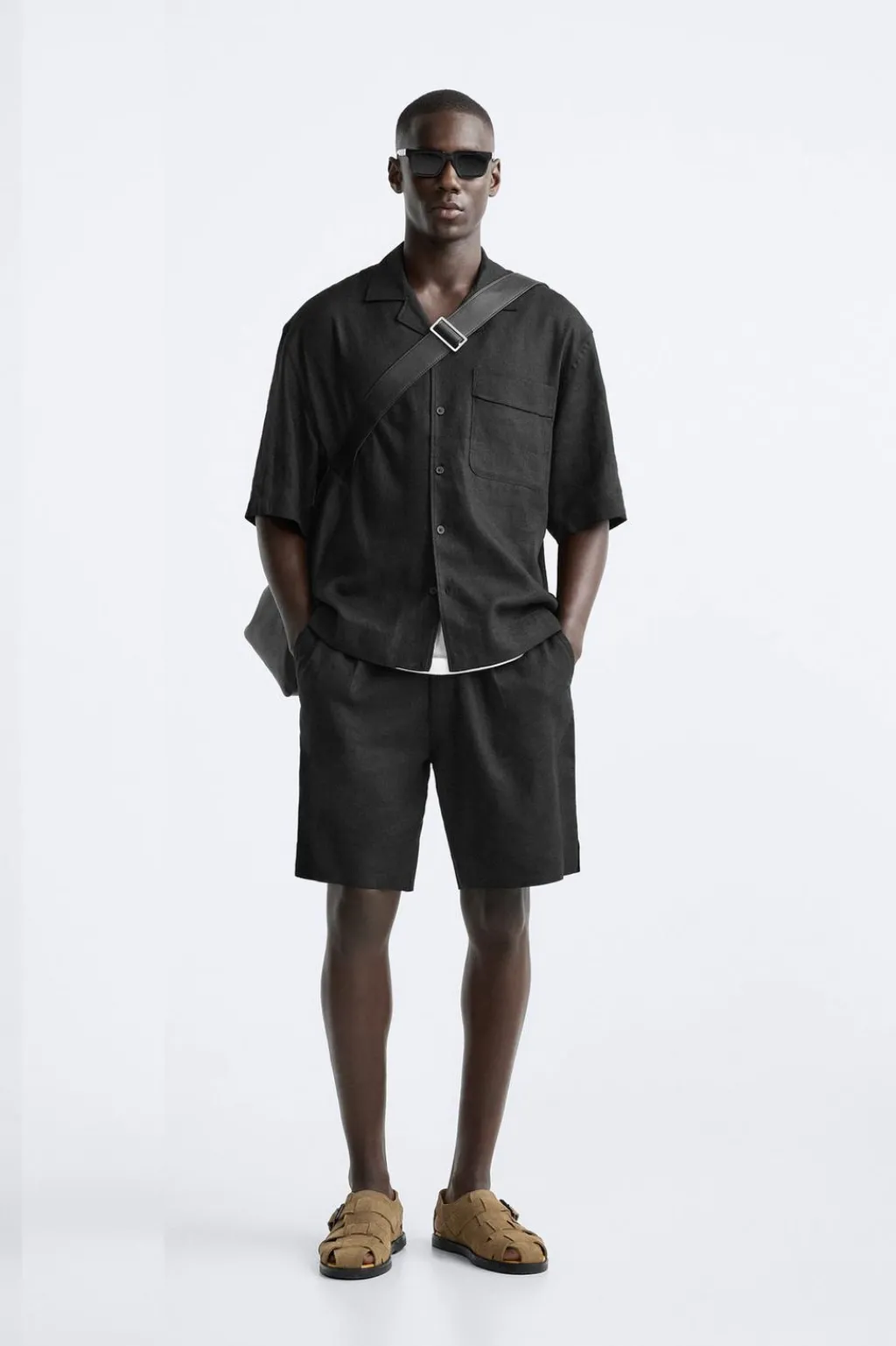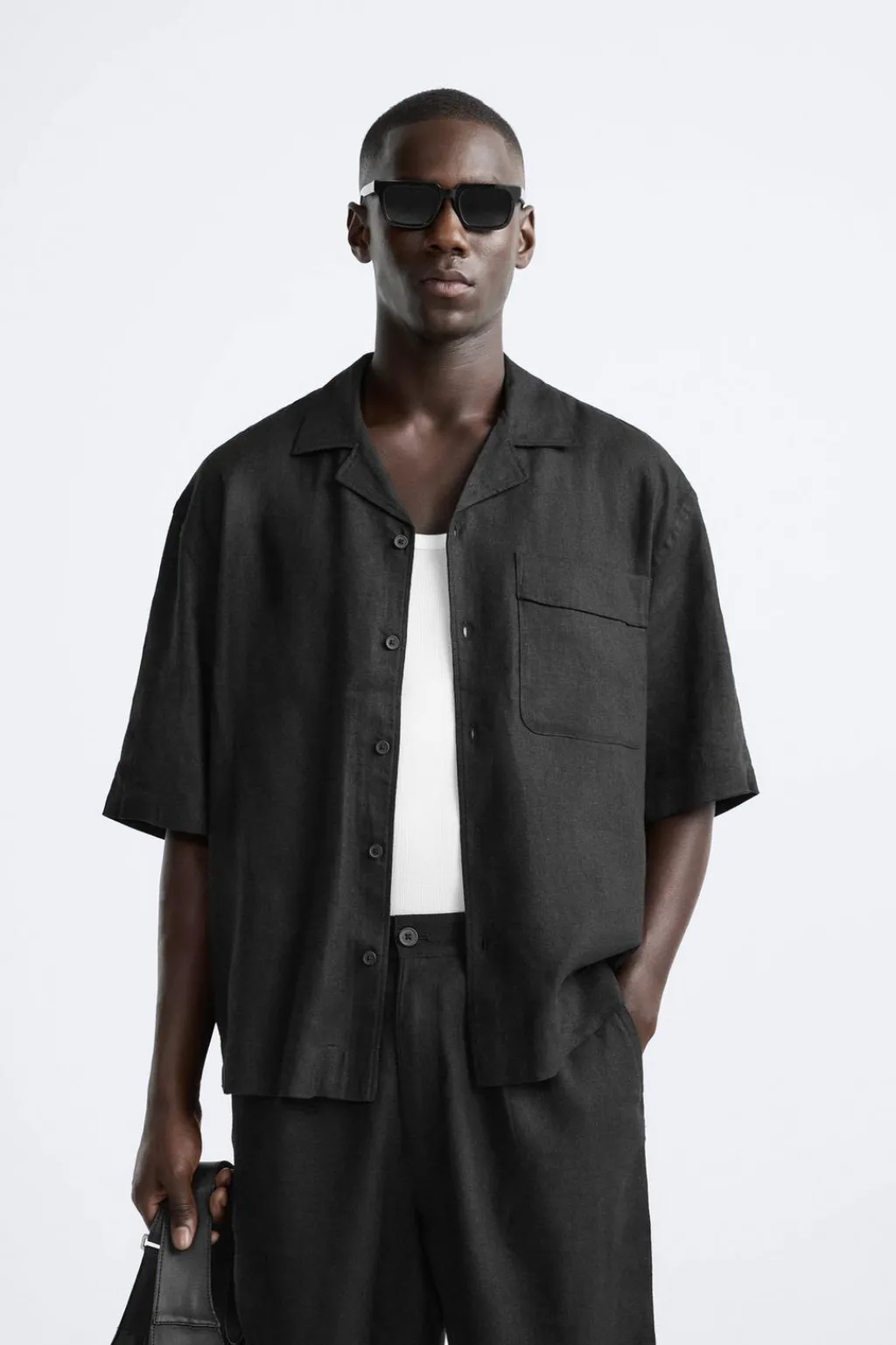 Camisa oversize fit confeccionada en tejido fluido con mezcla de lino y viscosa. Cuello bowling y manga corta. Bolsillo plastrón en pecho. Cierre frontal de botonadura.