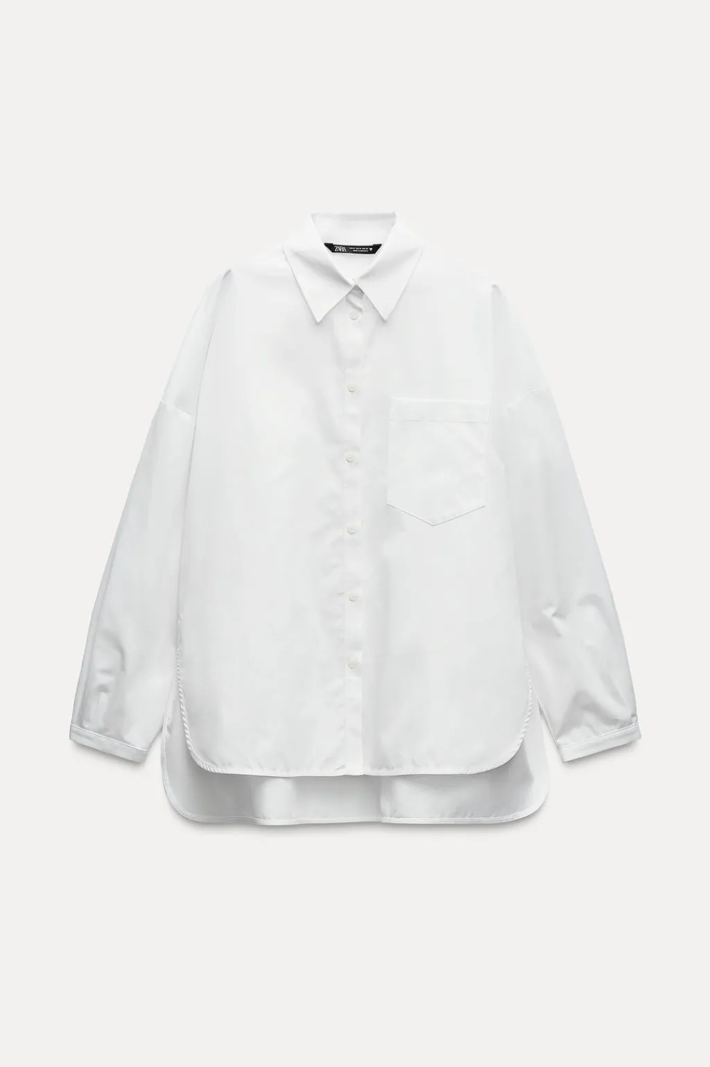 Camisa oversize de cuello solapa. Manga larga acabada en puño con pliegues y hombro caído. Bolsillo de plastrón en pecho. Bajo con aberturas laterales y botones. Cierre frontal con botones.