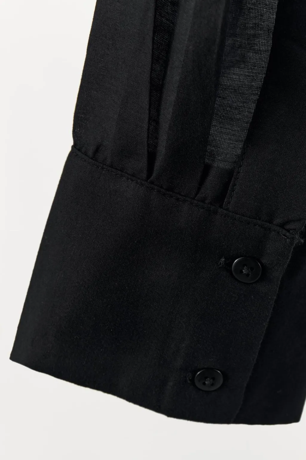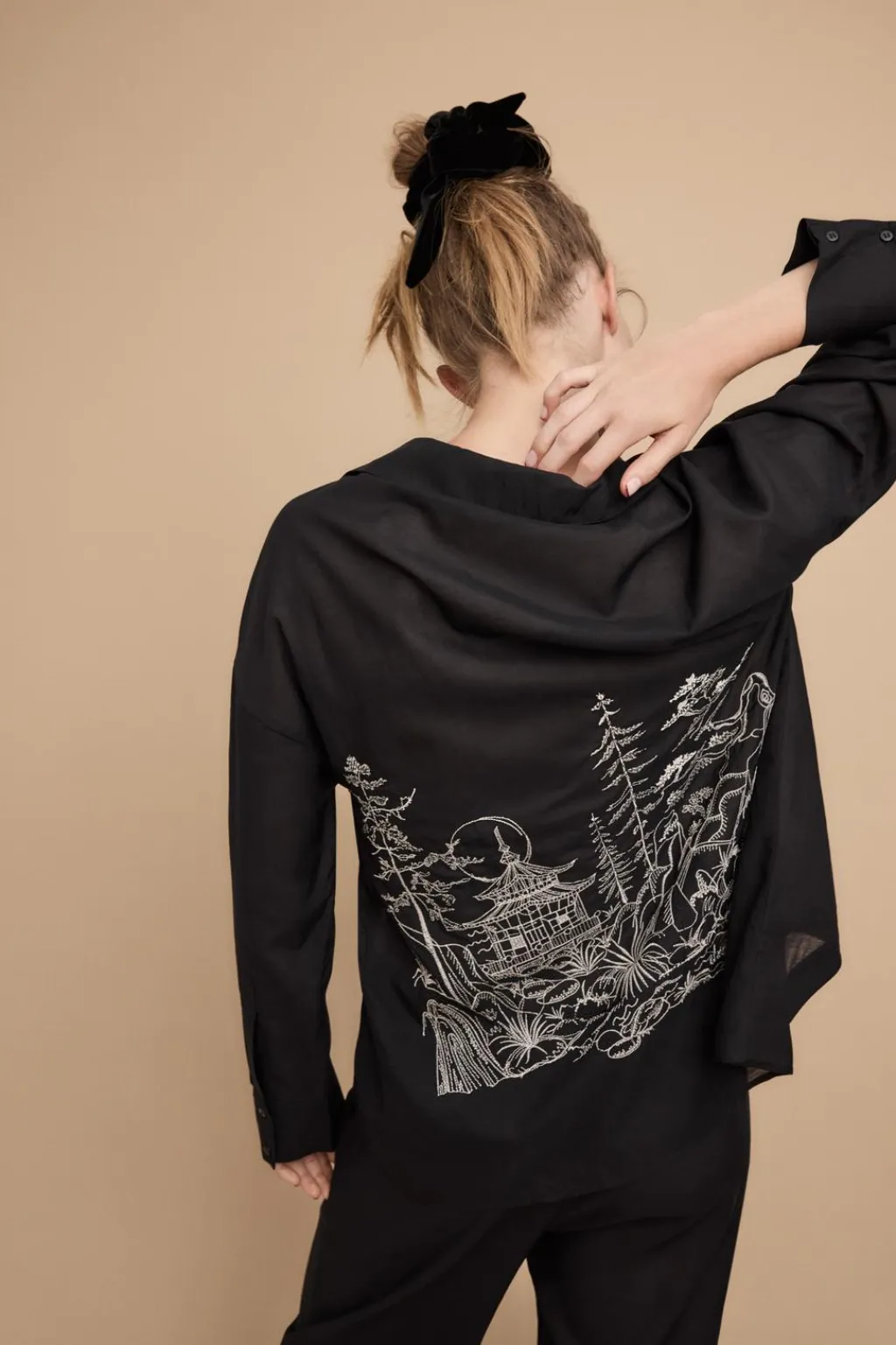 Camisa oversize semitransparente confeccionada en mezcla de viscosa. Cuello solapa con escote pico cruzado. Manga larga con hombro caído acabada en puño. Bordado en espalda combinado a contraste. Bajo asimétrico. Cierre frontal con botones ocultos por sopata.
