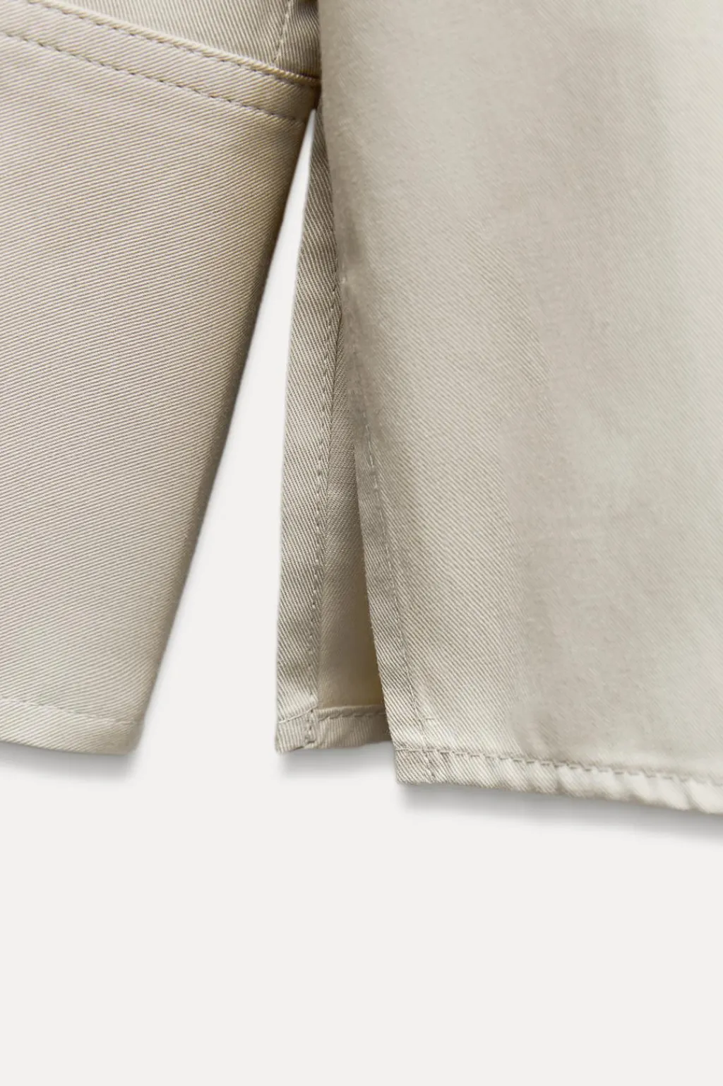 Camisa amplia de cuello solapa y manga larga con botones. Bajo con aberturas laterales. Cierre frontal con botones.