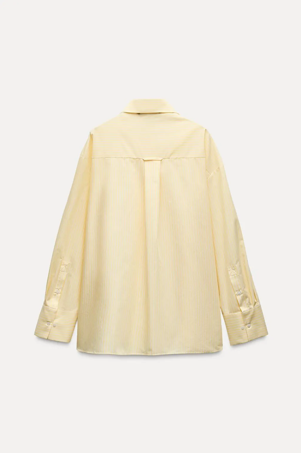 Camisa oversize de cuello solapa. Manga larga con hombro caído acabada en puño. Detalle de pinza en espalda. Cierre frontal con botones.