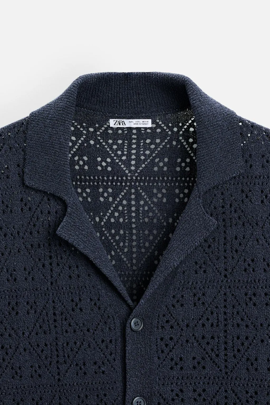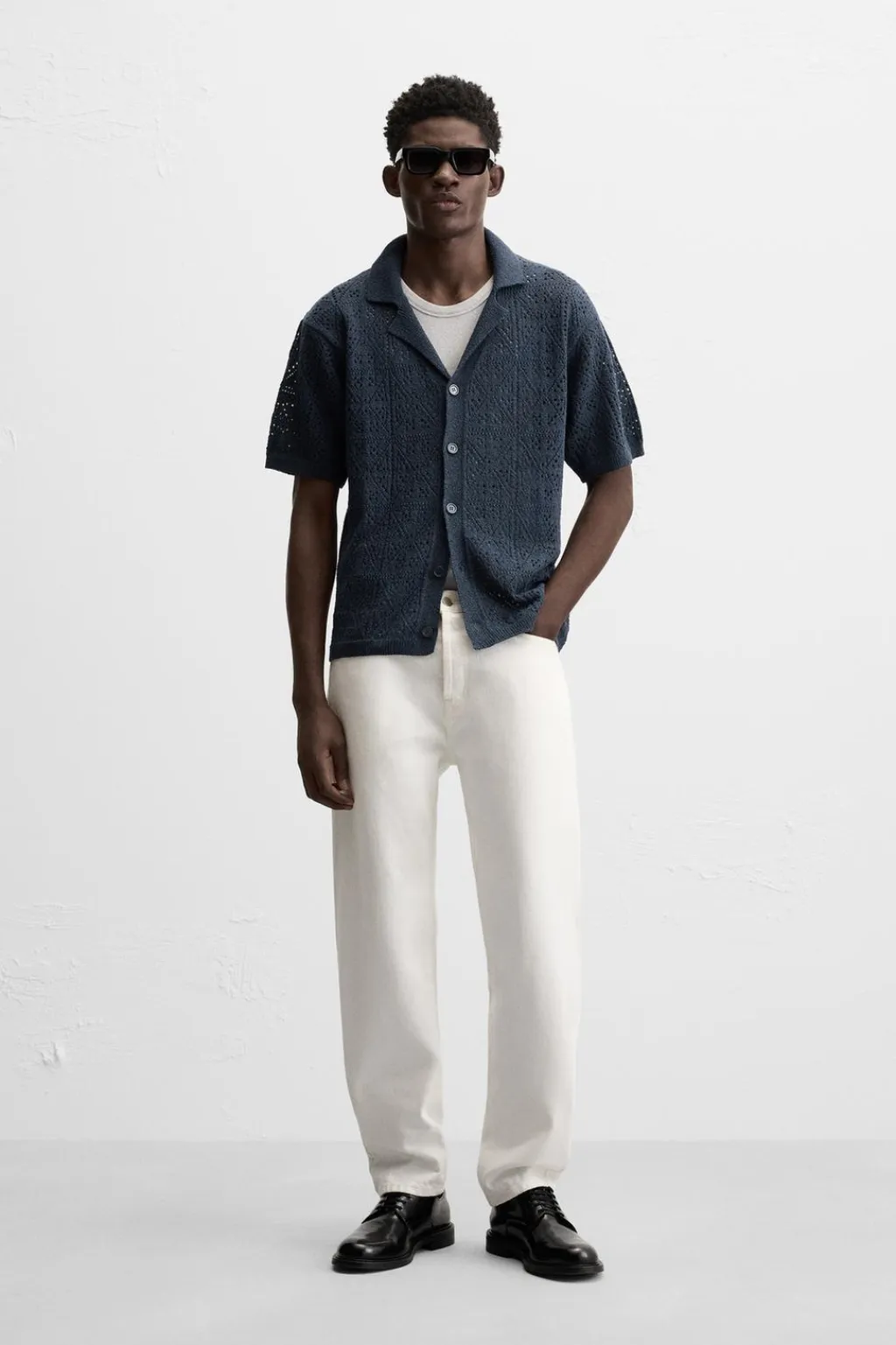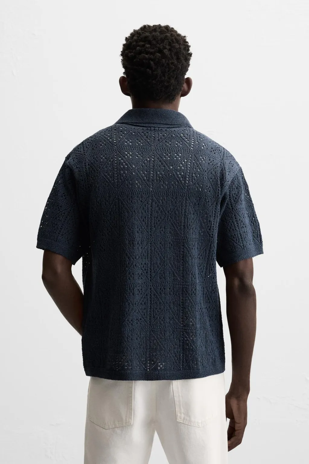 Camisa relaxed fit tejida en hilatura con algodón con estructura abierta. Cuello bowling y manga corta. Cierre frontal de botonadura.