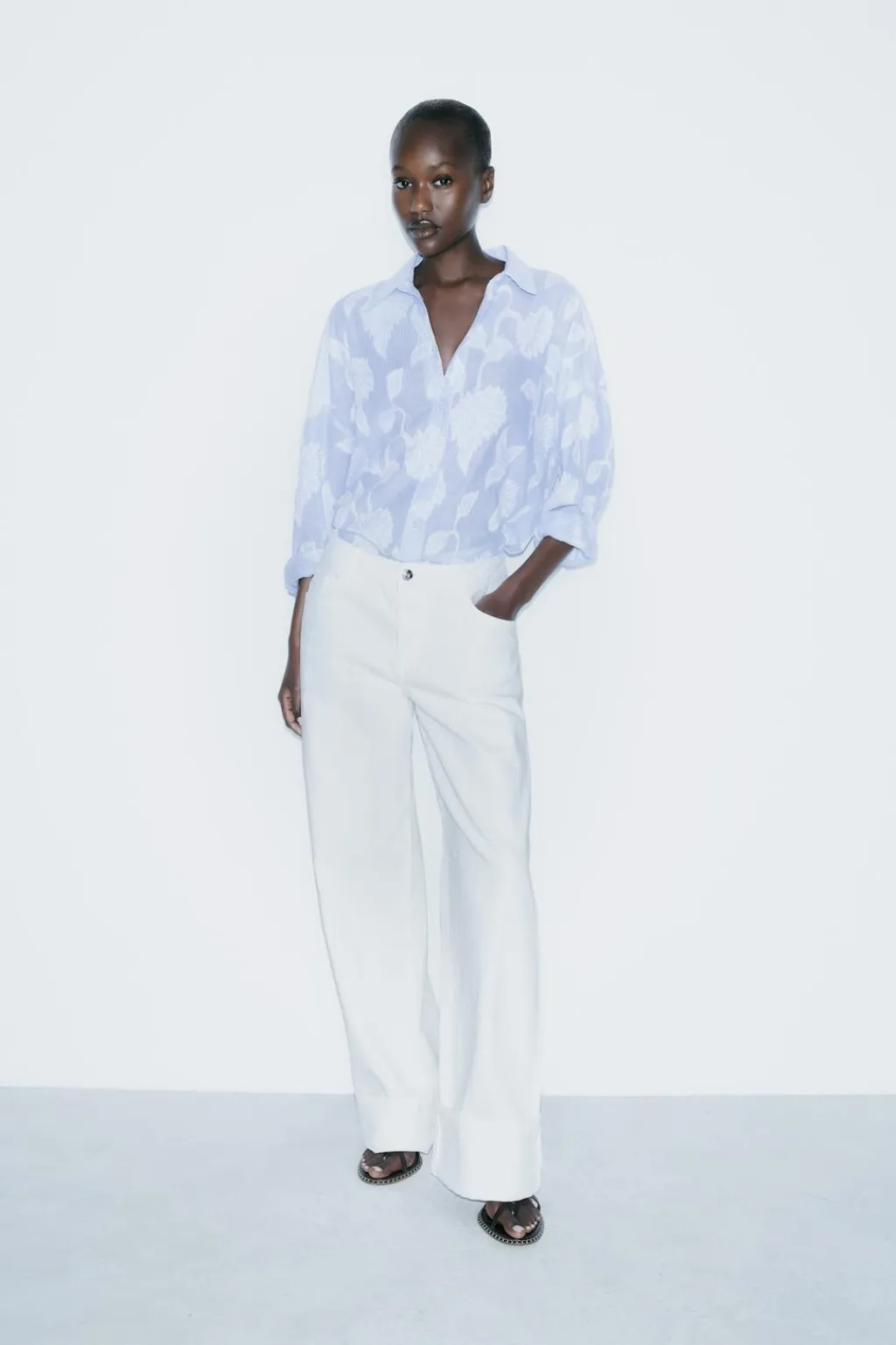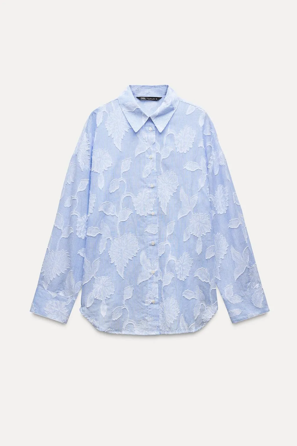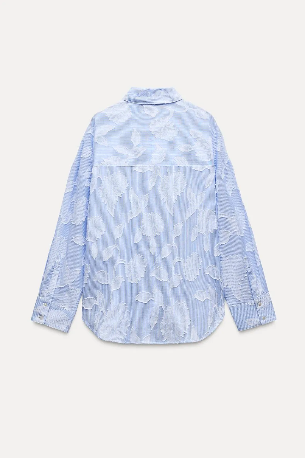 Camisa de cuello solapa y manga larga acabada en puño con hombro caído. Cierre frontal con botones.