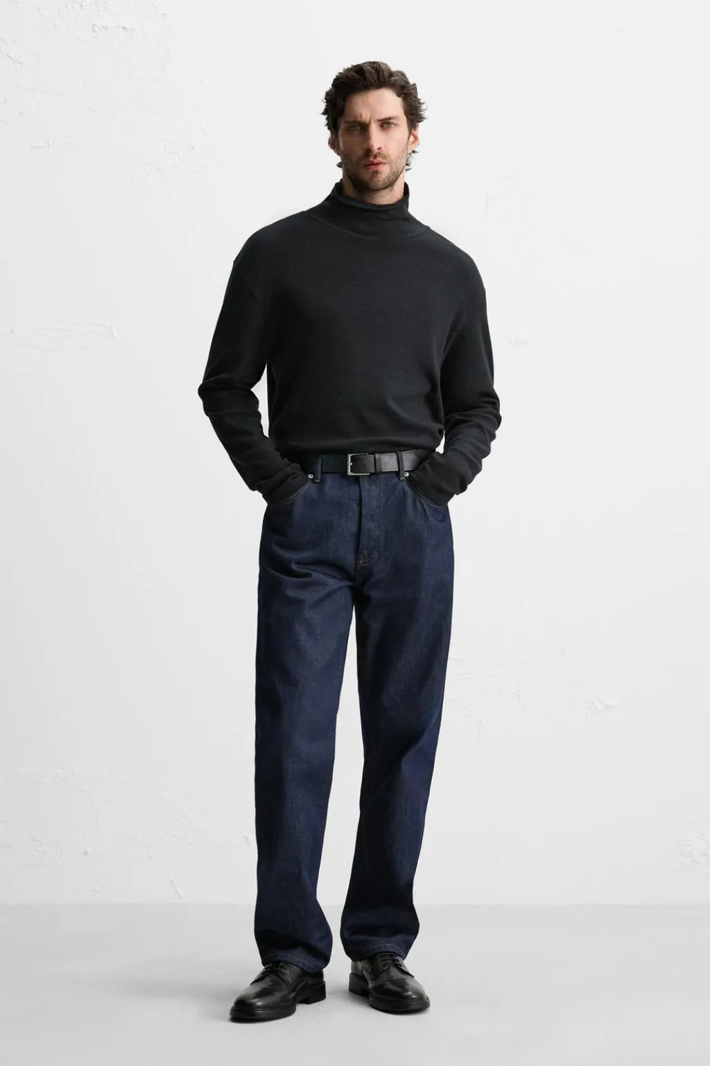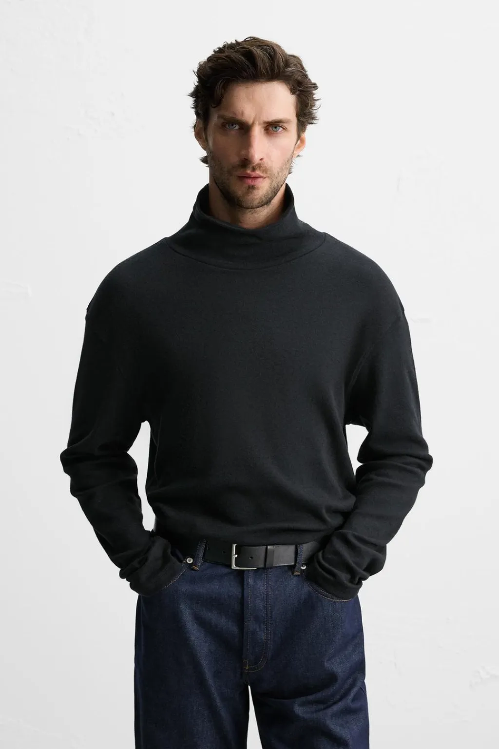 Camiseta relaxed fit confeccionada en tejido de algodón y lana. Cuello subido y manga larga.