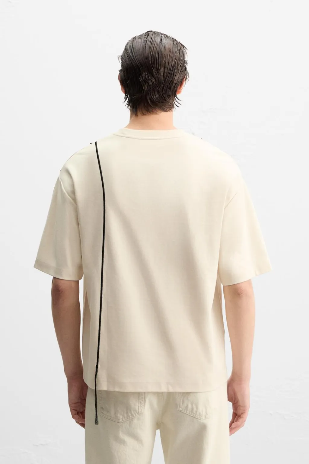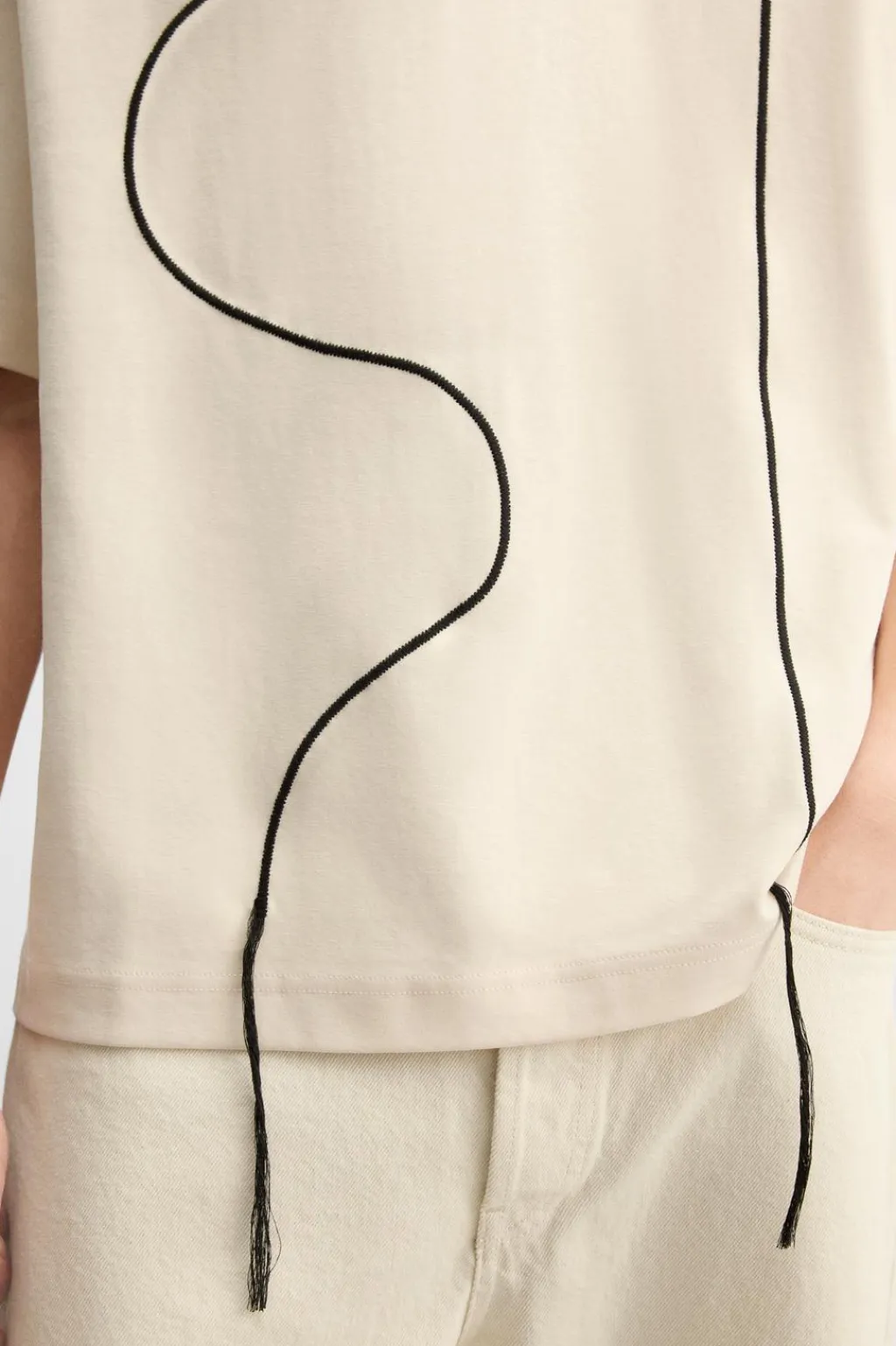 Camiseta relaxed fit. Cuello redondo y manga corta. Aplicación de cordón combinado a contraste en delantero.