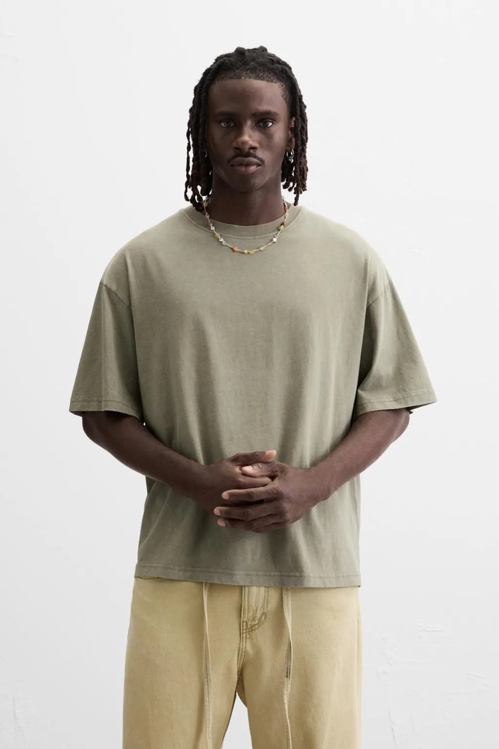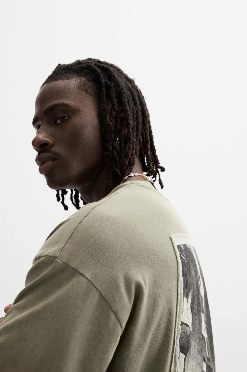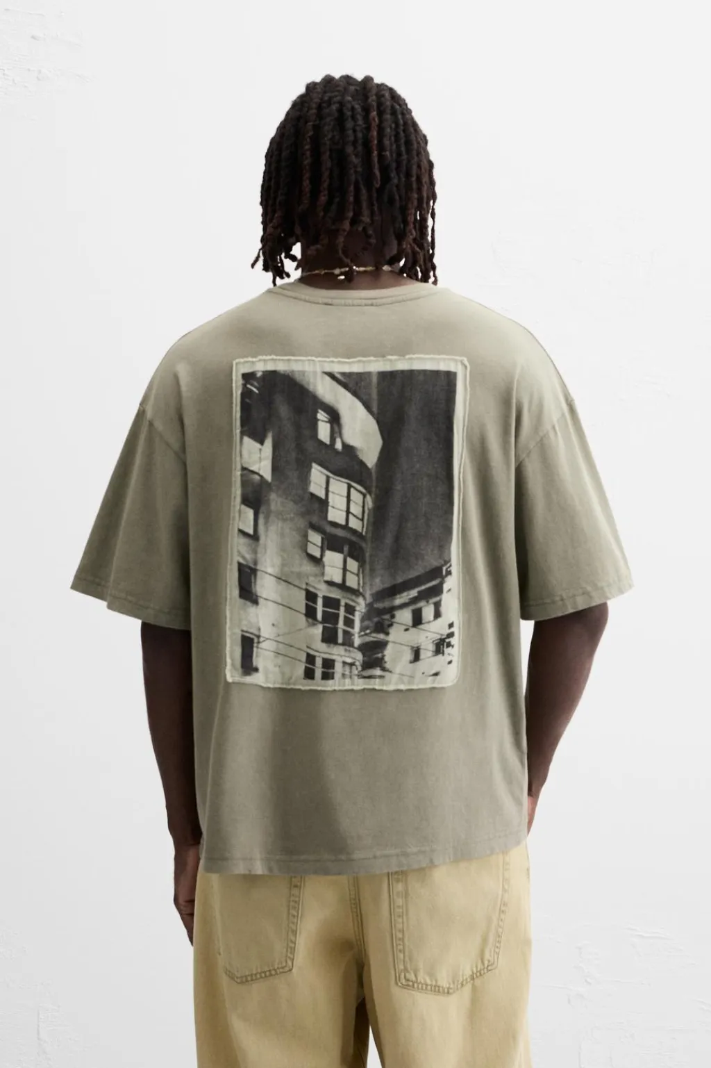 Camiseta relaxed fit. Cuello redondo y manga corta. Aplicación de parche con estampado fotográfico combinado a contraste en espalda. Efecto lavado.