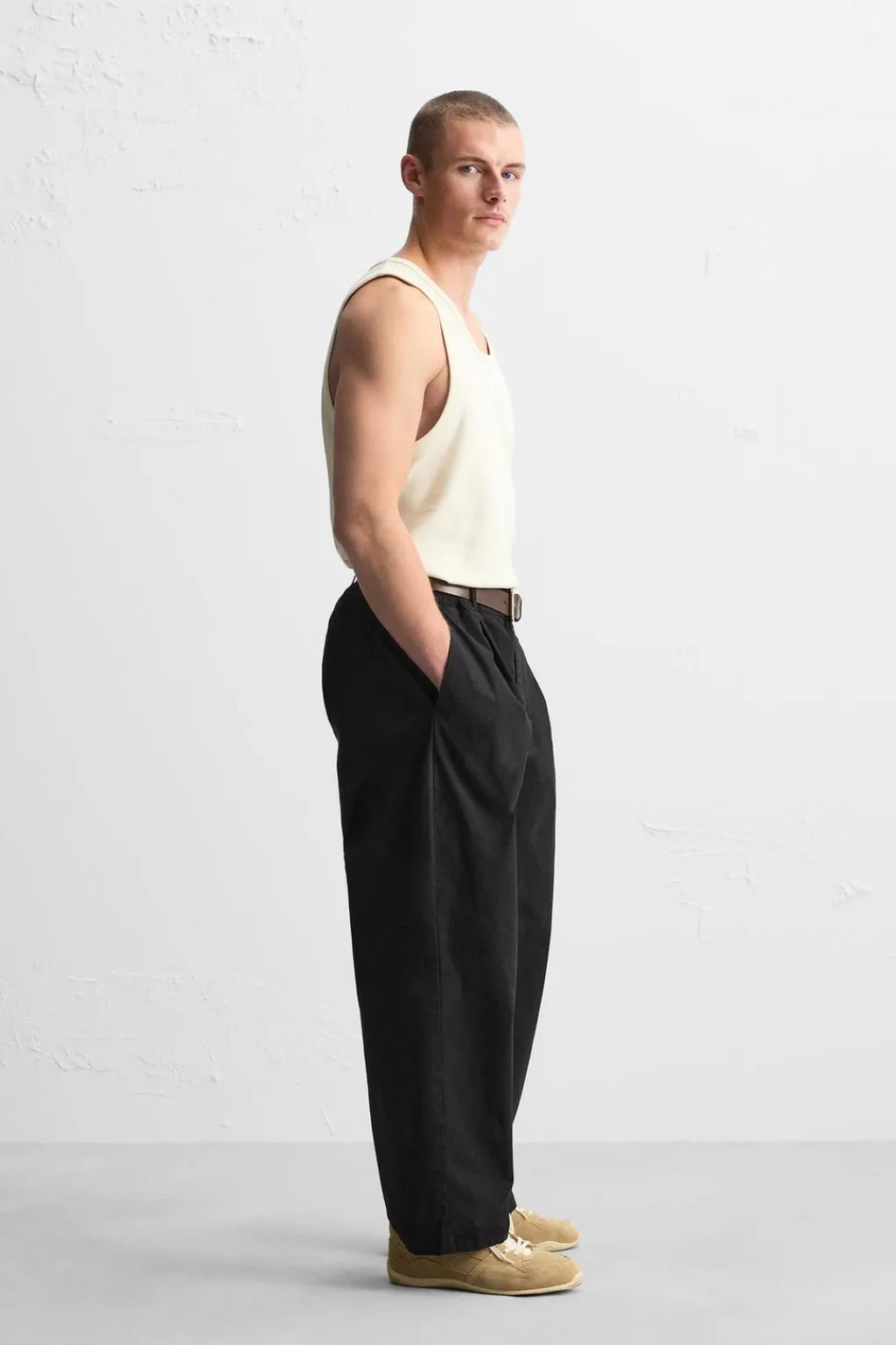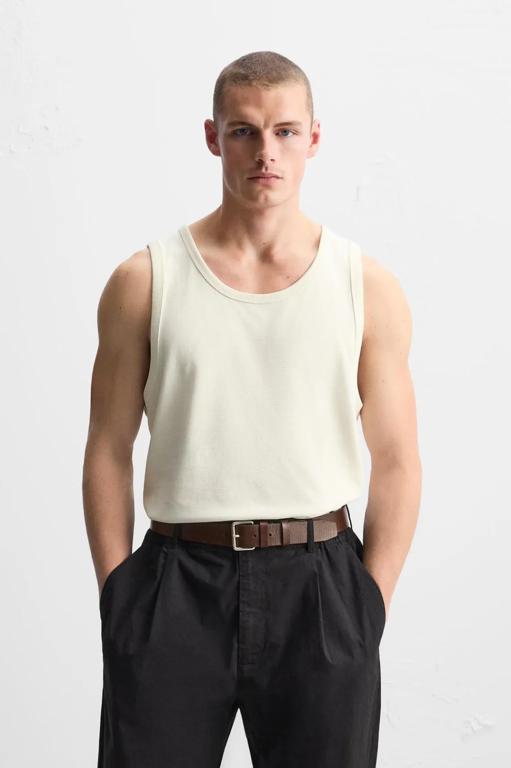 Camiseta slim fit. Cuello redondo amplio y manga sisa.