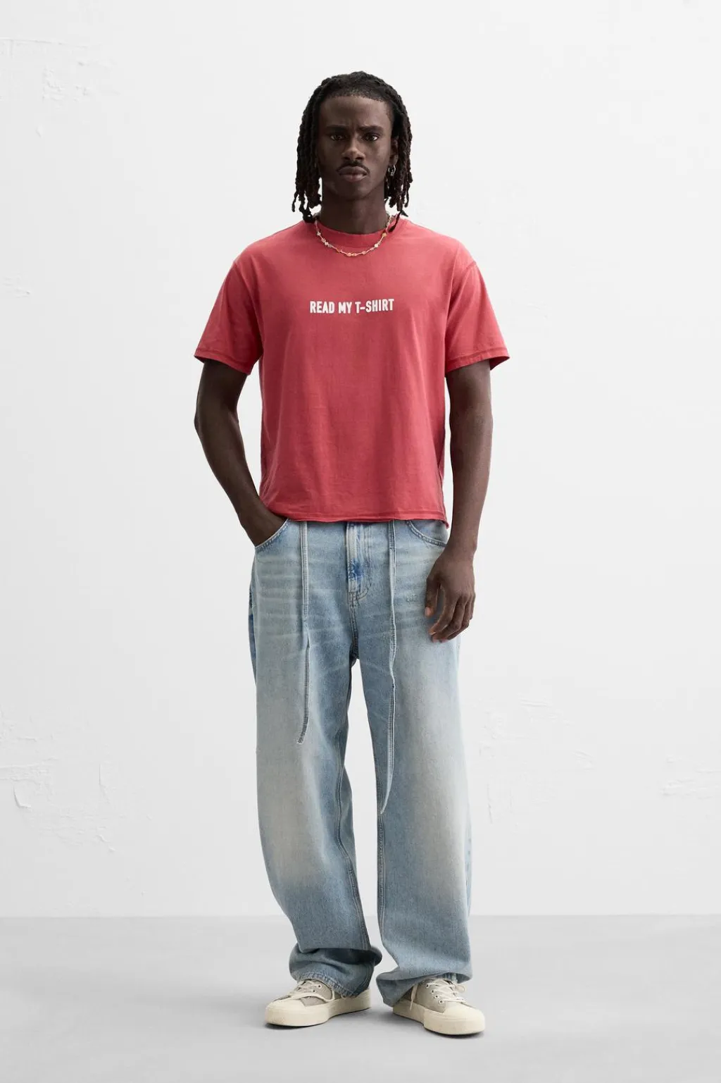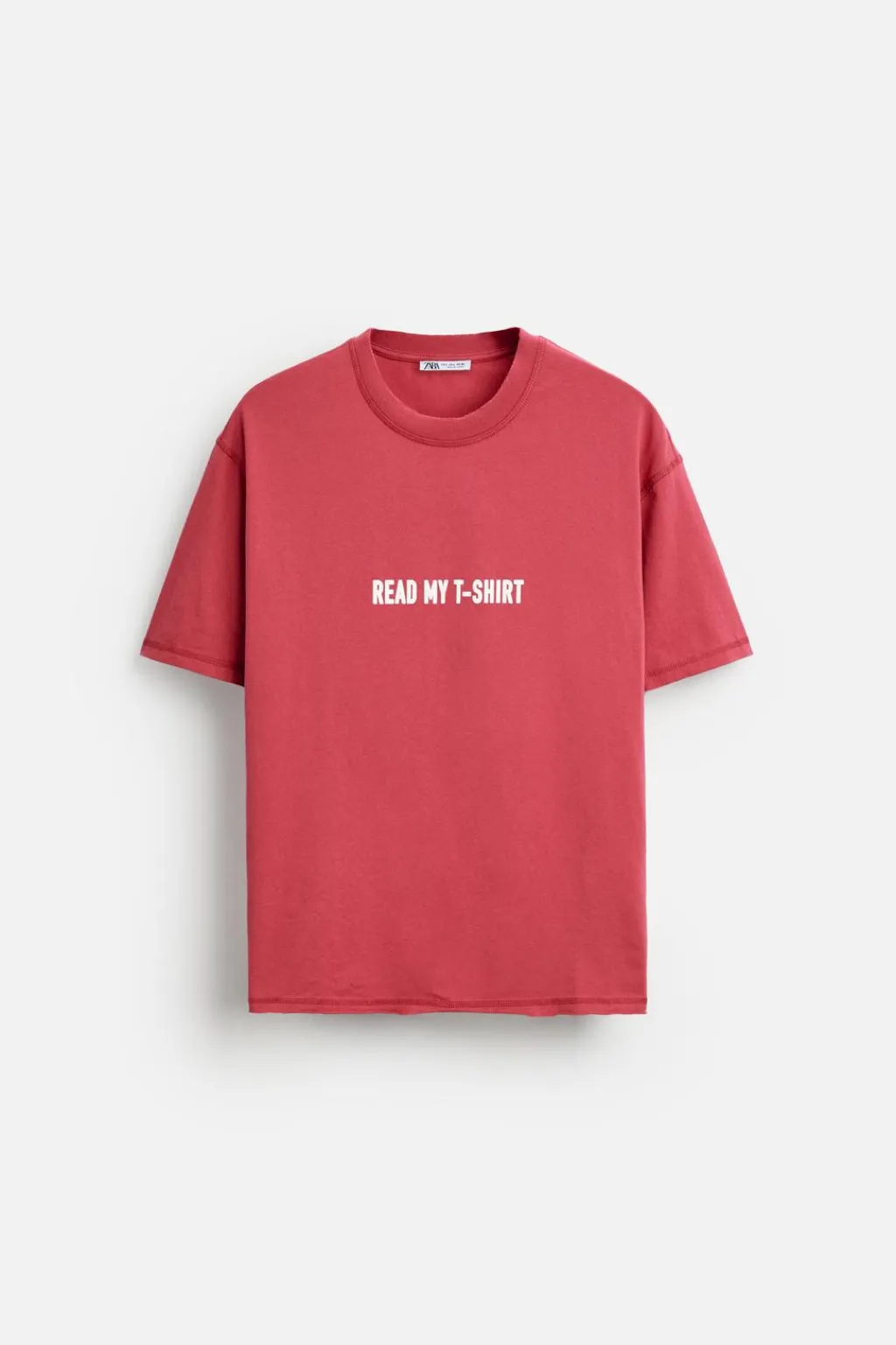 Camiseta cropped fit. Cuello redondo y manga corta. Texto estampado combinado a contraste en delantero. Efecto lavado. Acabados irregulares.