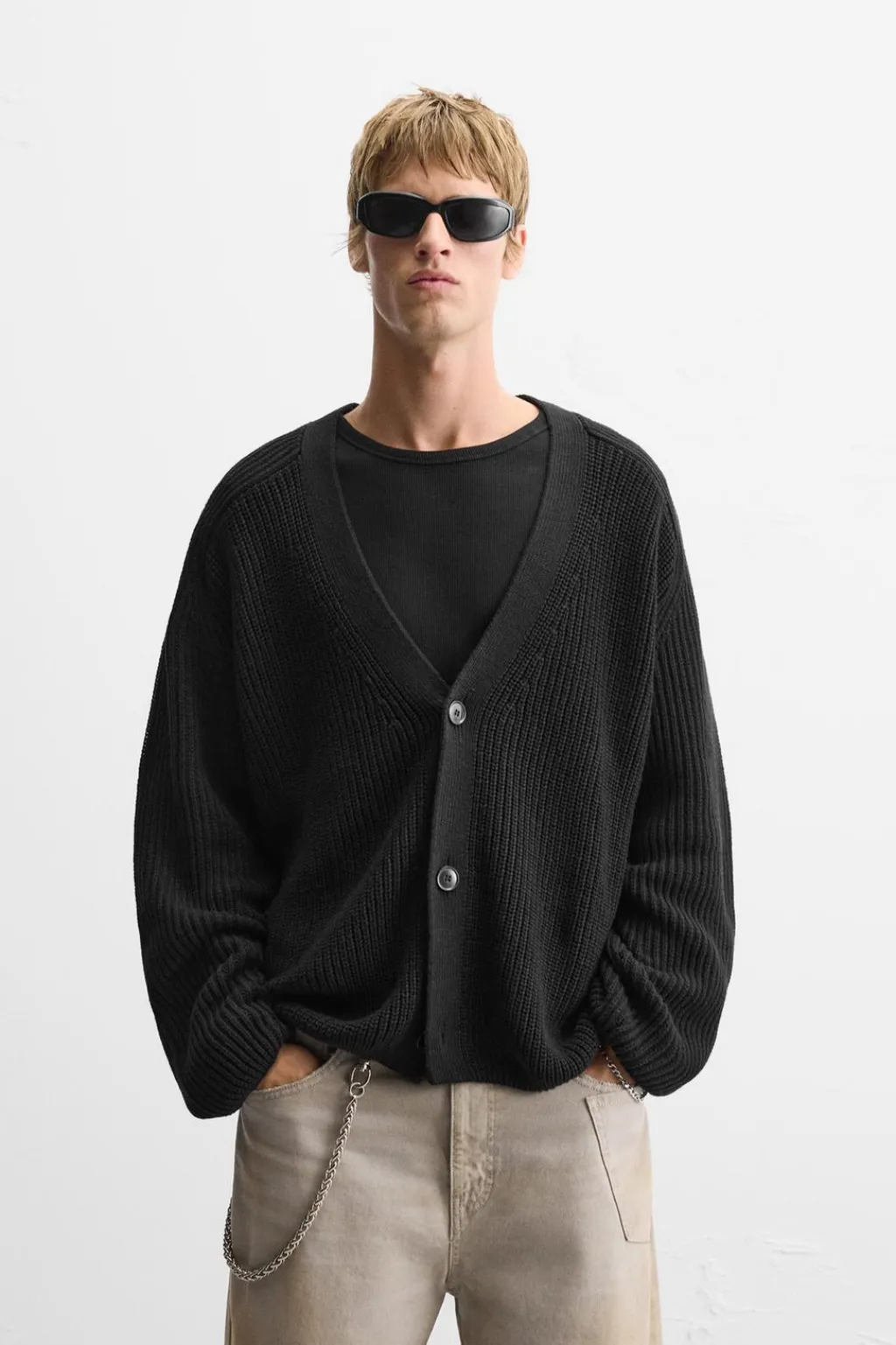 Cárdigan relaxed fit tejido en hilatura de algodón. Cuello pico y manga larga. Acabados en rib. Cierre frontal de botonadura.