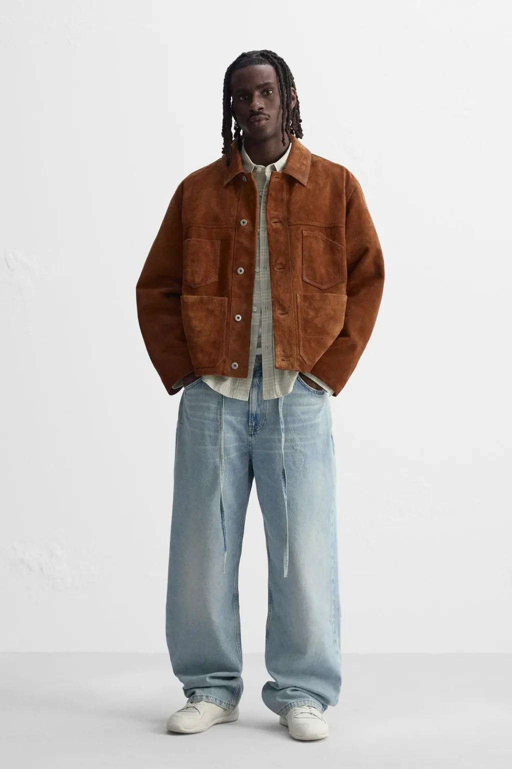 Cazadora cropped fit confeccionada en piel con acabado serraje. Cuello solapa y manga larga acabda en puño con botón. Bolsillos frontales de plastrón. Cierre frontal de botonadura.