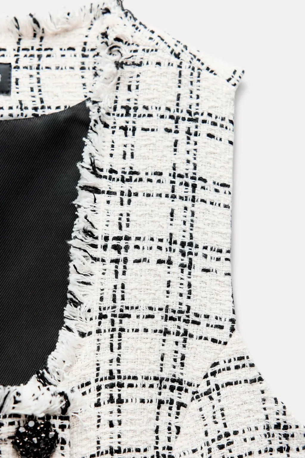 Chaleco de escote cuadrado y manga sisa. Bolsillos delanteros con solapa. Detalle de acabados desflecados. Cierre frontal cruzado con botones joya.