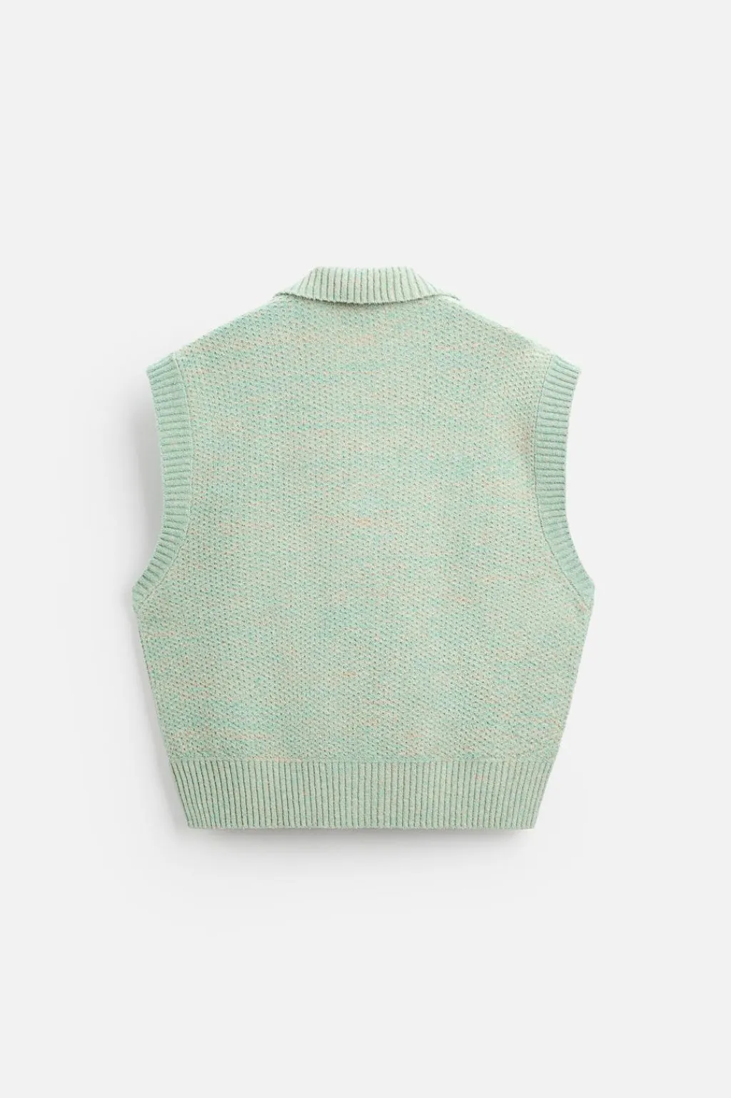 Chaleco boxy fit de punto. Cuello solapa con abertura frontal. Manga sisa. Acabados en rib.