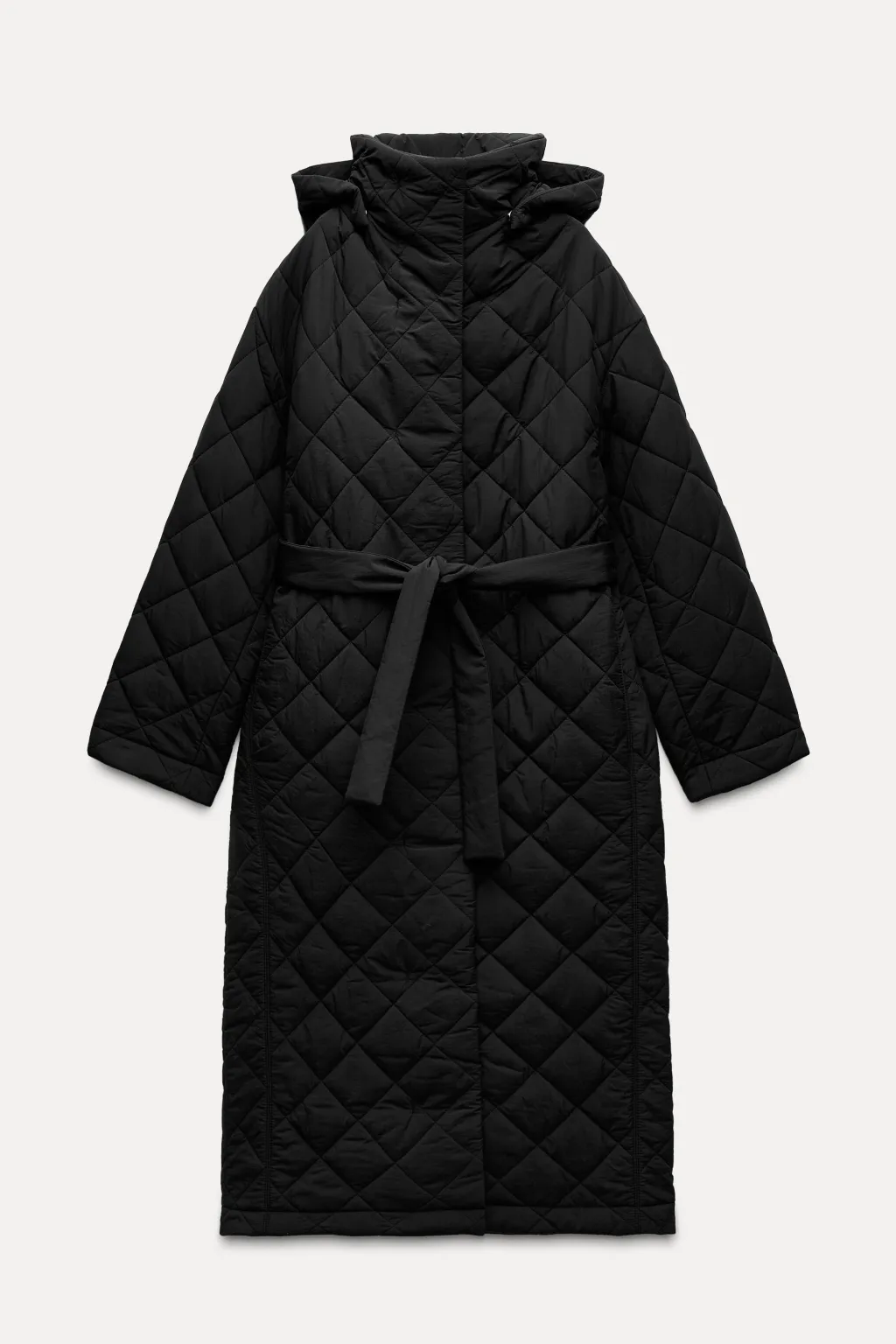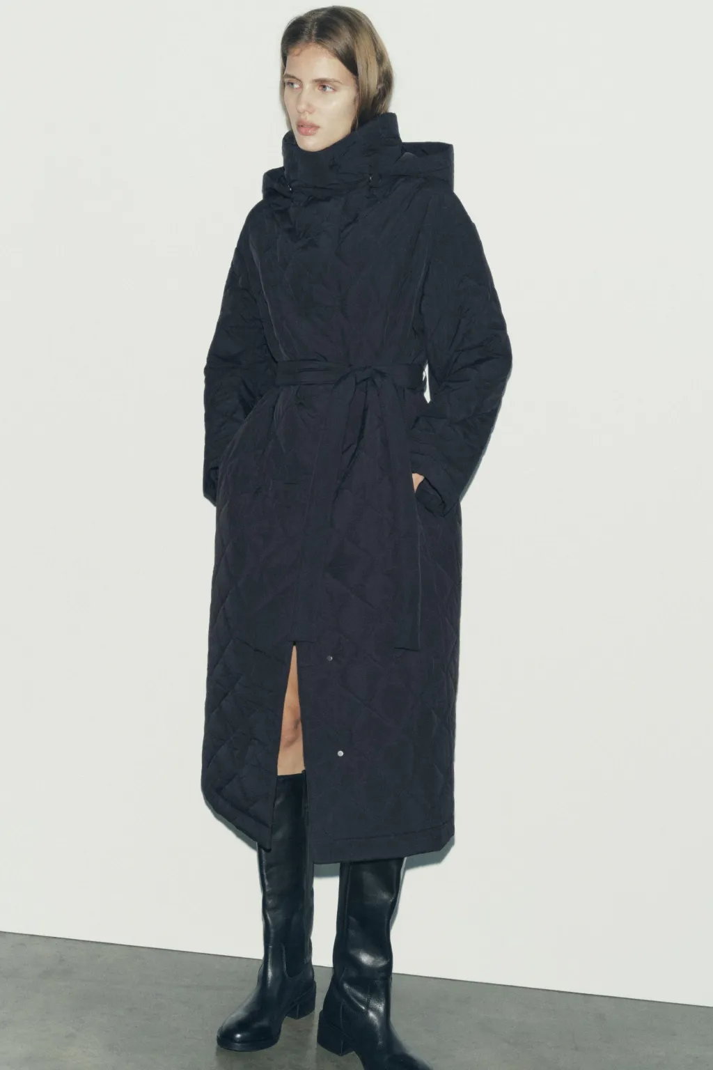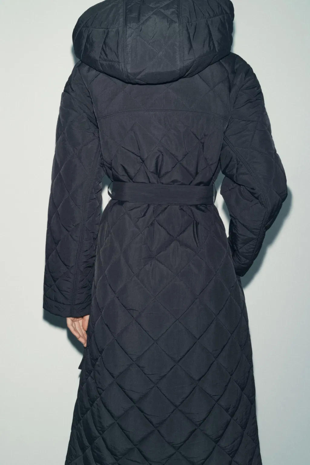 Chaqueta larga acolchada de cuello alto. Capucha extraíble con botones a presión. Manga larga. Cinturón ajustables con lazadas. Bolsillos delanteros. Cierre frontal con botones a presión.