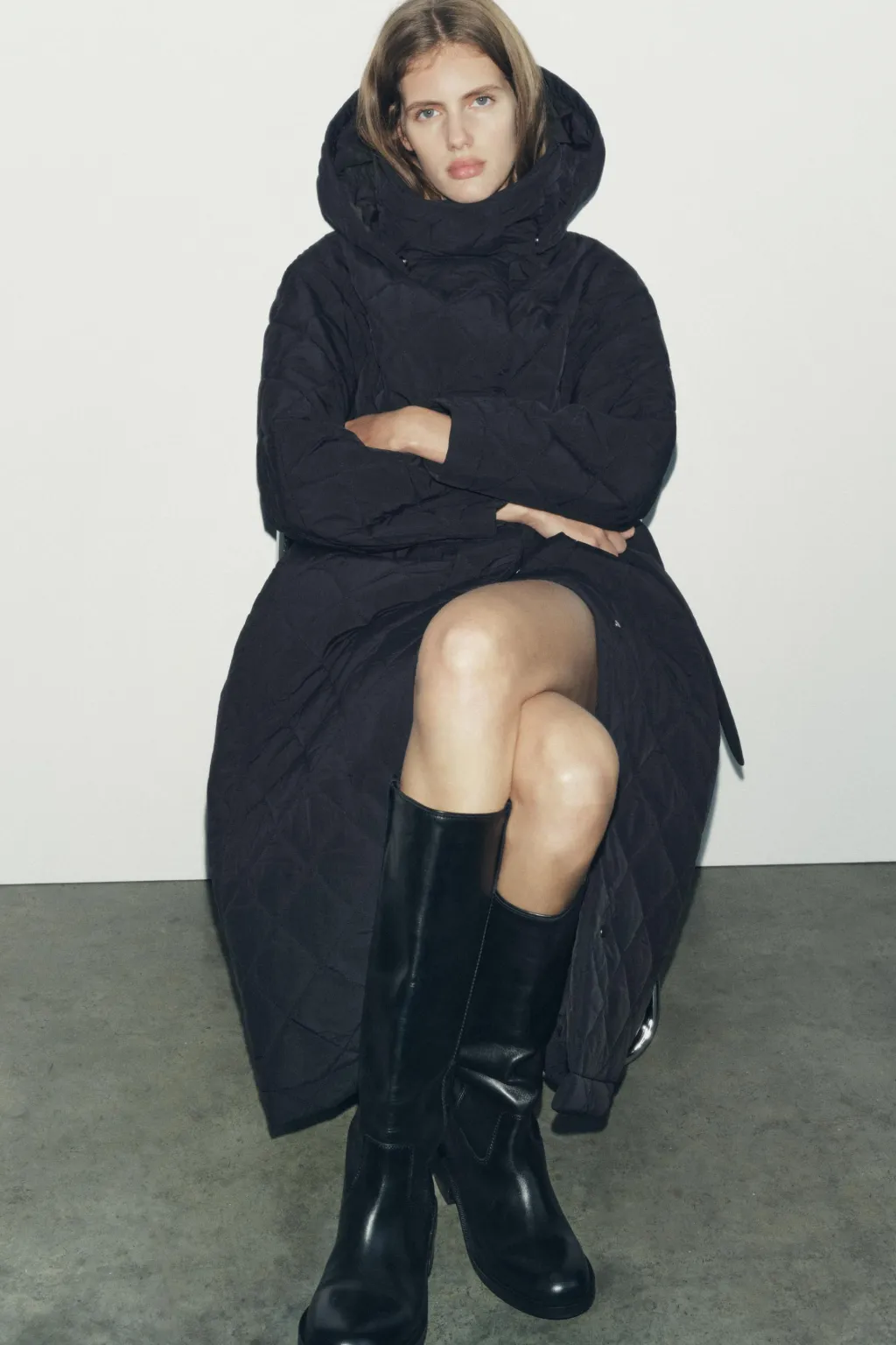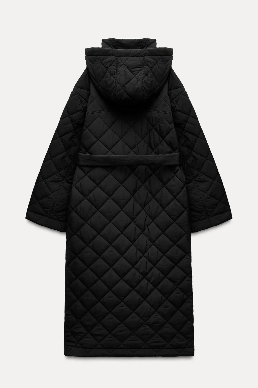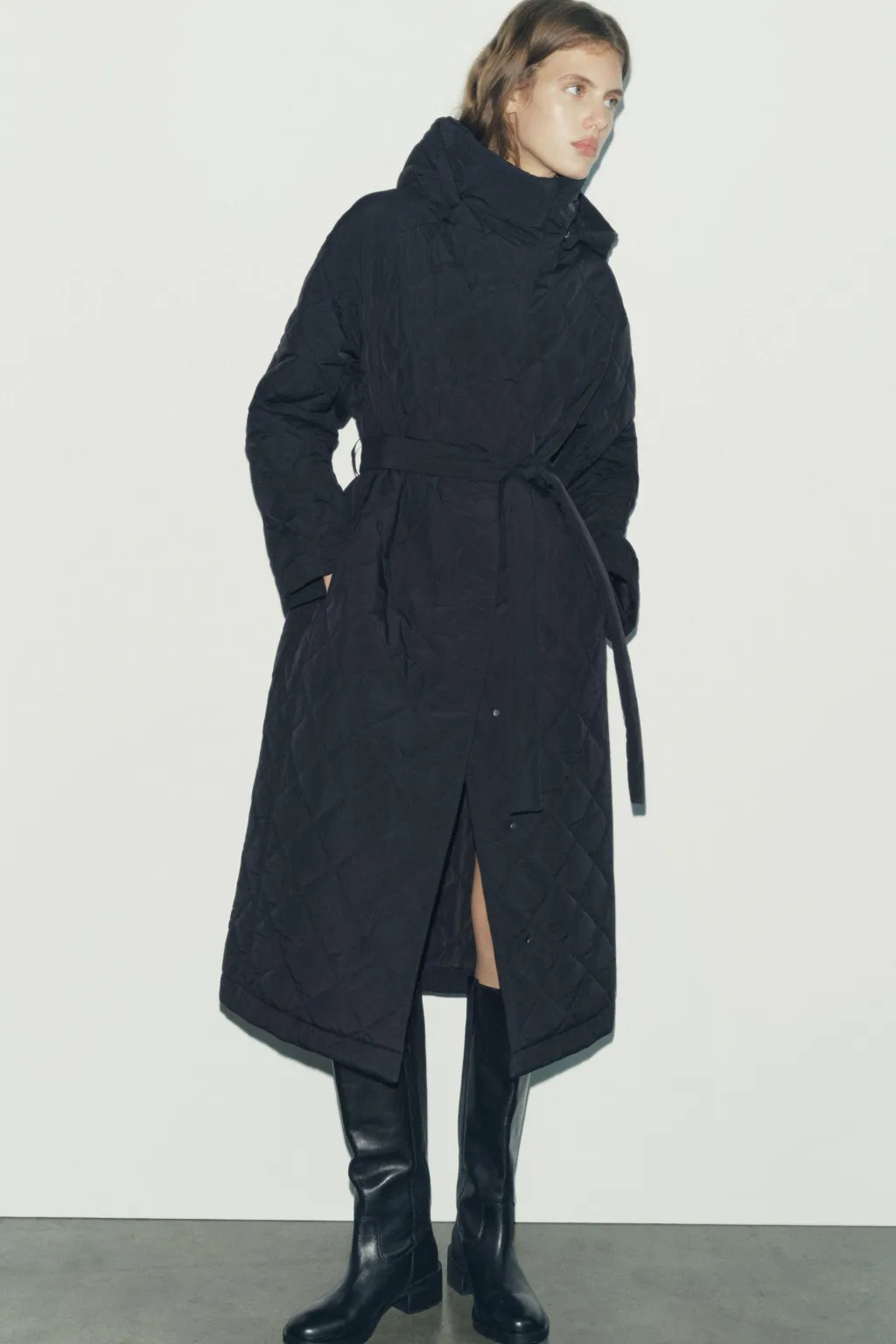 Chaqueta larga acolchada de cuello alto. Capucha extraíble con botones a presión. Manga larga. Cinturón ajustables con lazadas. Bolsillos delanteros. Cierre frontal con botones a presión.