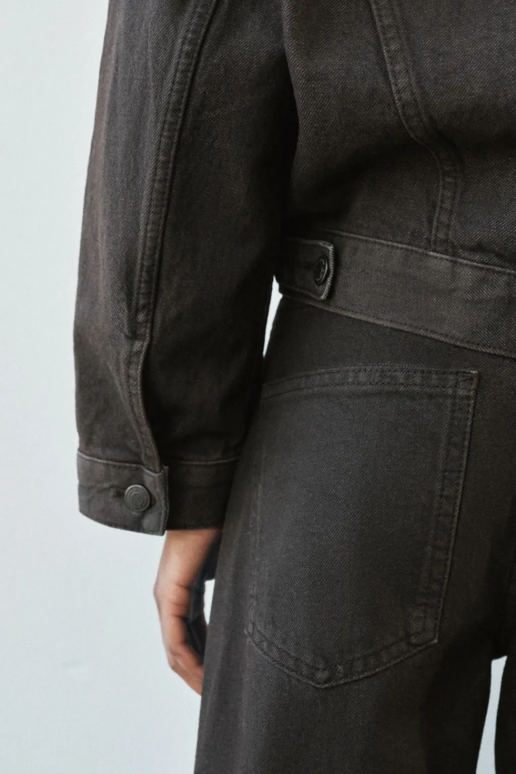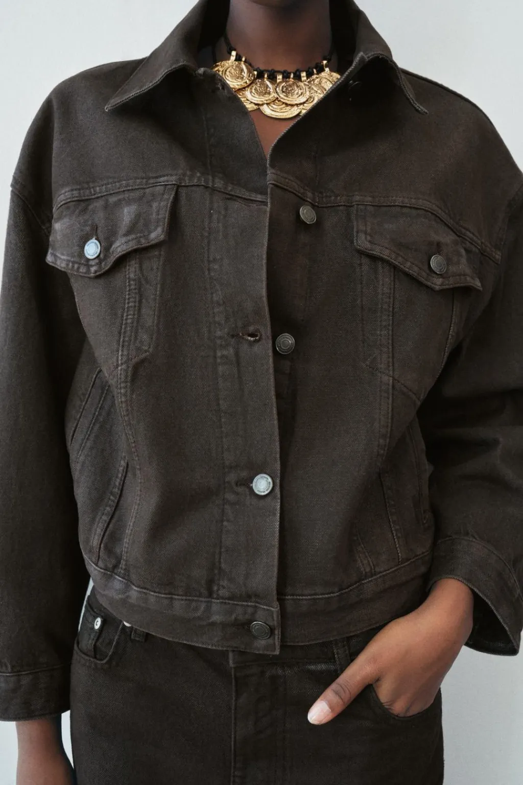 Chaqueta oversize encerada con cuello solapa y manga larga acabada en puño. Cuello solapa y manga larga acabada en puño. Bolsillos con solapa y botón en delantero. Cierre frontal con botones.