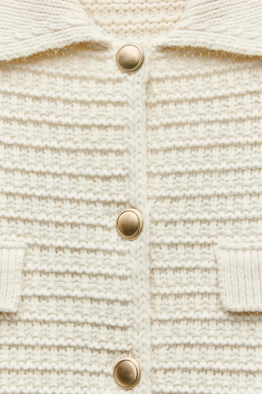 Chaqueta de cuello solapa y manga larga. Detalle de solapas delanteras. Cierre frontal con botones dorados.
