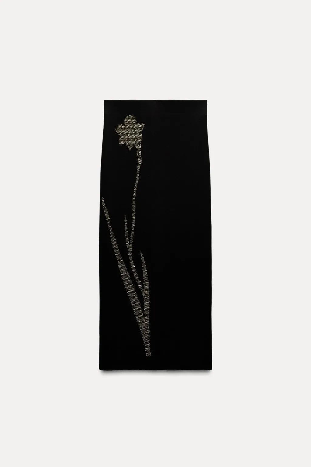 Falda midi confeccionada en tejido tipo punto. Tiro medio y cintura con elástico. Detalle de aplicación de brillos en delantero.