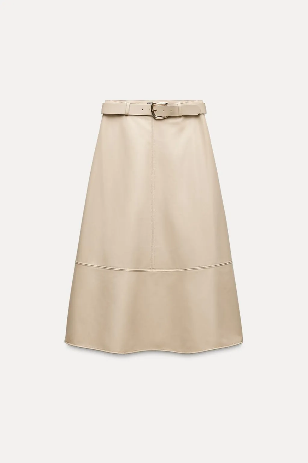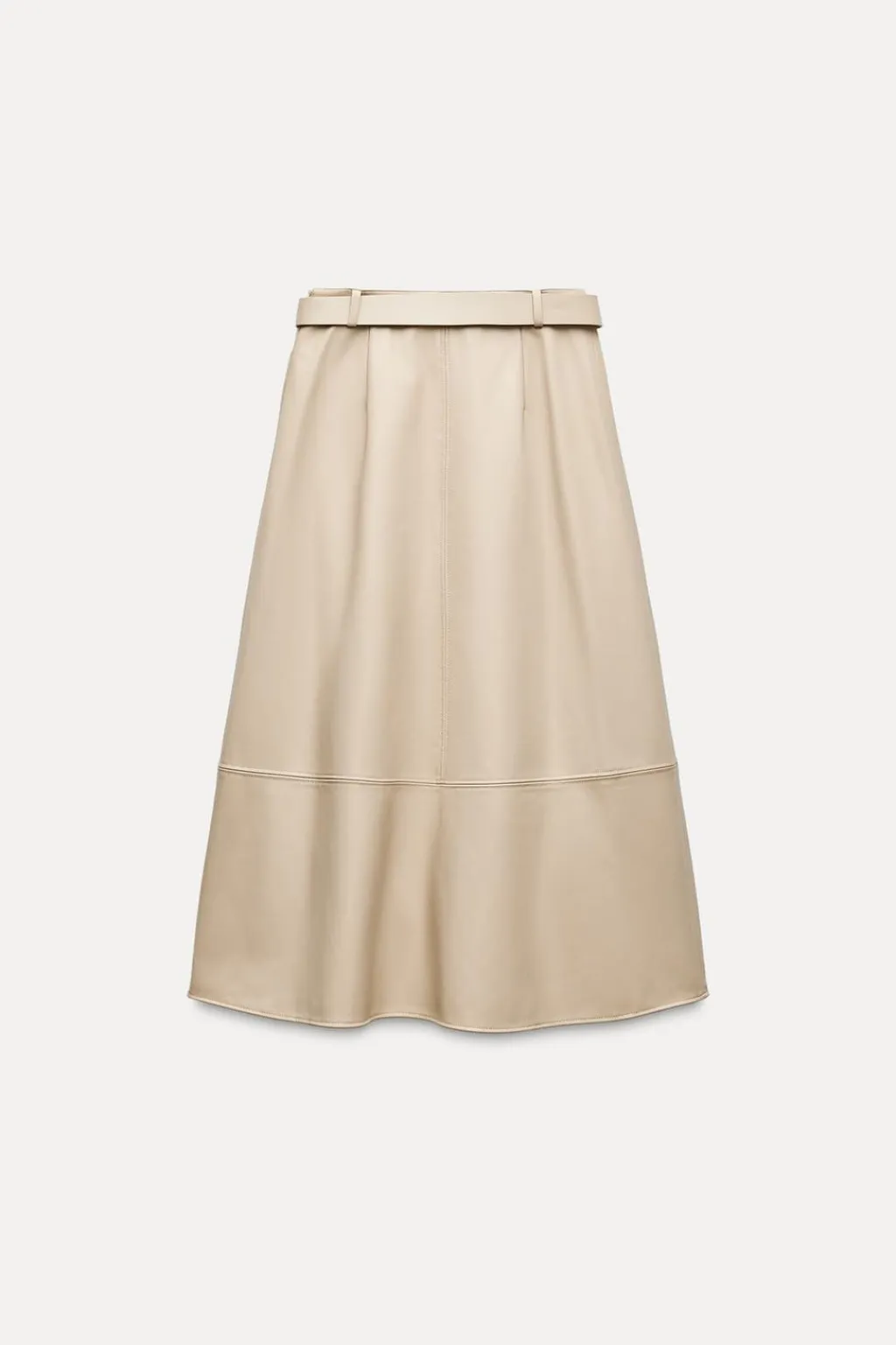 Falda de tiro alto con cinturón. Bajo en evasé. Cierre lateral con cremallera oculta en costura.