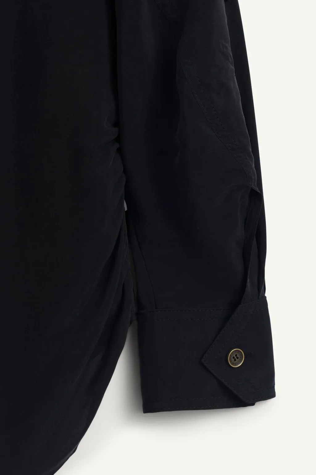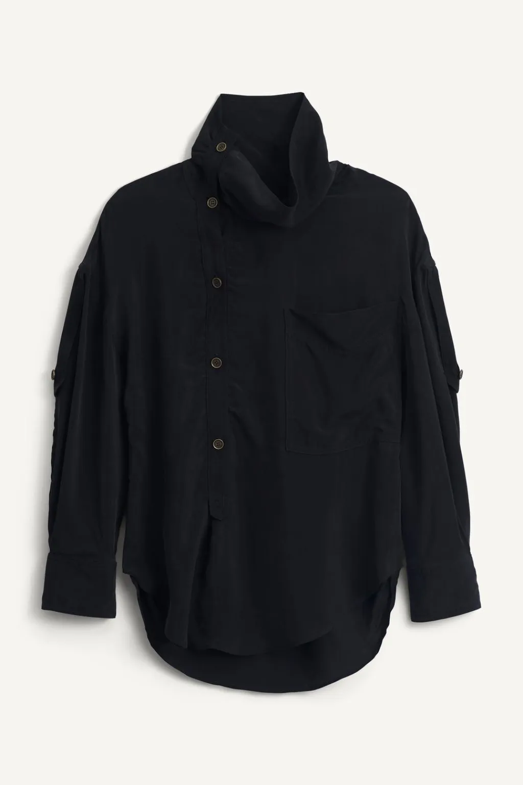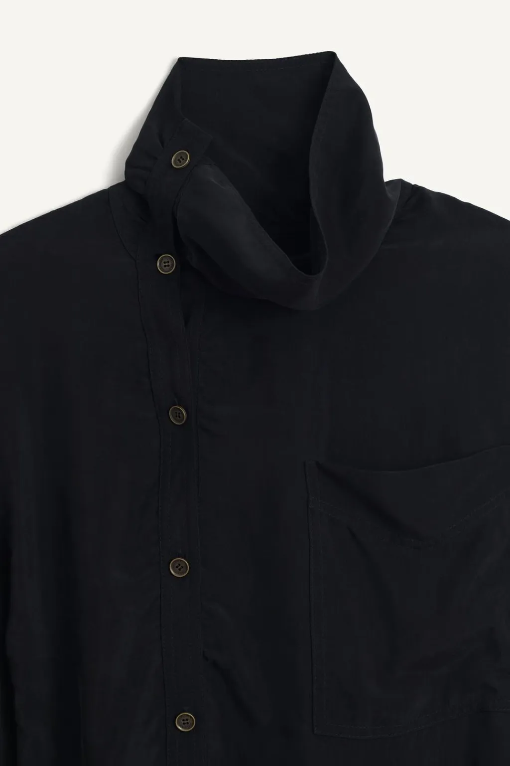Camisa de cuello alto confeccionada en hilatura de cupro. Manga larga acabada en puño ajustable con trabilla y botón. Bolsillo de plastrón en pecho. Detalle de pliegues en espalda. Bajo redondeado asimétrico. Cierre frontal con botones.