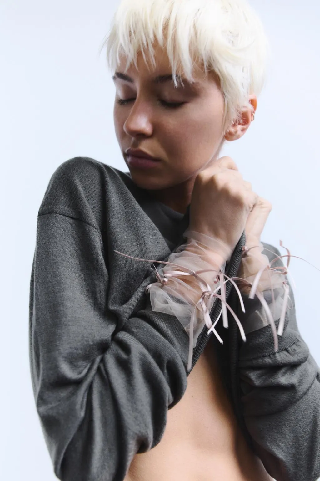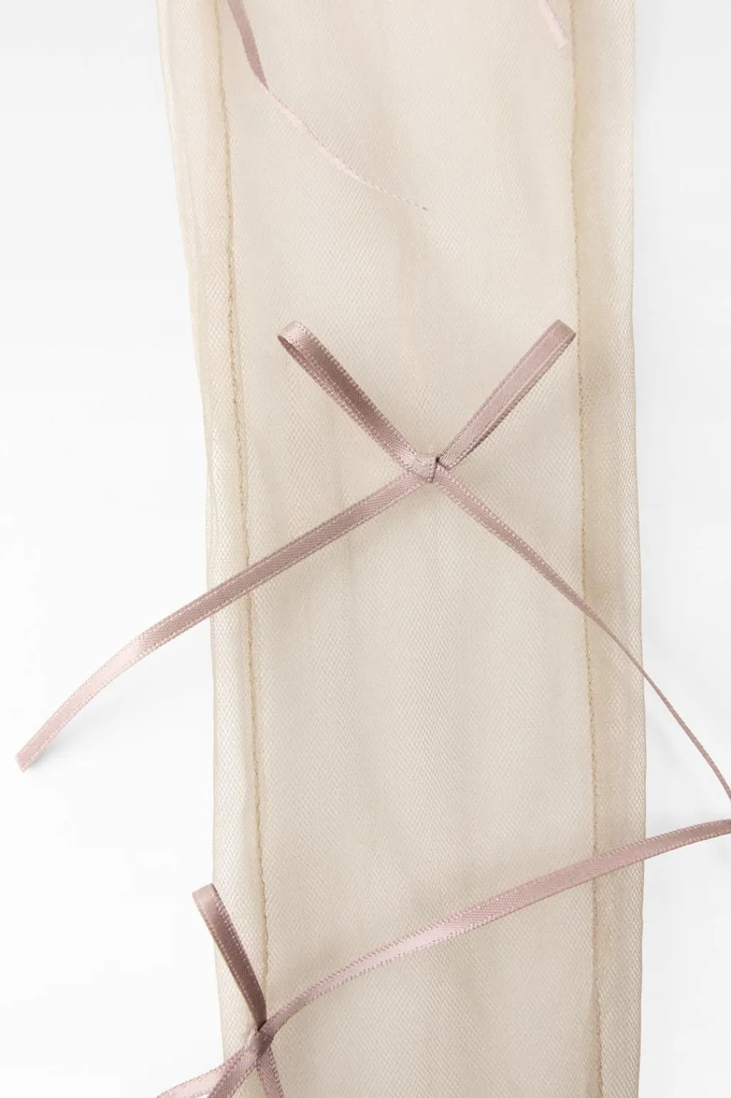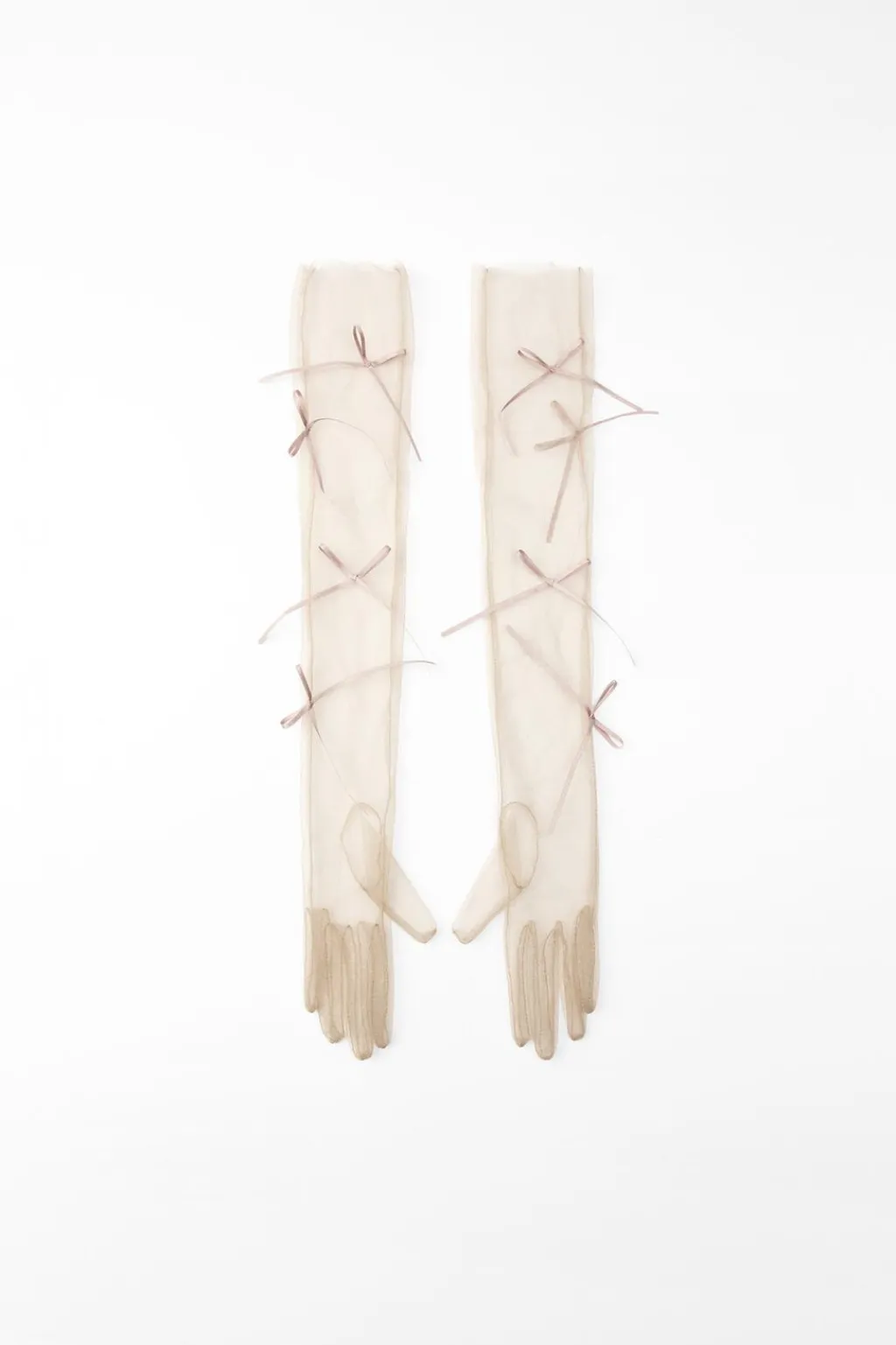 Guantes largos semitransparentes confeccionados en tejido de tul. Detalle aplicación de lazos combinados a tono.