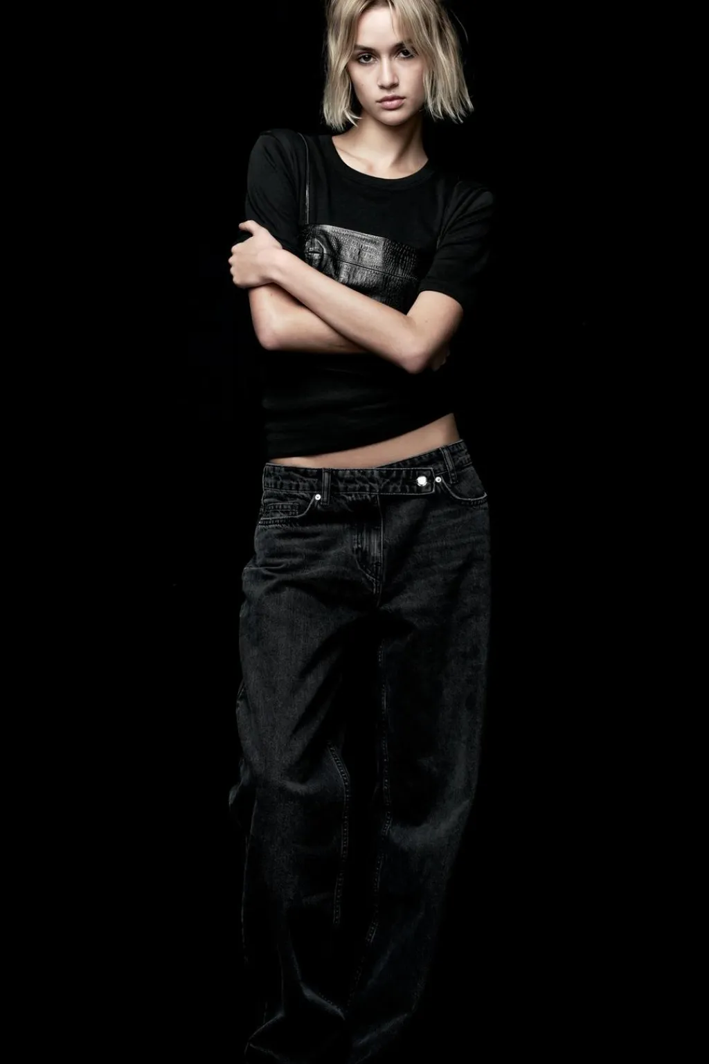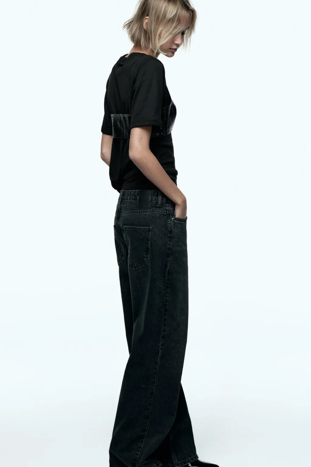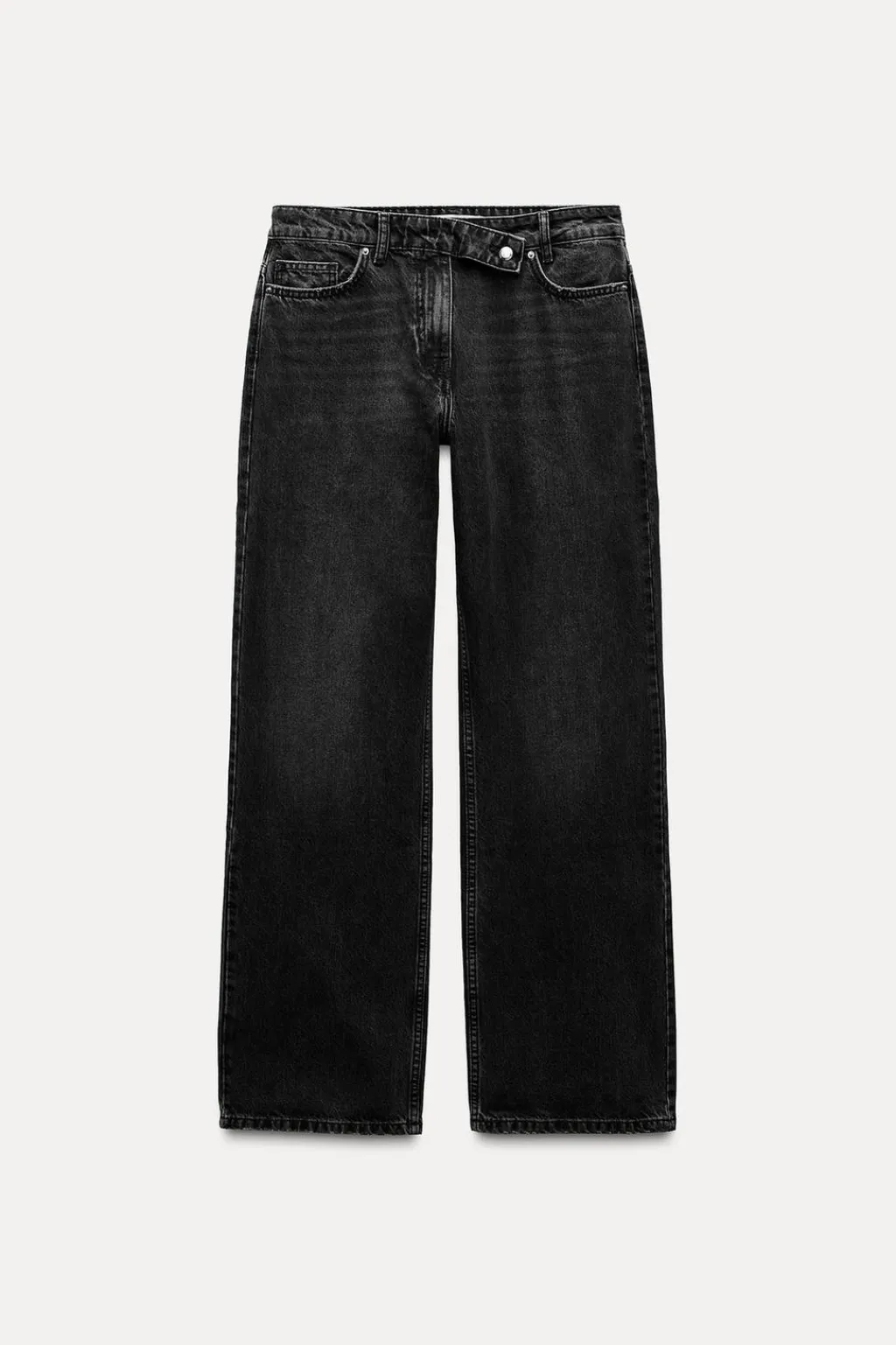 Jeans de tiro alto con cinco bolsillos. Efecto lavado. Pernera recta y larga. Cierre frontal con cremallera y botón.