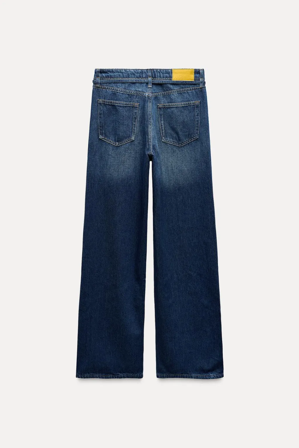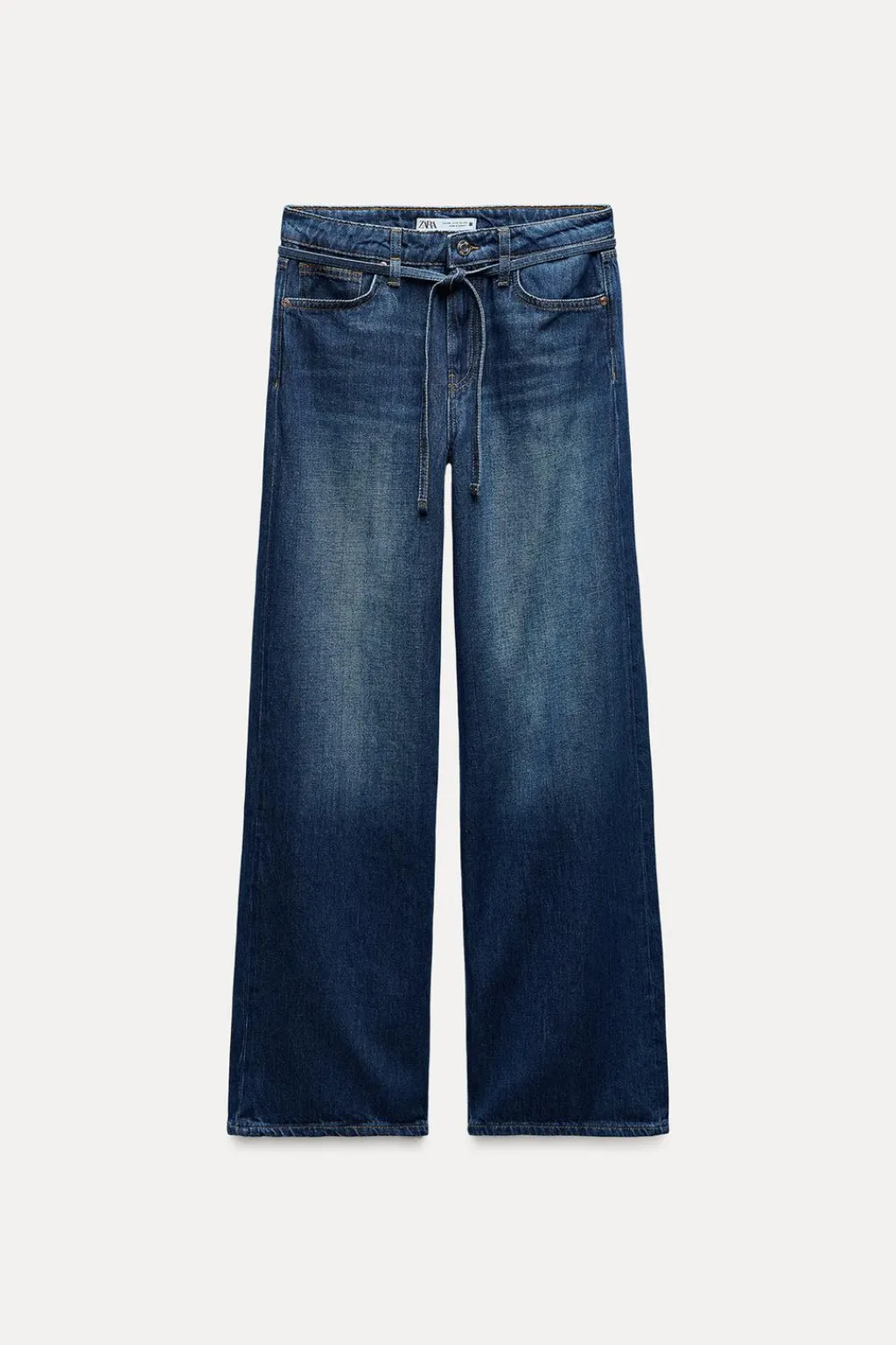 Jeans de tiro alto con cinturón fino del mismo tejido y cinco bolsillos. Efecto lavado. Pernera ancha. Cierre frontal con cremallera y botón.