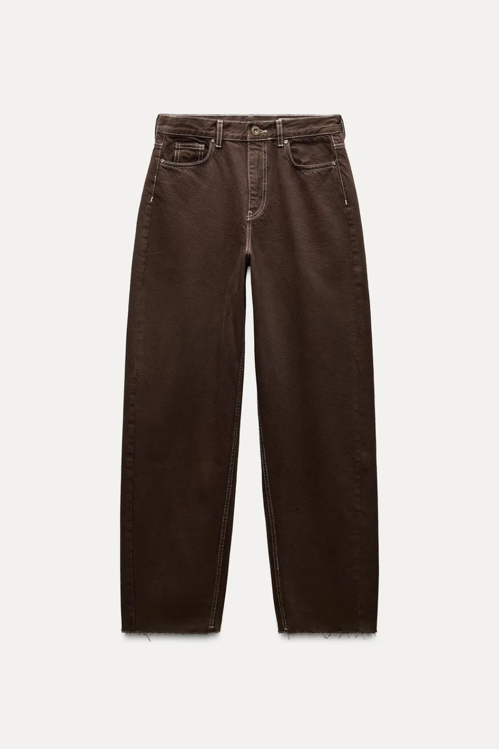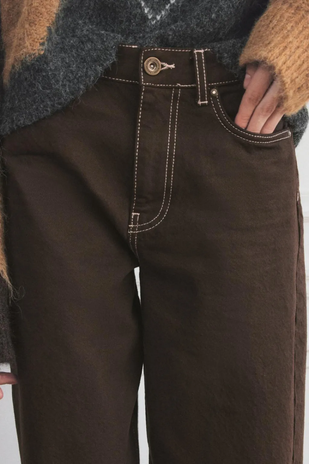 Jeans de tiro medio y cintura con trabillas. Cinco bolsillos. Detalle de pespuntes marcados a contraste. Bajo acabado sin costura. Cierre frontal con cremallera y botón.