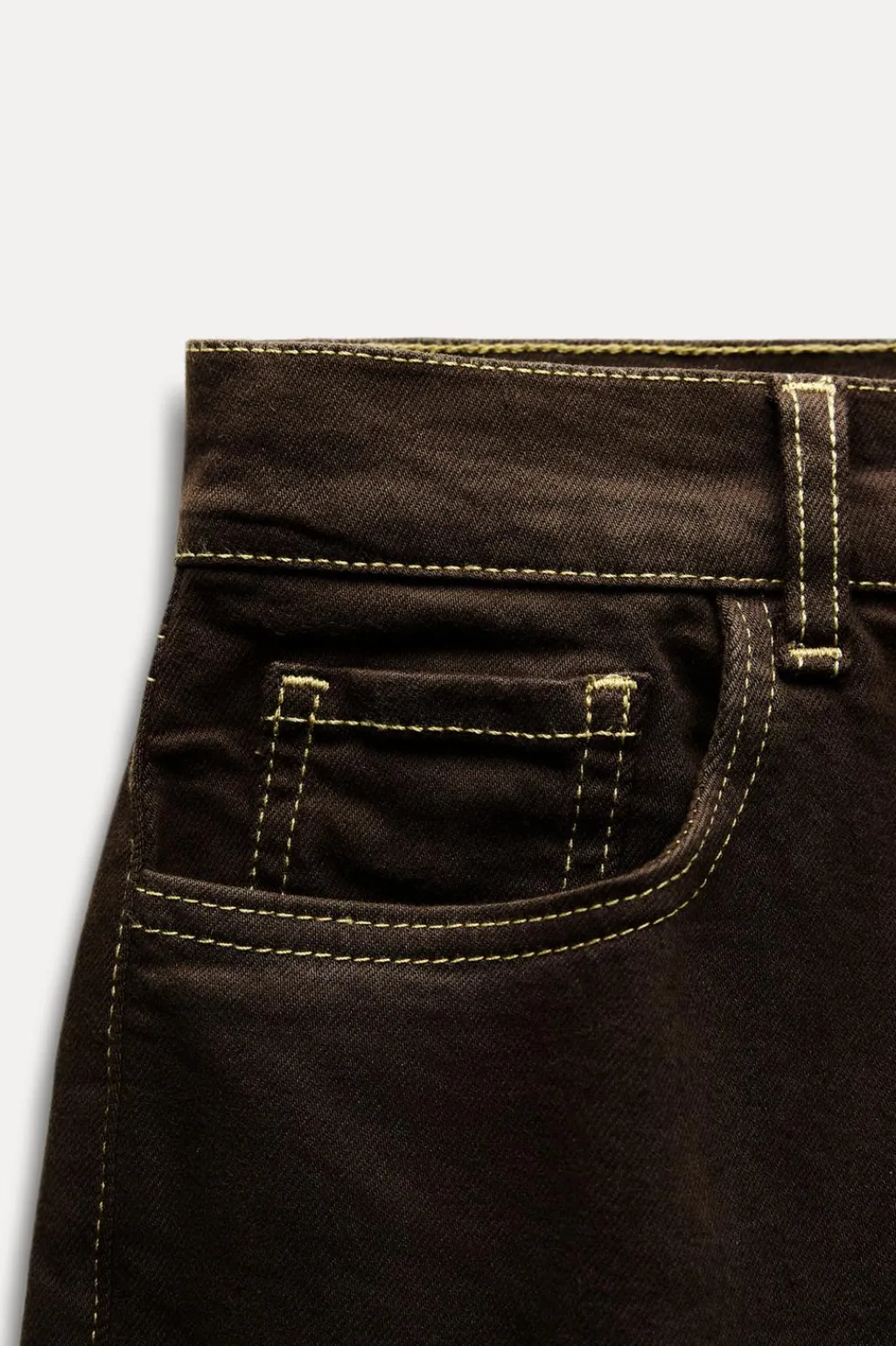 Jeans de tiro alto y cintura con trabillas. Cinco bolsillos. Detalle de pespuntes marcados a contraste. Cierre frontal con cremallera y botón.