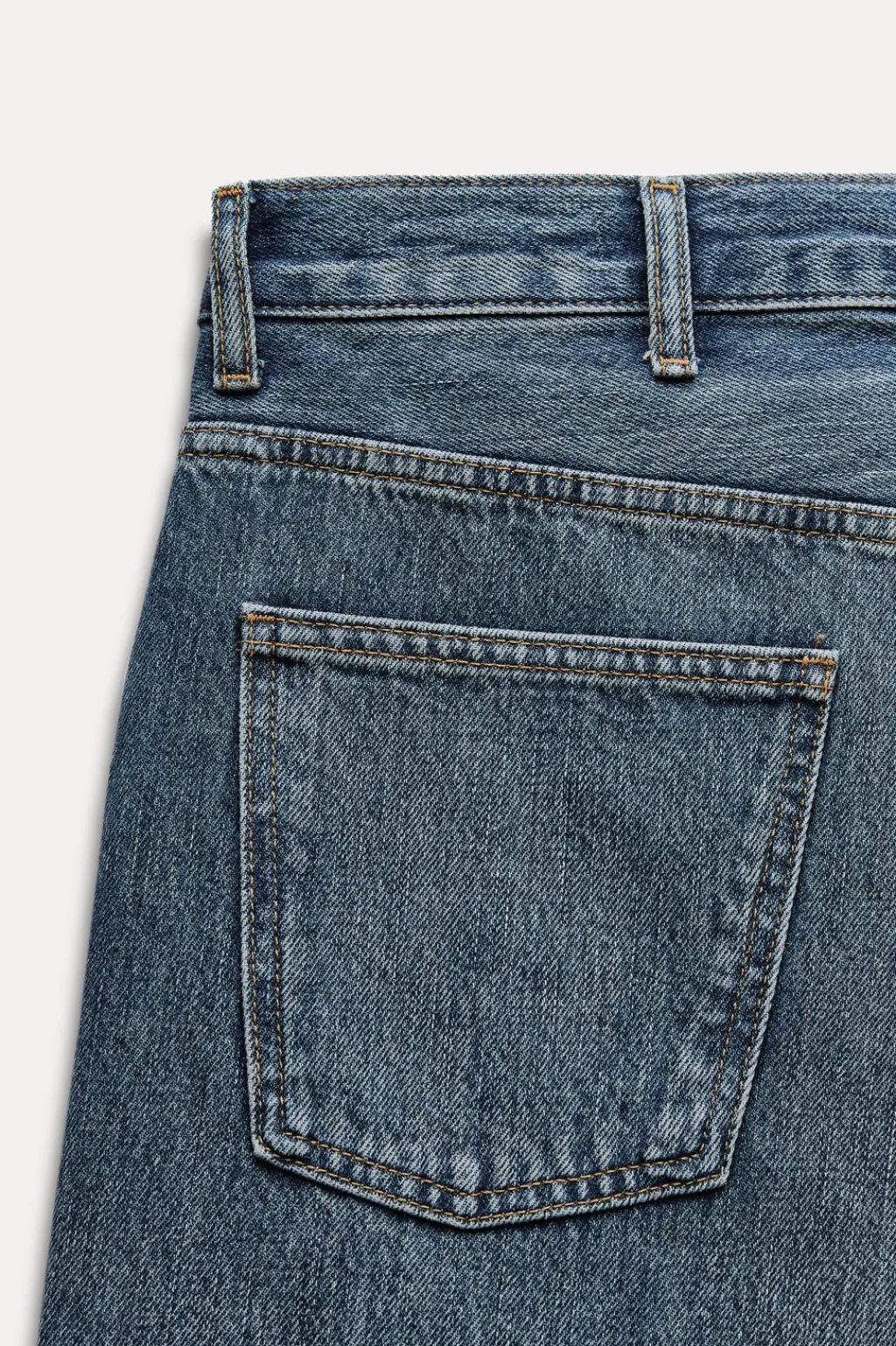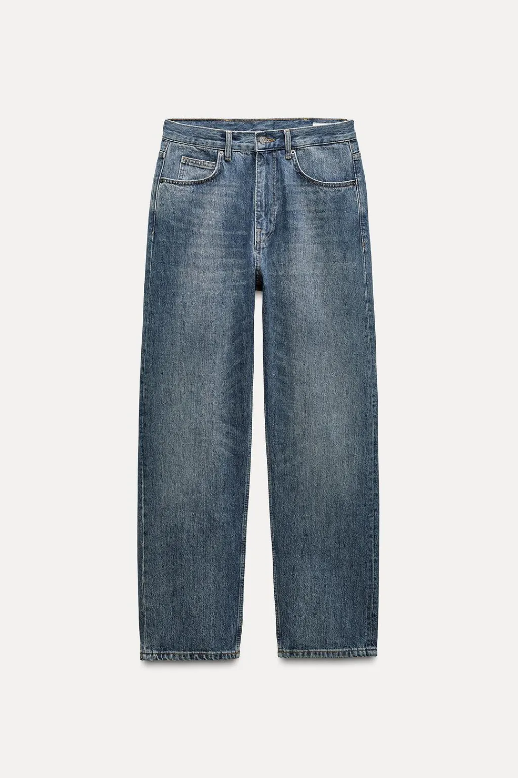 Jeans de tiro medio y cintura con trabillas. Cinco bolsillos. Efecto lavado. Cierre frontal con cremallera y botón.