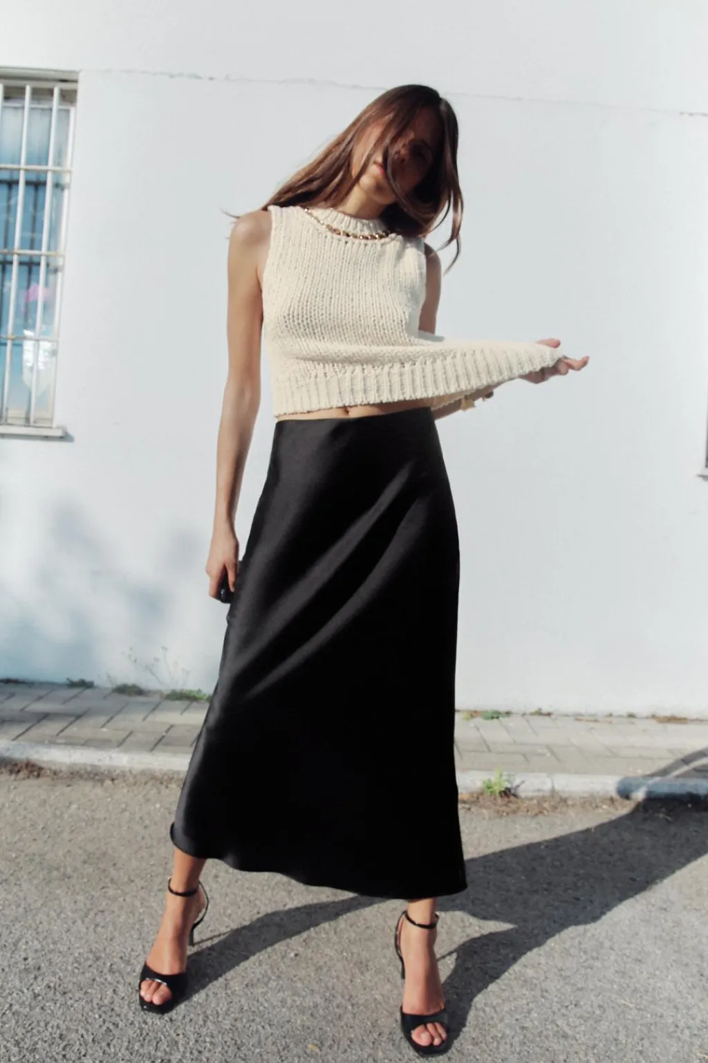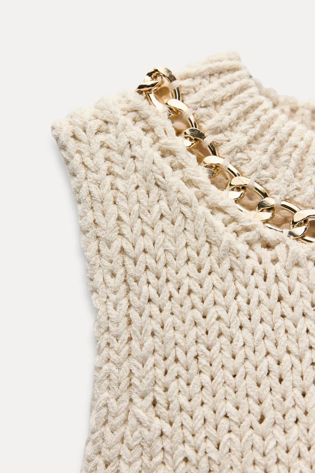 Jersey chaleco de cuello redondo con cadena dorada y manga sisa. Acabados en rib. Bajo asimétrico.