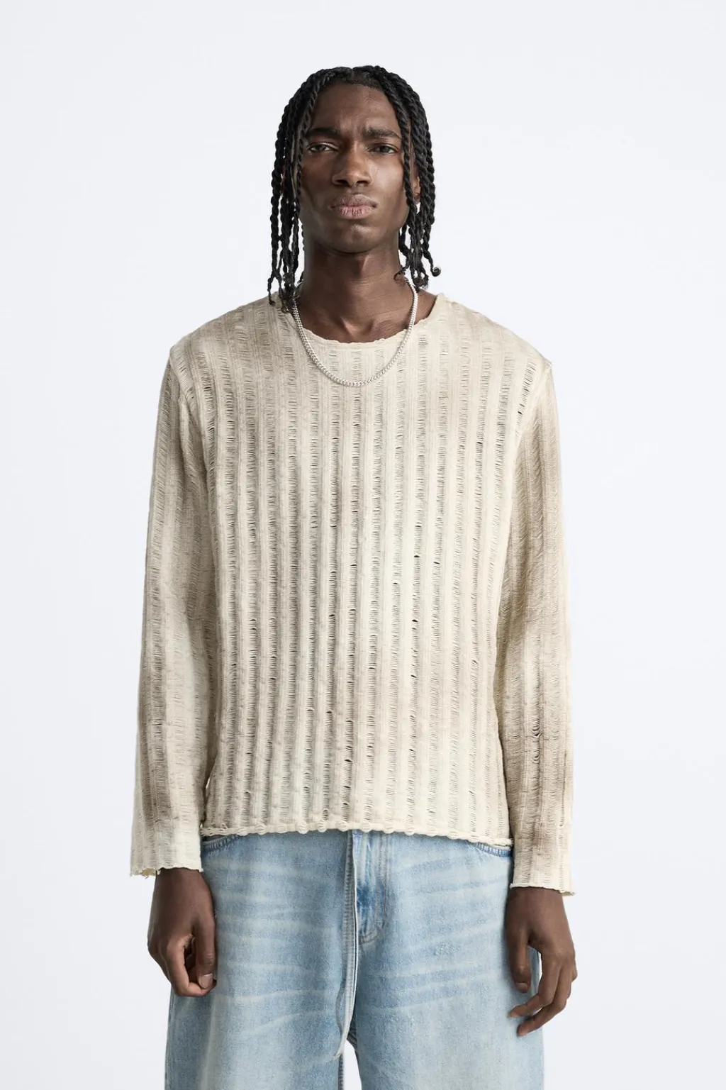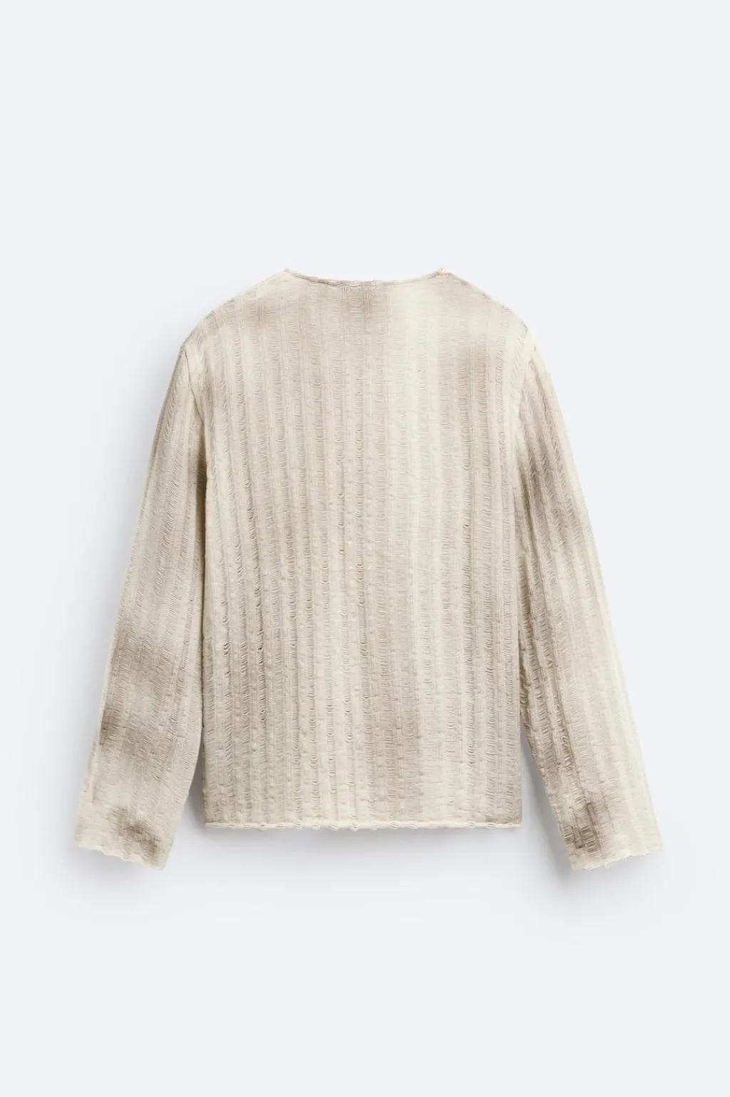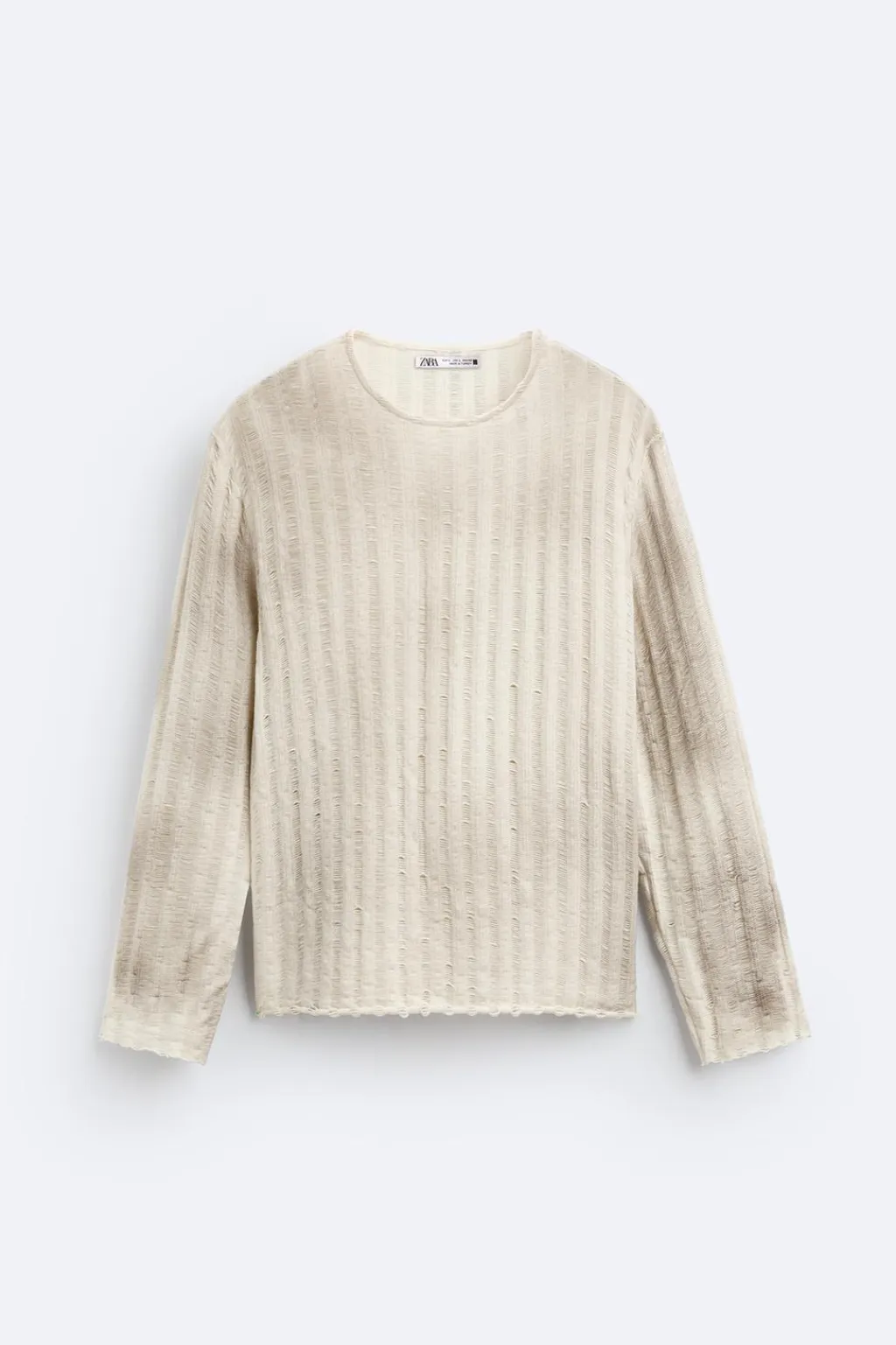 Jersey tejido en hilatura de algodón con elasticidad. Cuello redondo y manga larga. Estampación efecto spray irregular en toda la prenda.