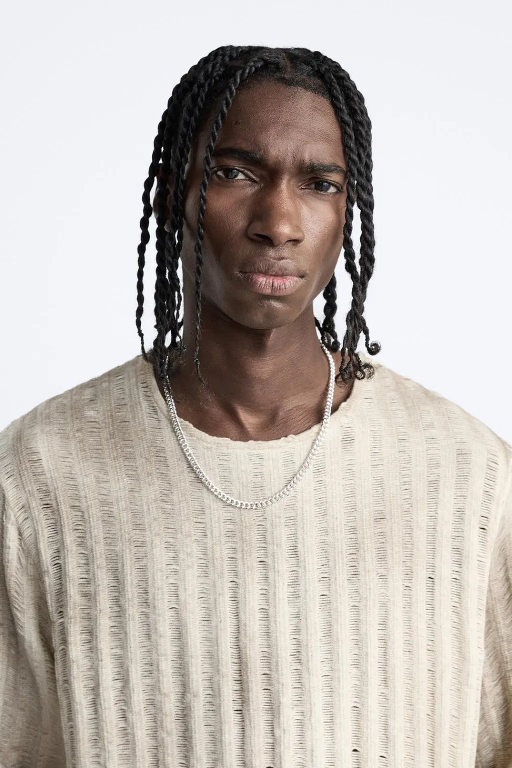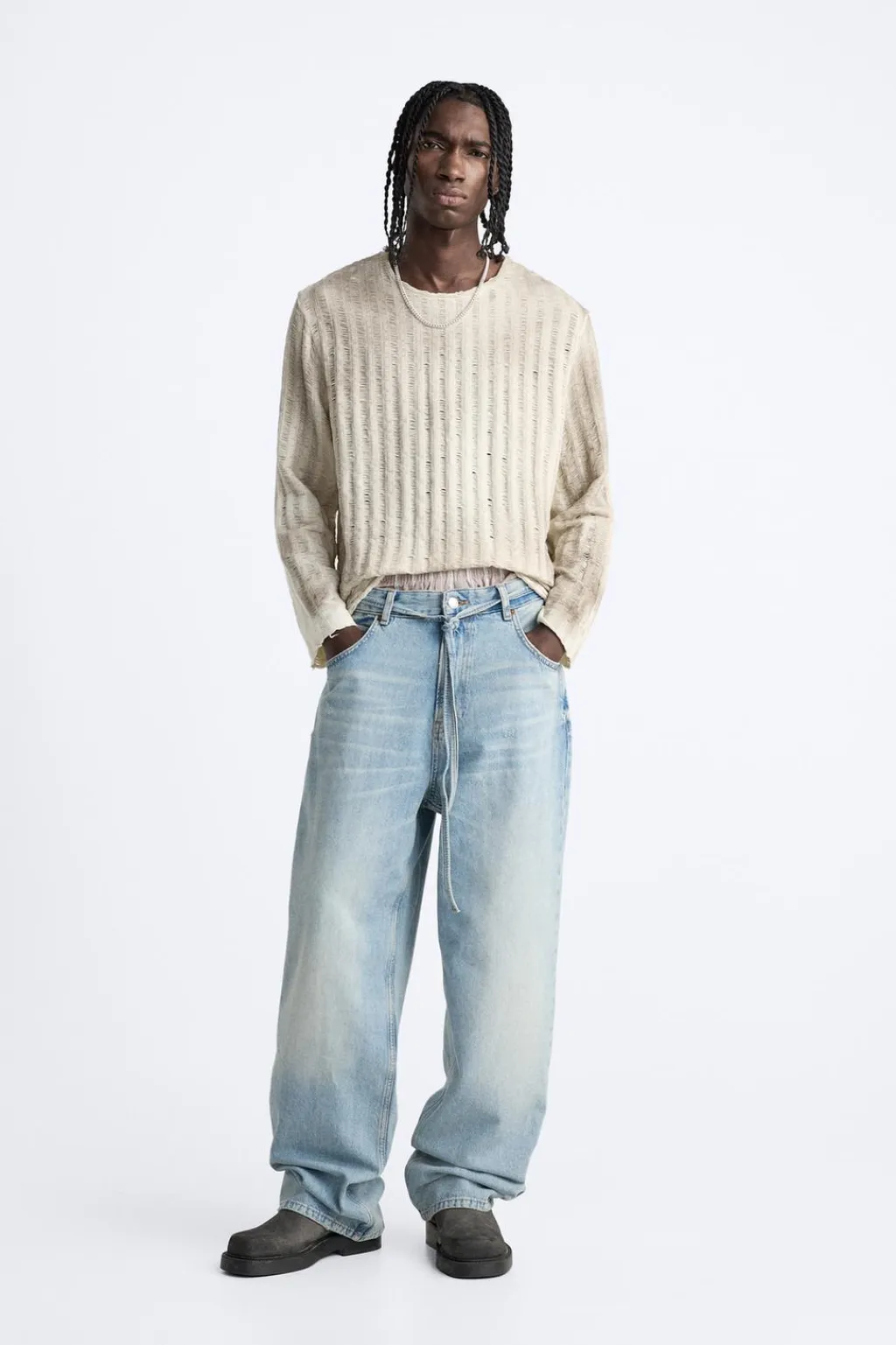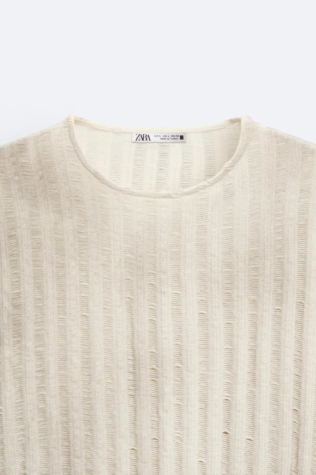 Jersey tejido en hilatura de algodón con elasticidad. Cuello redondo y manga larga. Estampación efecto spray irregular en toda la prenda.