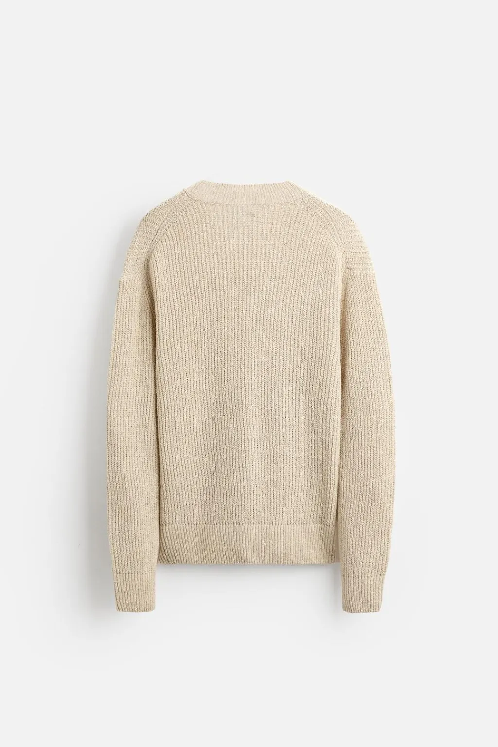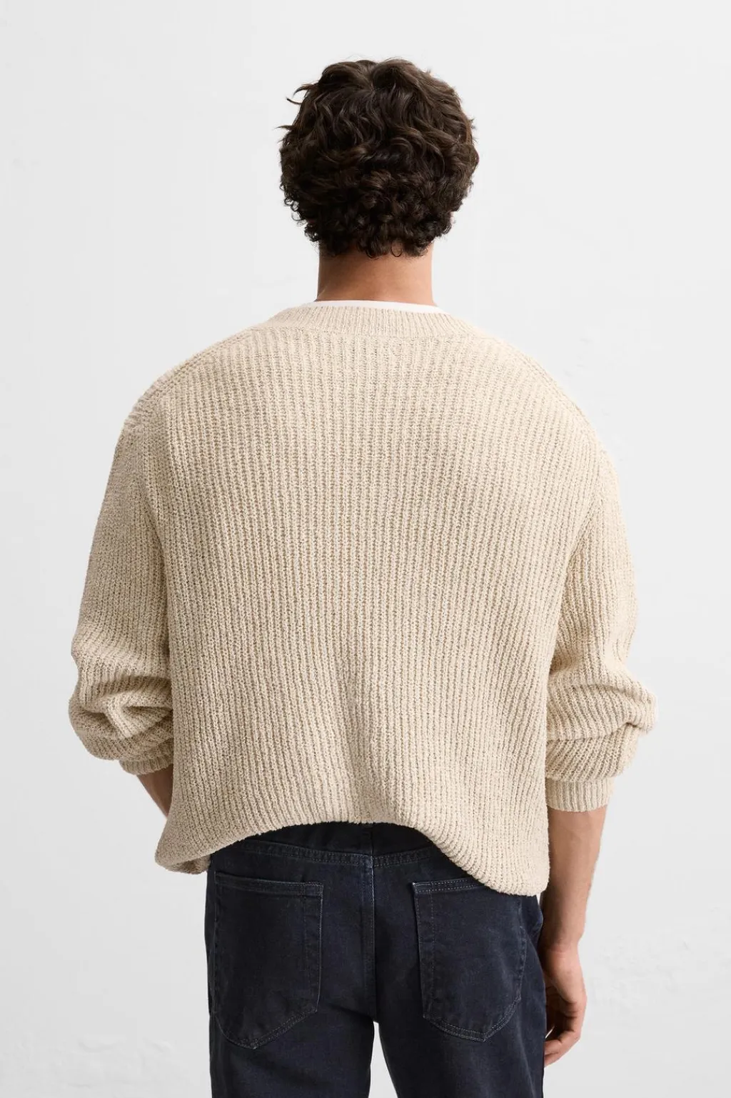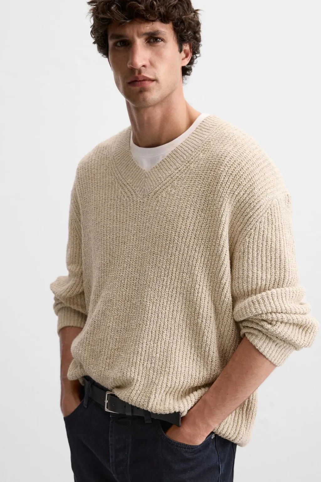 Jersey relaxed fit tejido en hilatura con mezcla de algodón. Cuello pico y manga larga. Acabados en rib.
