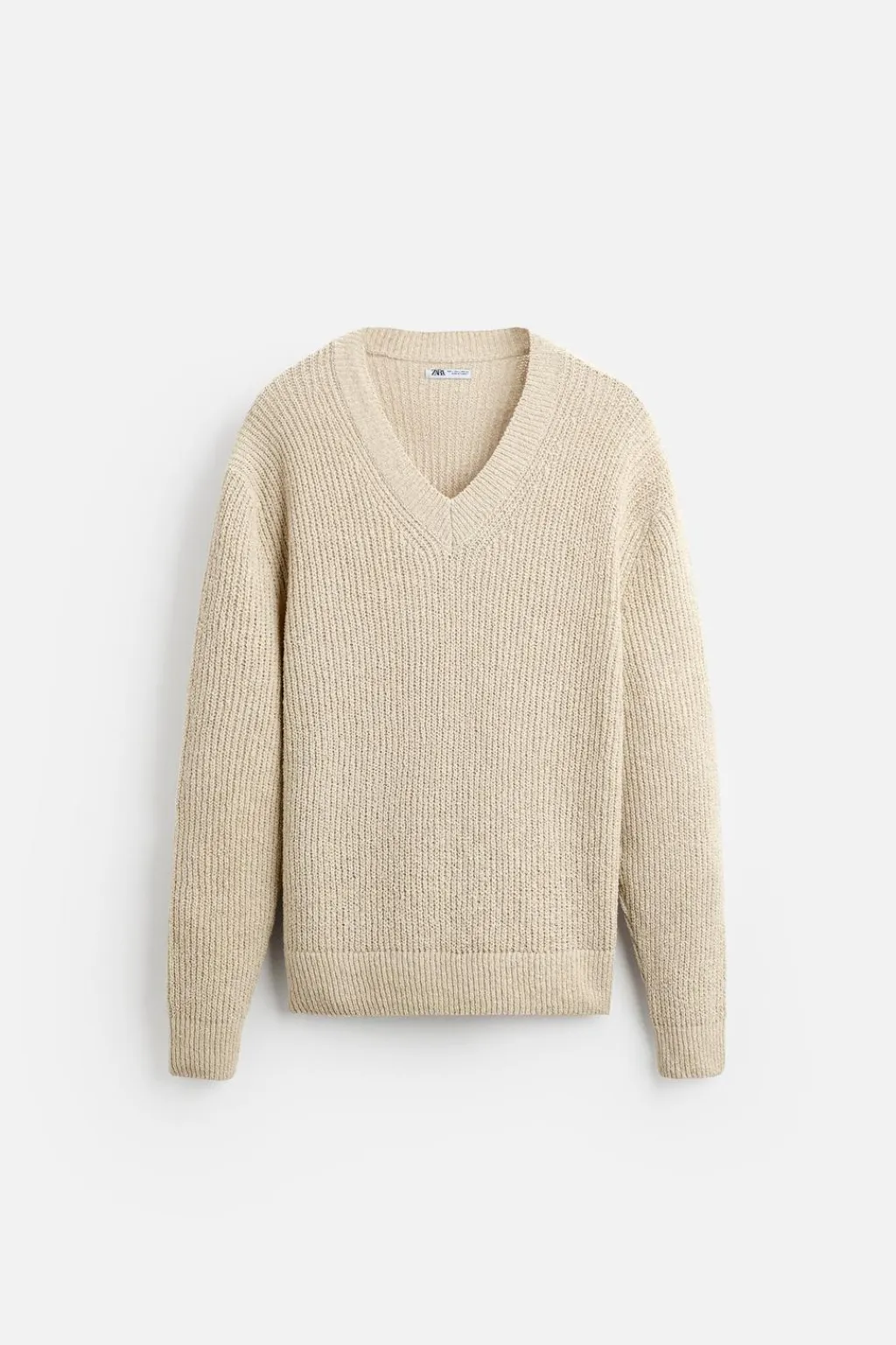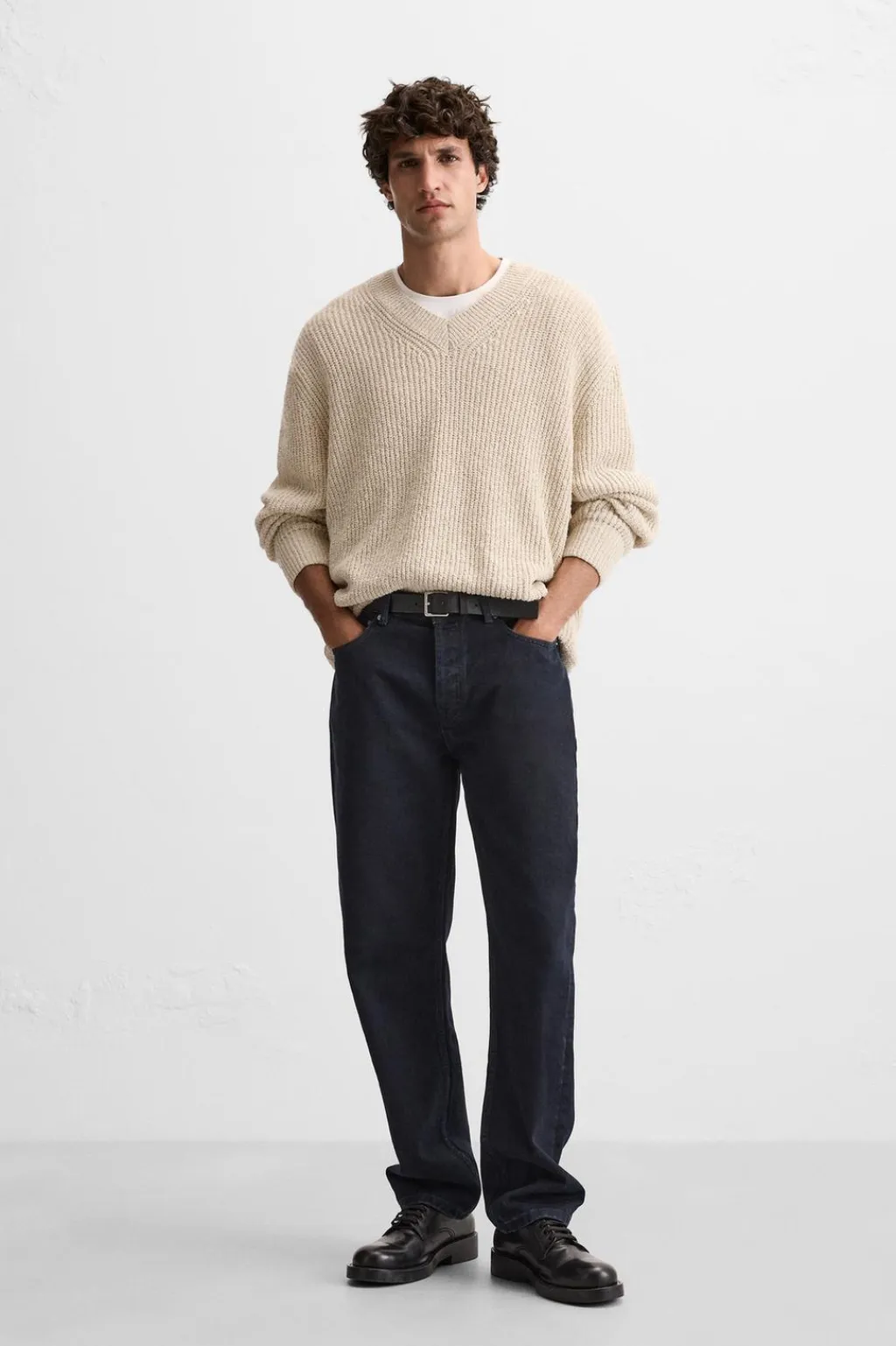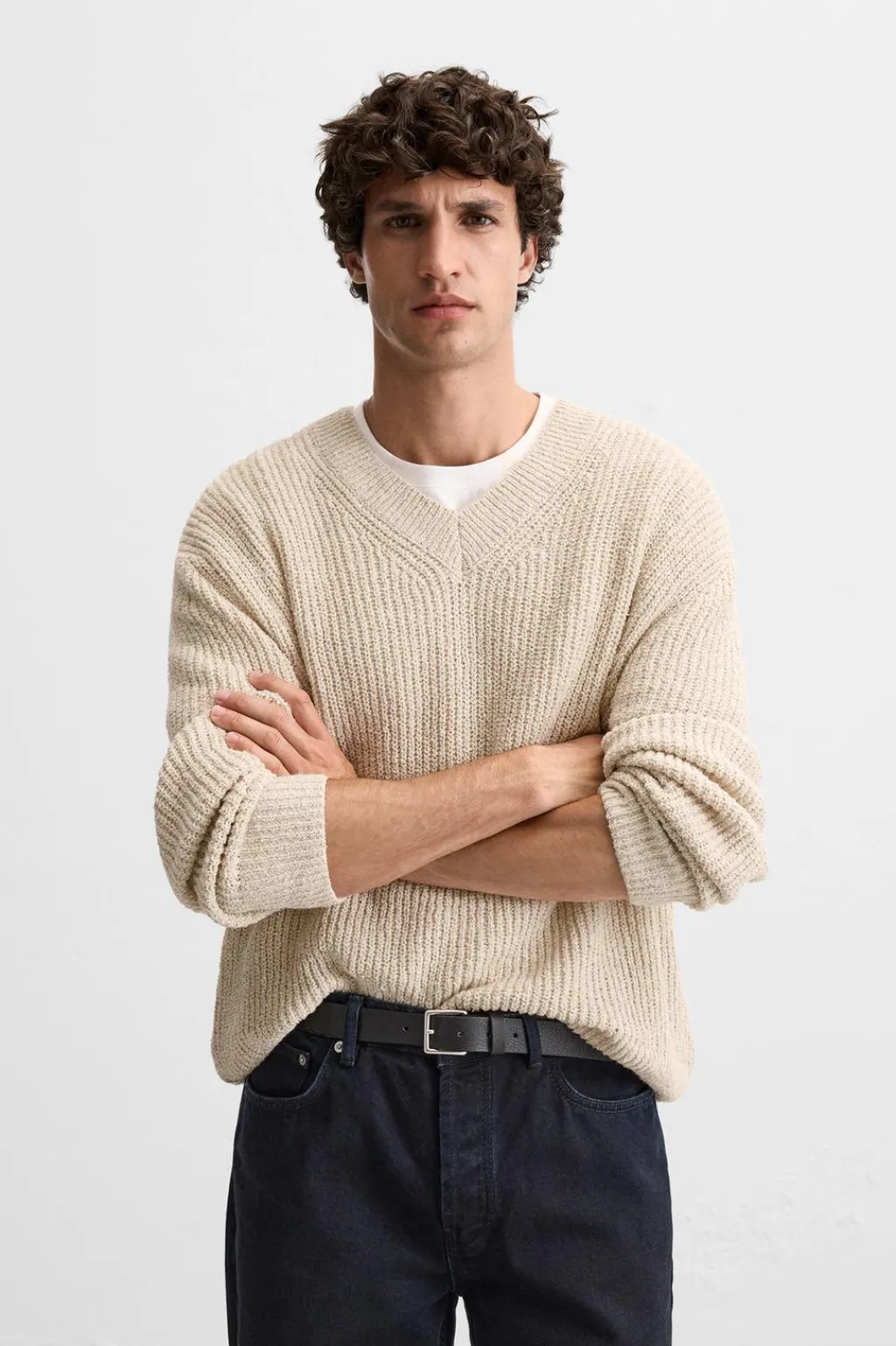 Jersey relaxed fit tejido en hilatura con mezcla de algodón. Cuello pico y manga larga. Acabados en rib.