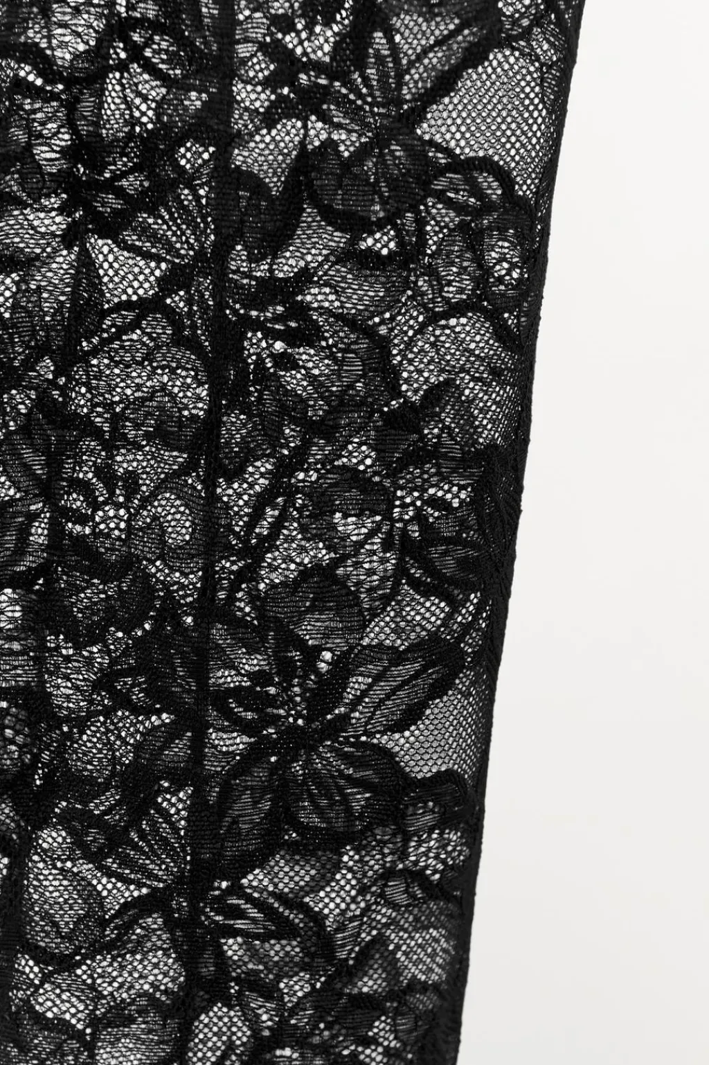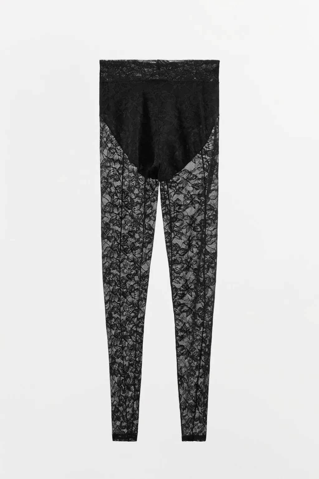Leggings semitransparente confeccionado en encaje suave. Tiro alto y cintura elástica. Forro interior combinado a tono.