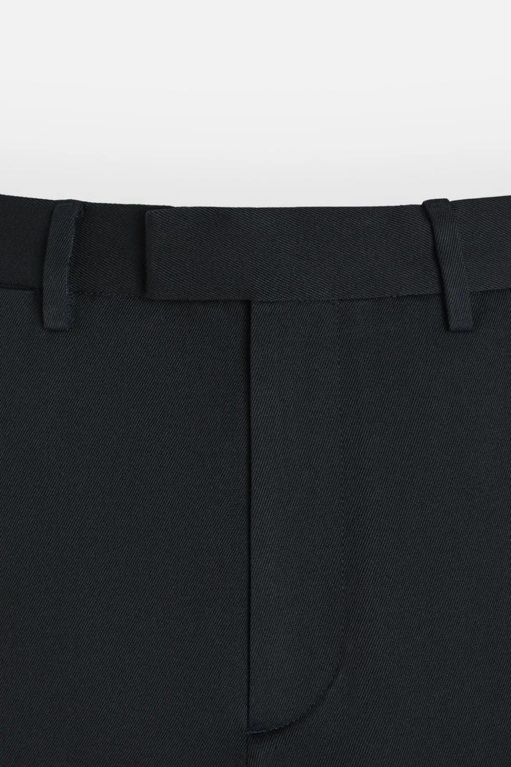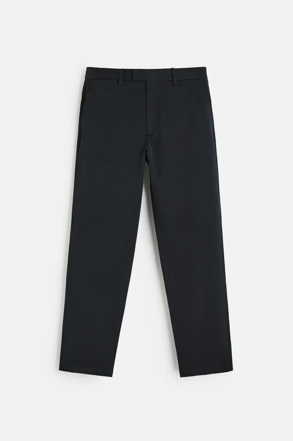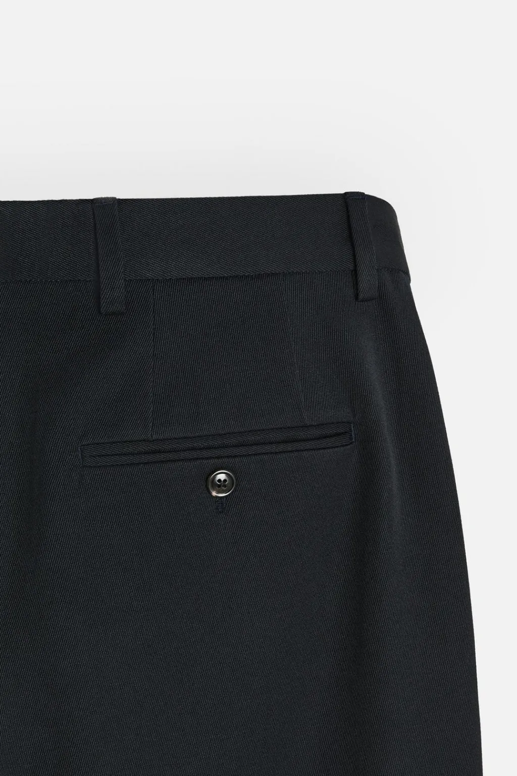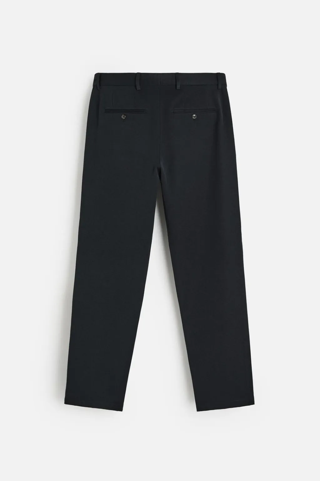 Pantalón regular fit confeccionado en tejido con mezcla de algodón y lana. Bolsillos frontales y detalle de bolsillos traseros de doble vivo con botón. Cierre frontal con cremallera y gancho metálico oculto cruzado.