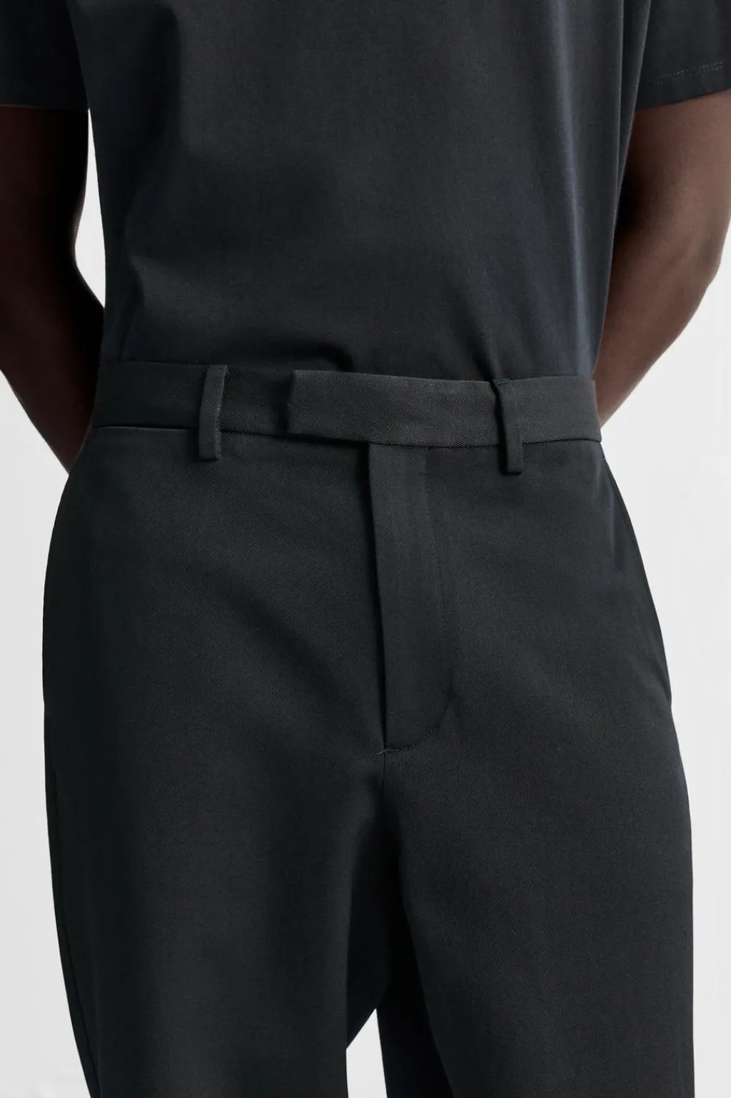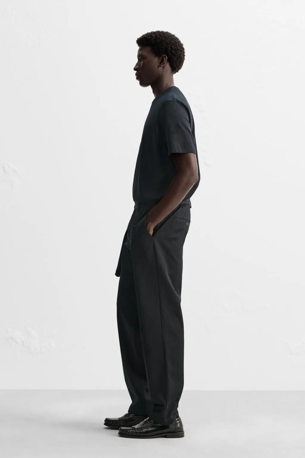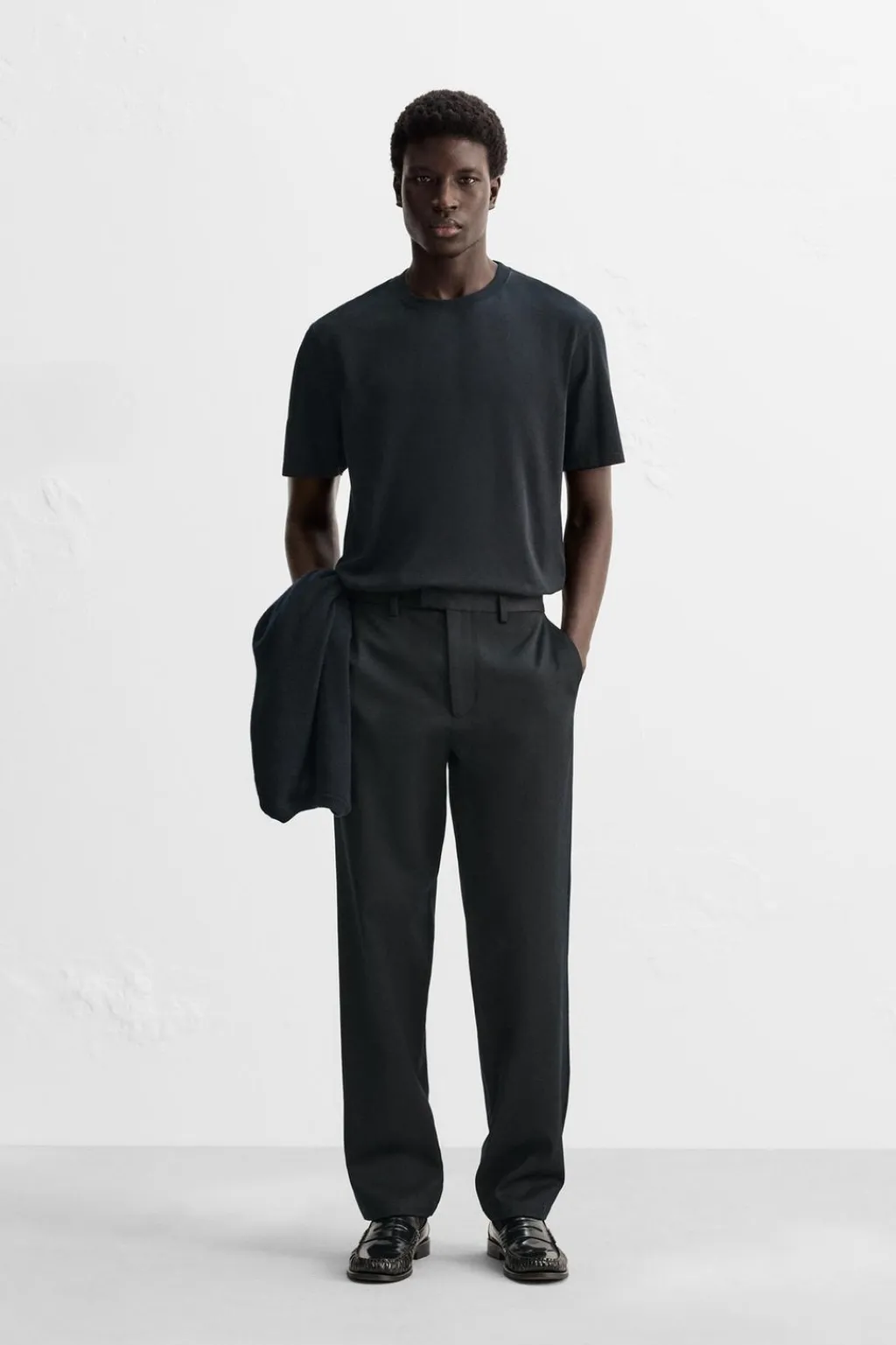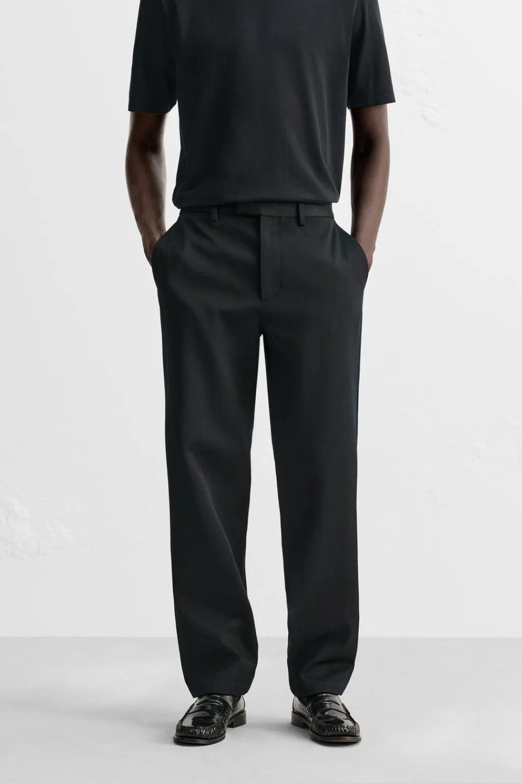 Pantalón regular fit confeccionado en tejido con mezcla de algodón y lana. Bolsillos frontales y detalle de bolsillos traseros de doble vivo con botón. Cierre frontal con cremallera y gancho metálico oculto cruzado.