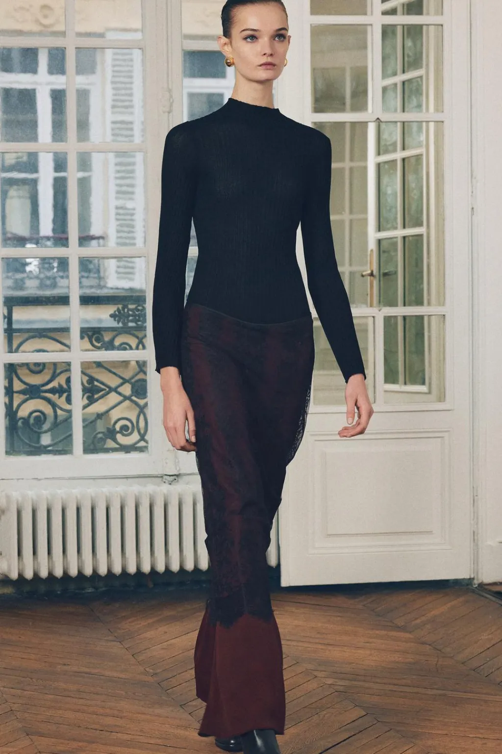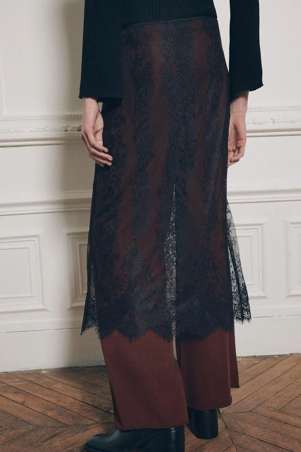 Pantalón de tiro alto con cintura elástica y pernera ancha. Detalle de tejido combinado con encaje.