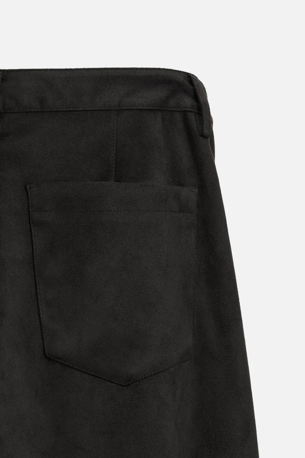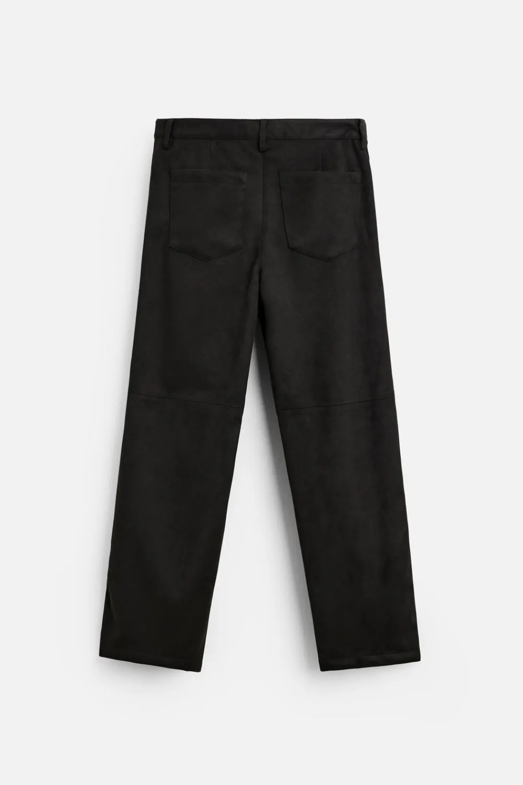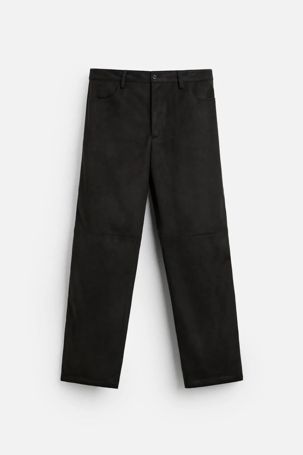 Pantalón regular fit confeccionado en tejido efecto ante. Bolsillos delanteros y detalle de bolsillos traseros de plastrón. Cierre frontal con cremallera y botón.