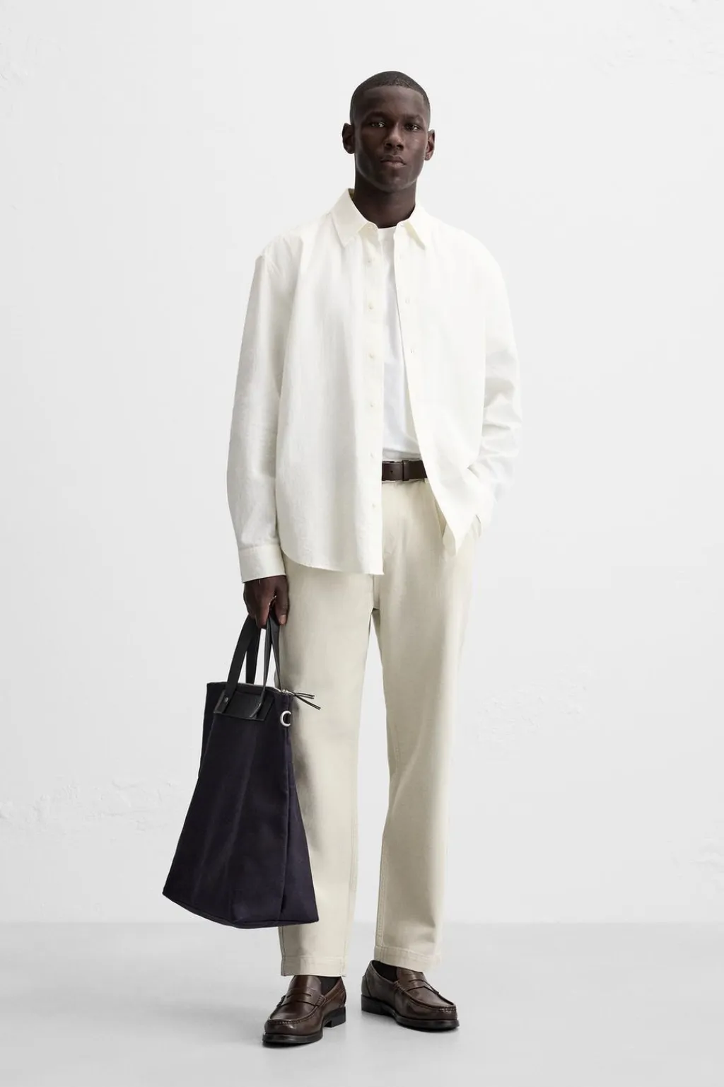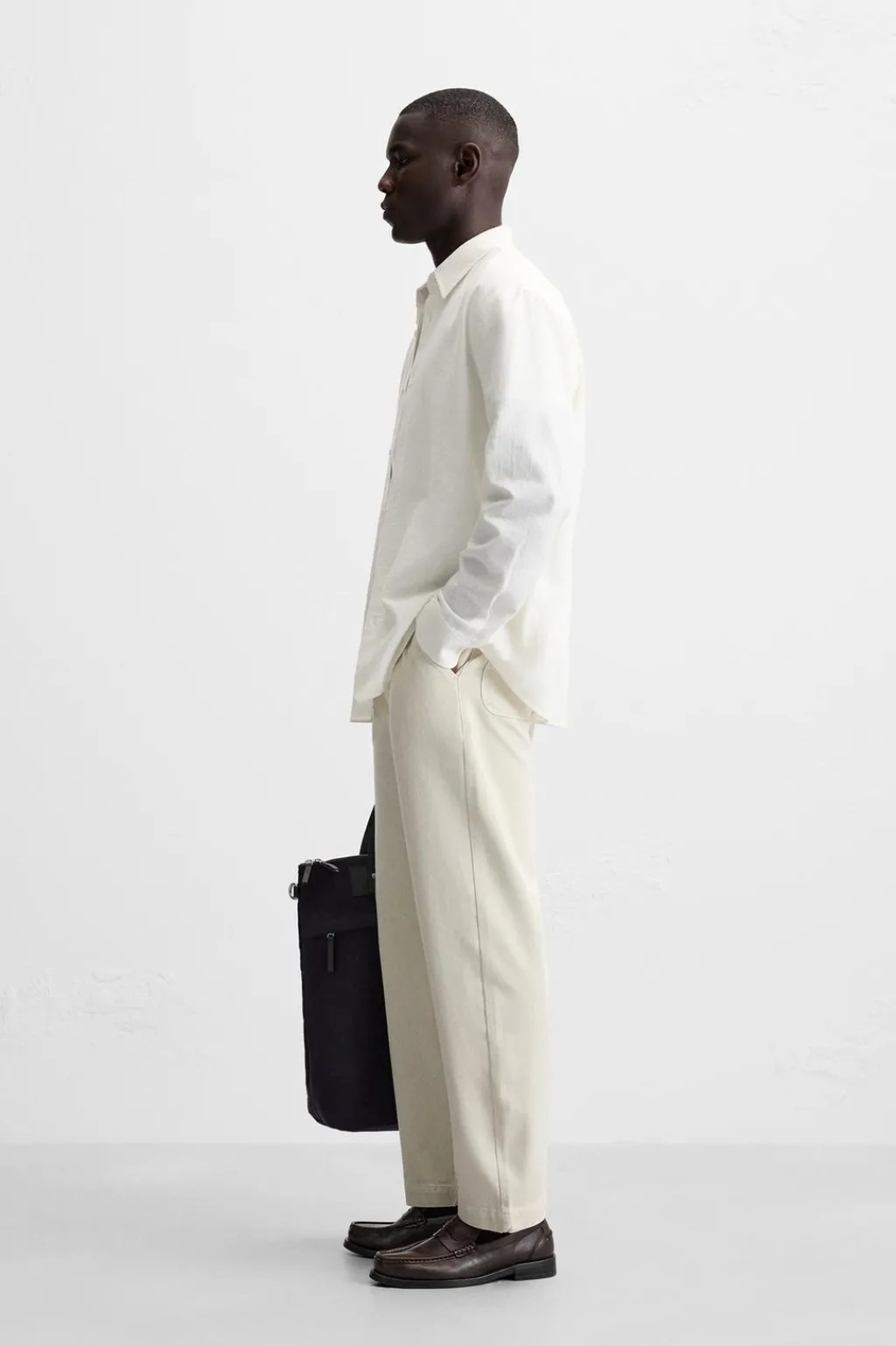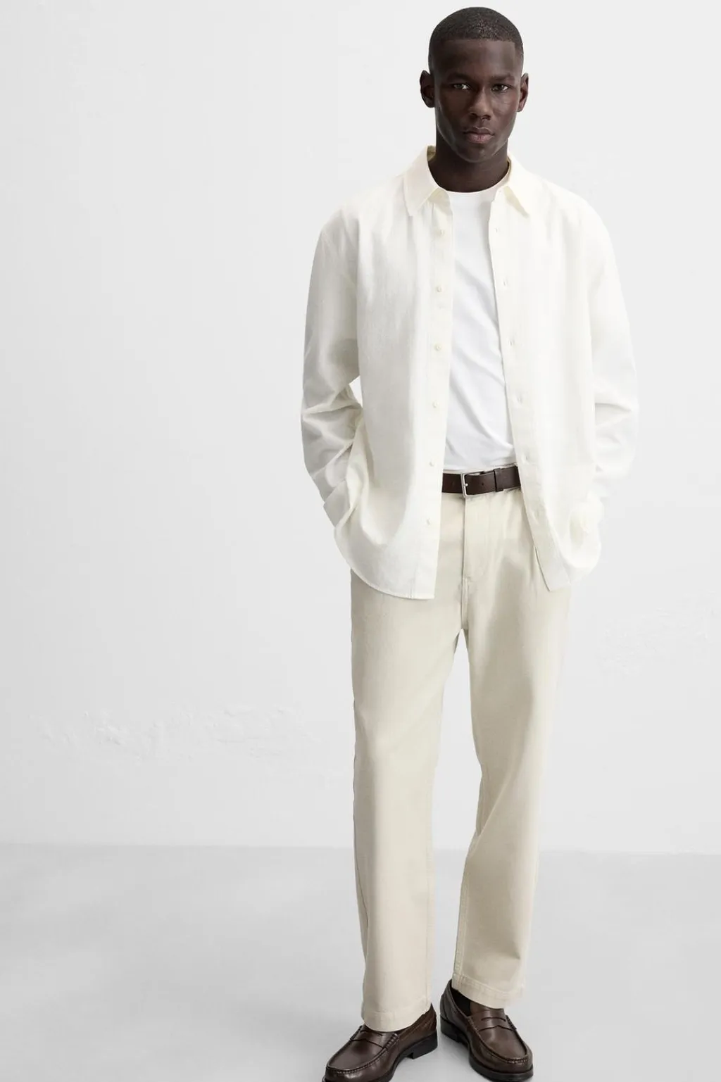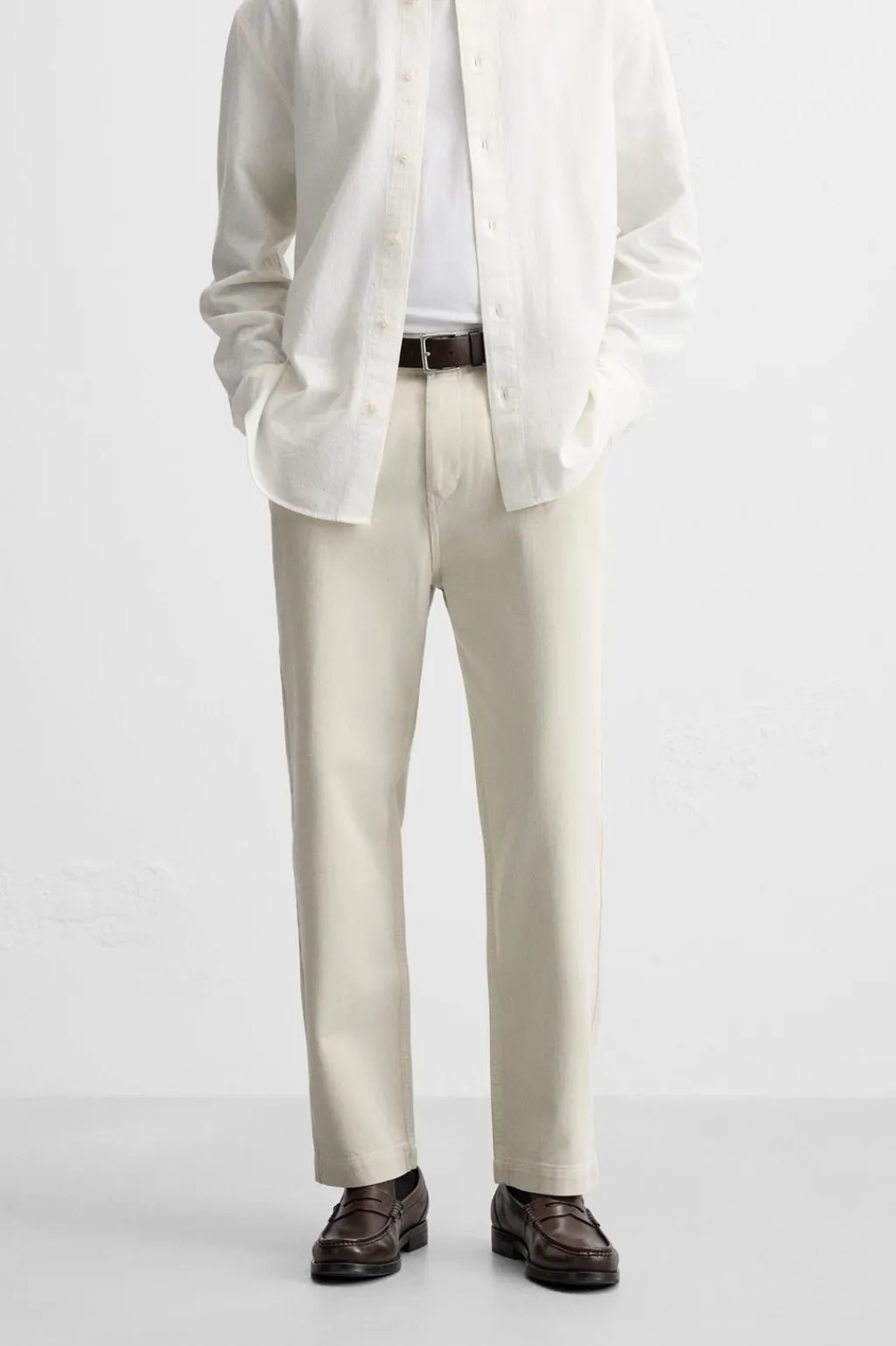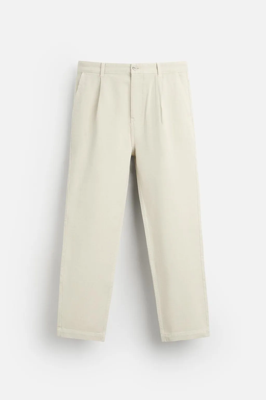 Pantalón regular fit confeccionado en tejido de algodón. Cintura con detalle de pliegues frontales. Bolsillos laterales y detalle de bolsillos traseros. Cierre frontal con cremallera y botón.