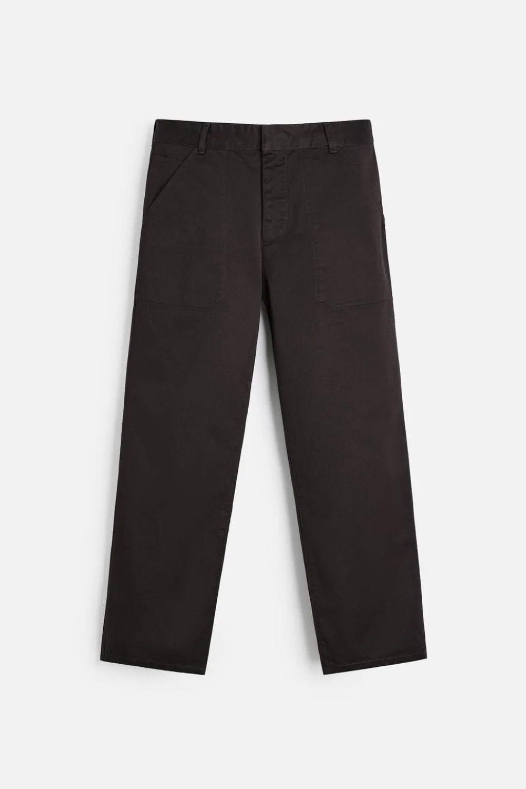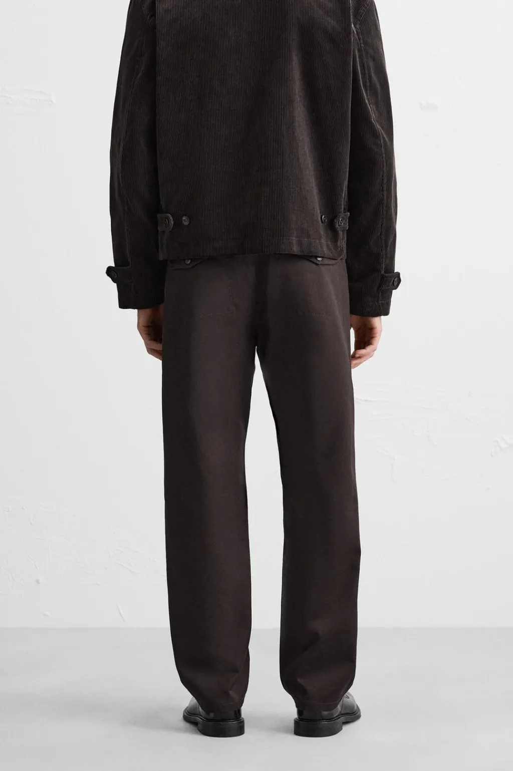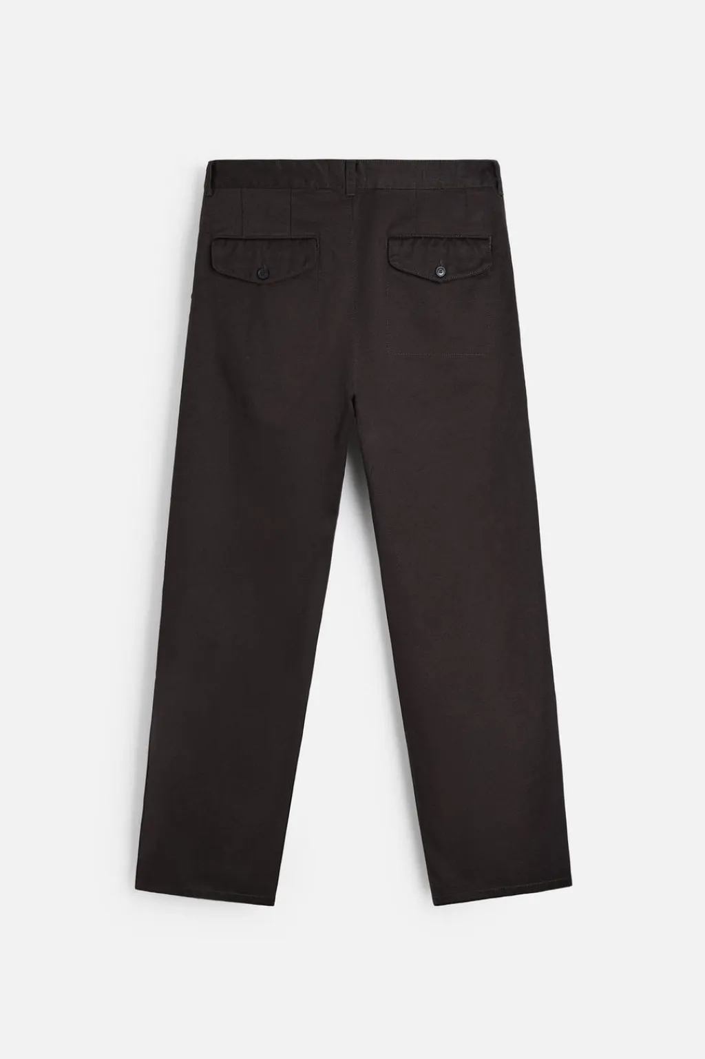 Pantalón relaxed fit confeccionado en tejido de algodón con estructura diagonal. Tiro alto. Bolsillos en delantero y detalle de bolsillos traseros de solapa con botón. Cierre frontal con cremallera y gancho metálico oculto.