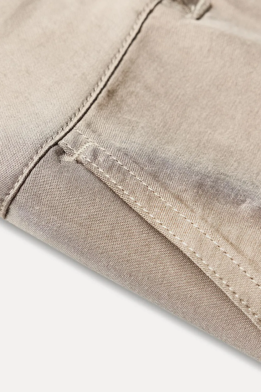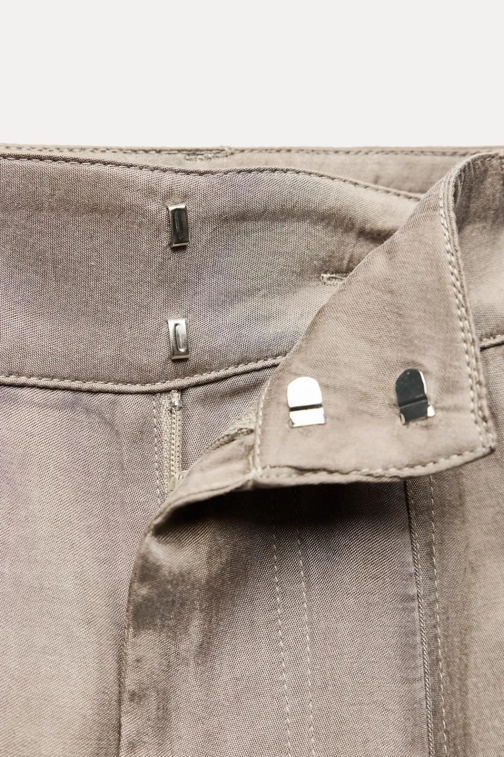 Pantalón confeccionado en tejido fluido de tiro alto con trabillas. Bolsillos de plastrón en delantero y espalda. Cierre frontal con cremallera y ganchos metálicos.