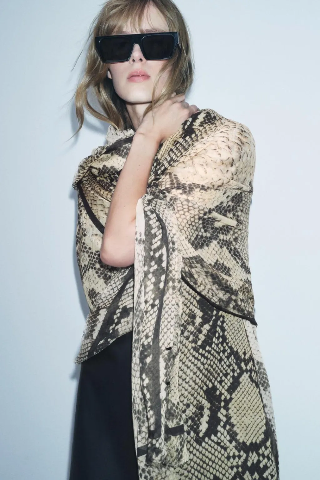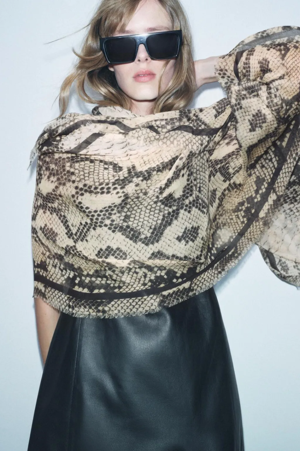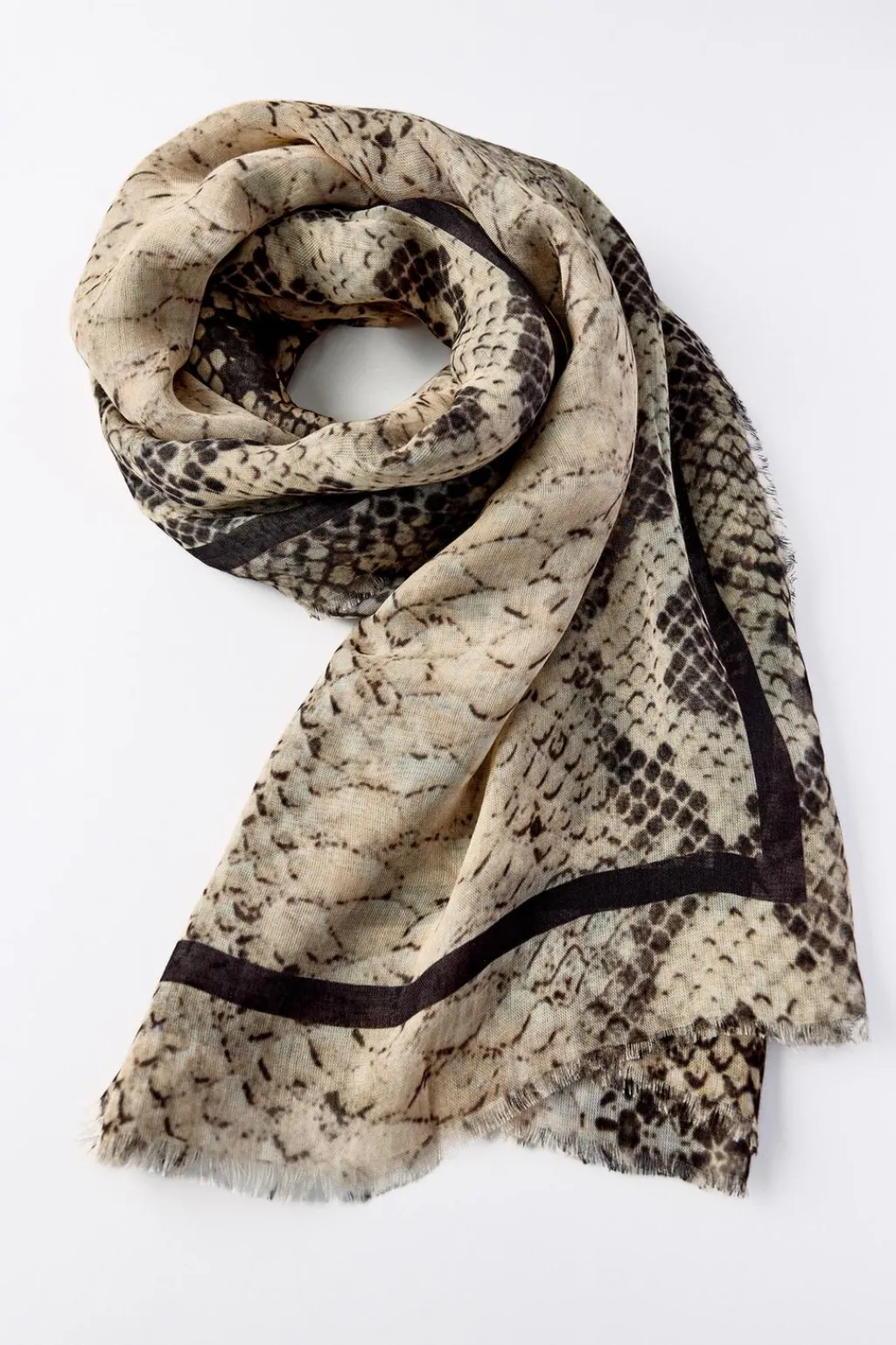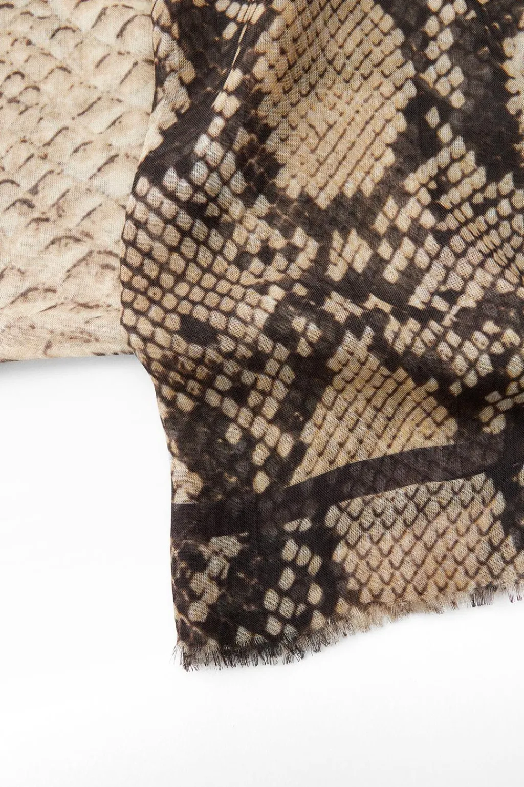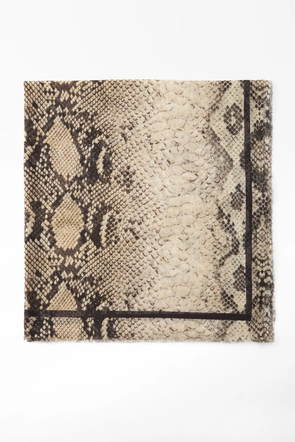 Pañuelo estampado confeccionado en hilatura de modal y 8% seda. Detalle de banda lateral y acabados deshilachados.
