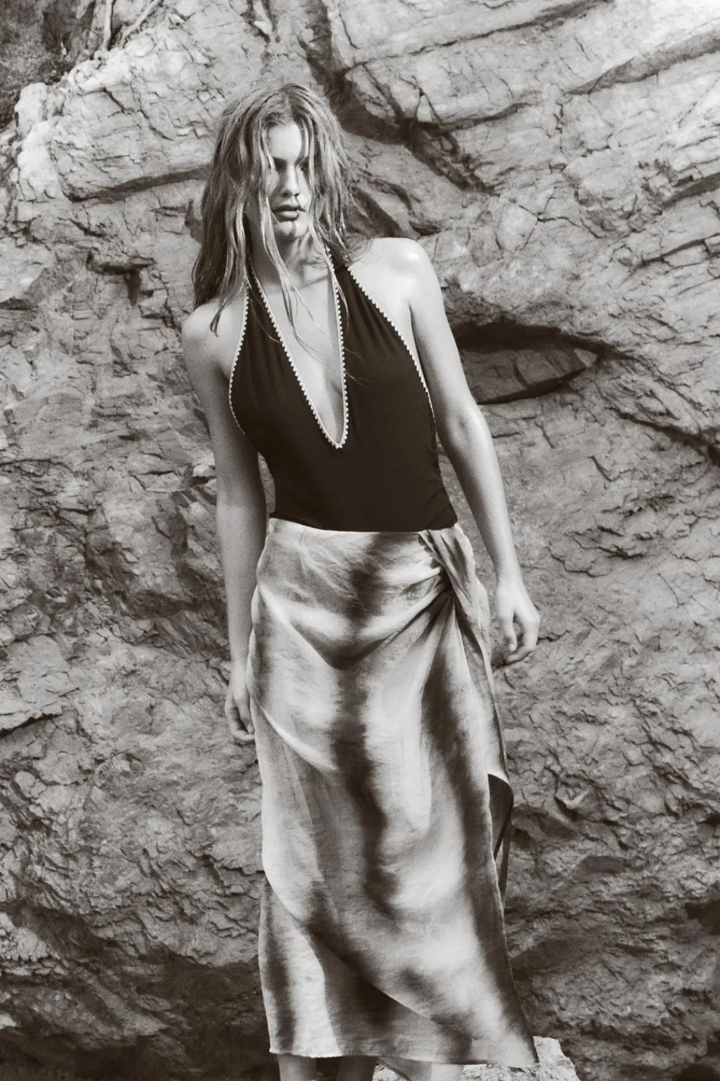 Pareo de tiro medio con detalle de nudo en delantero Cierre en espalda con cremallera.