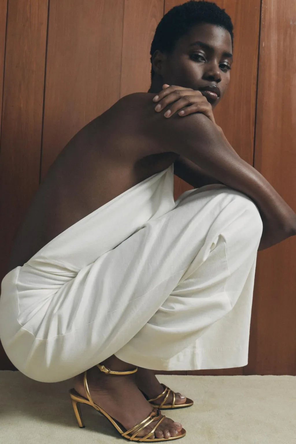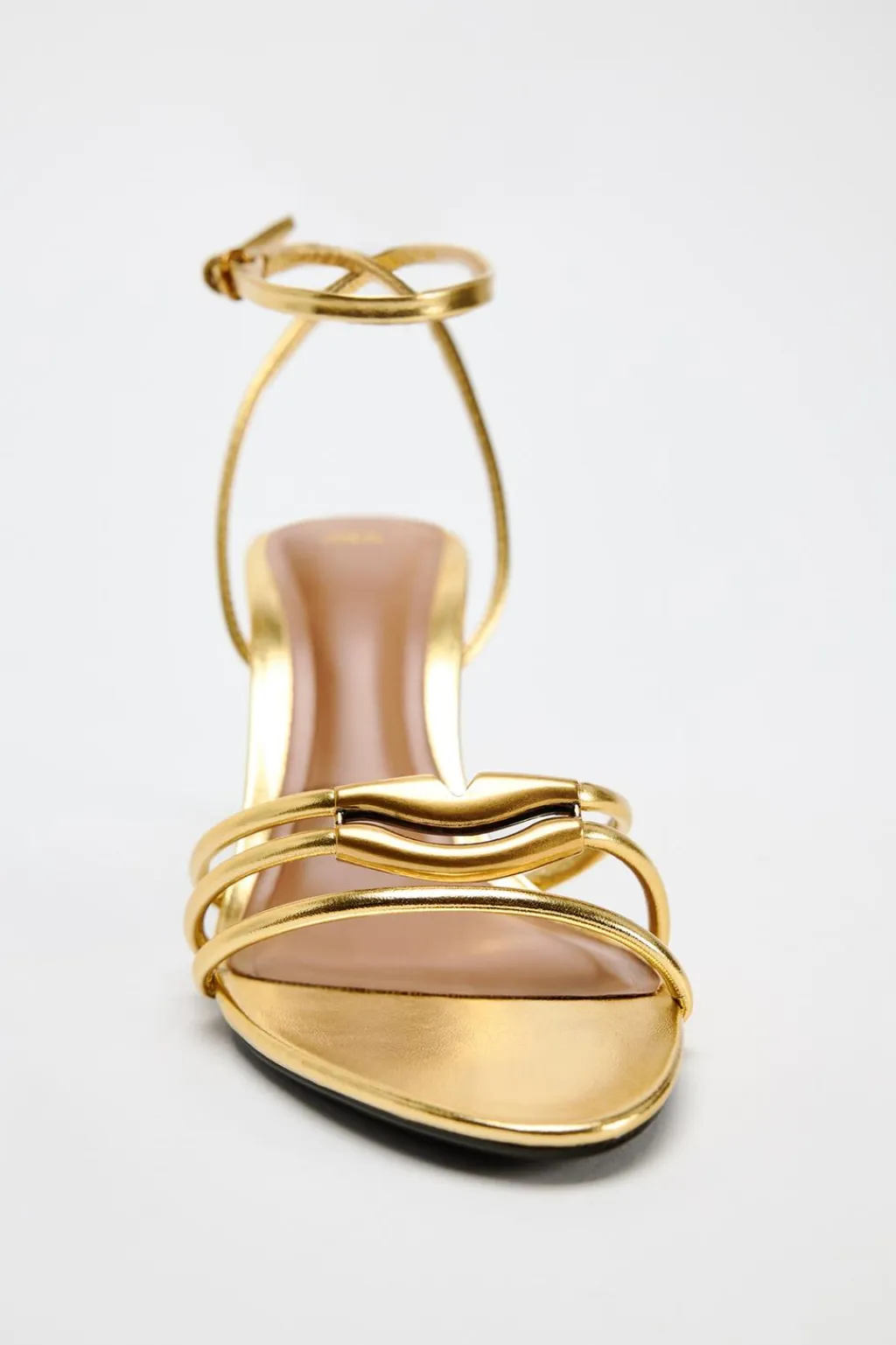 Zapato tipo sandalia de tacón. Efecto metalizado. Tiras finas en la parte delantera. Cierre mediante hebilla en la pulsera al tobillo.