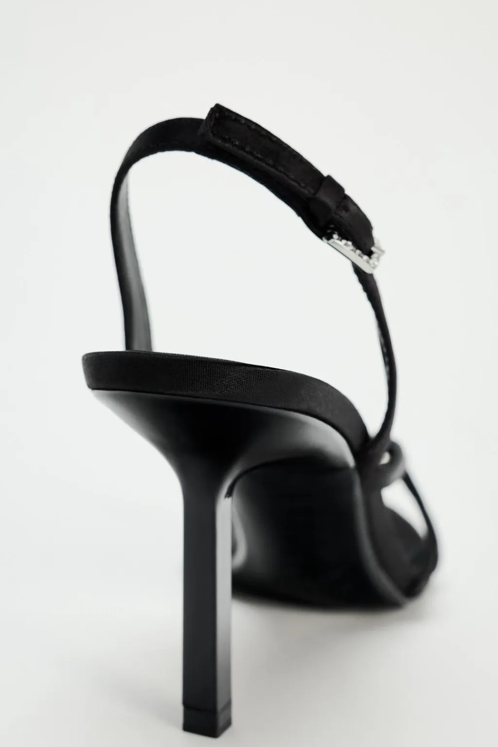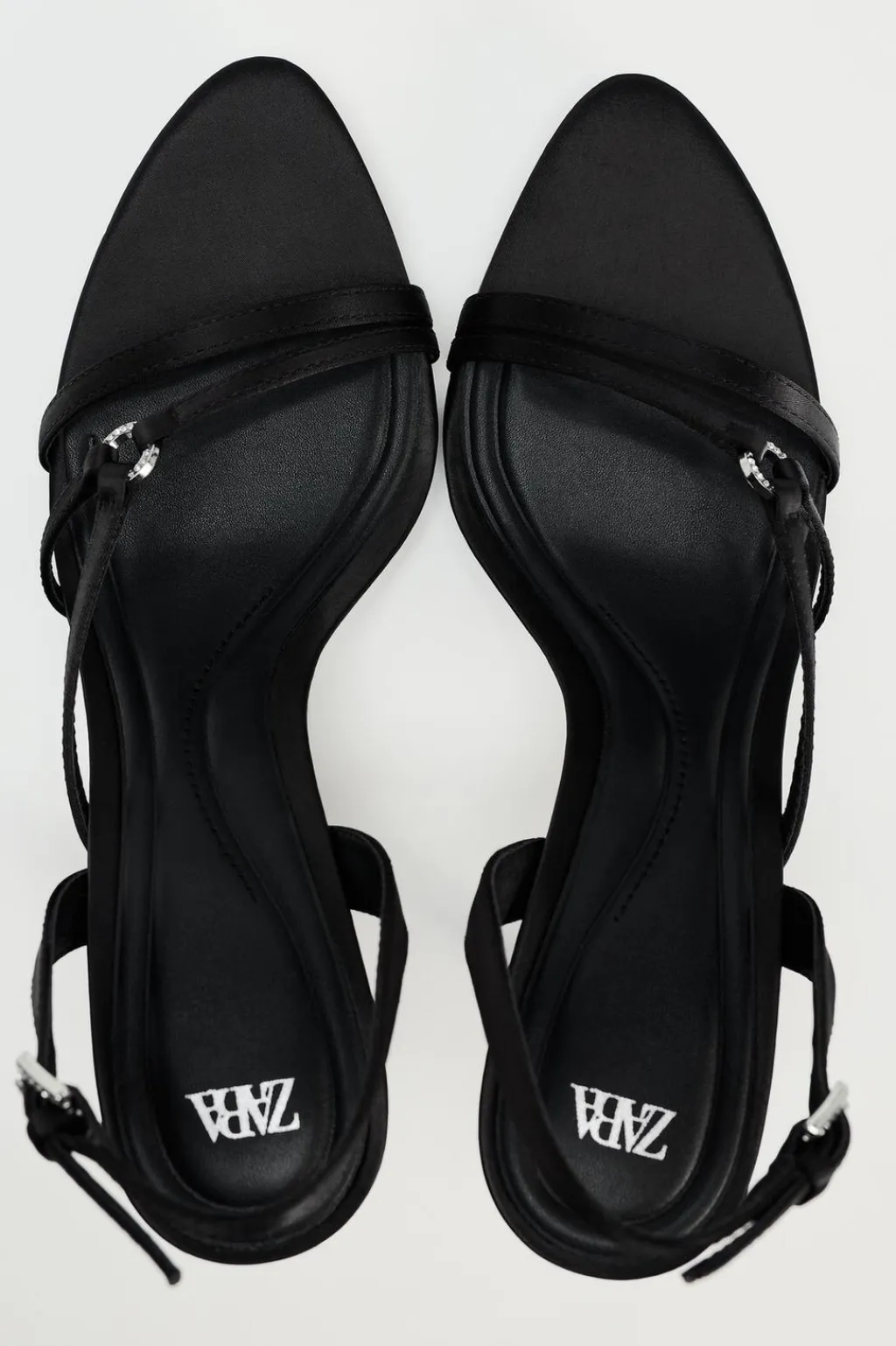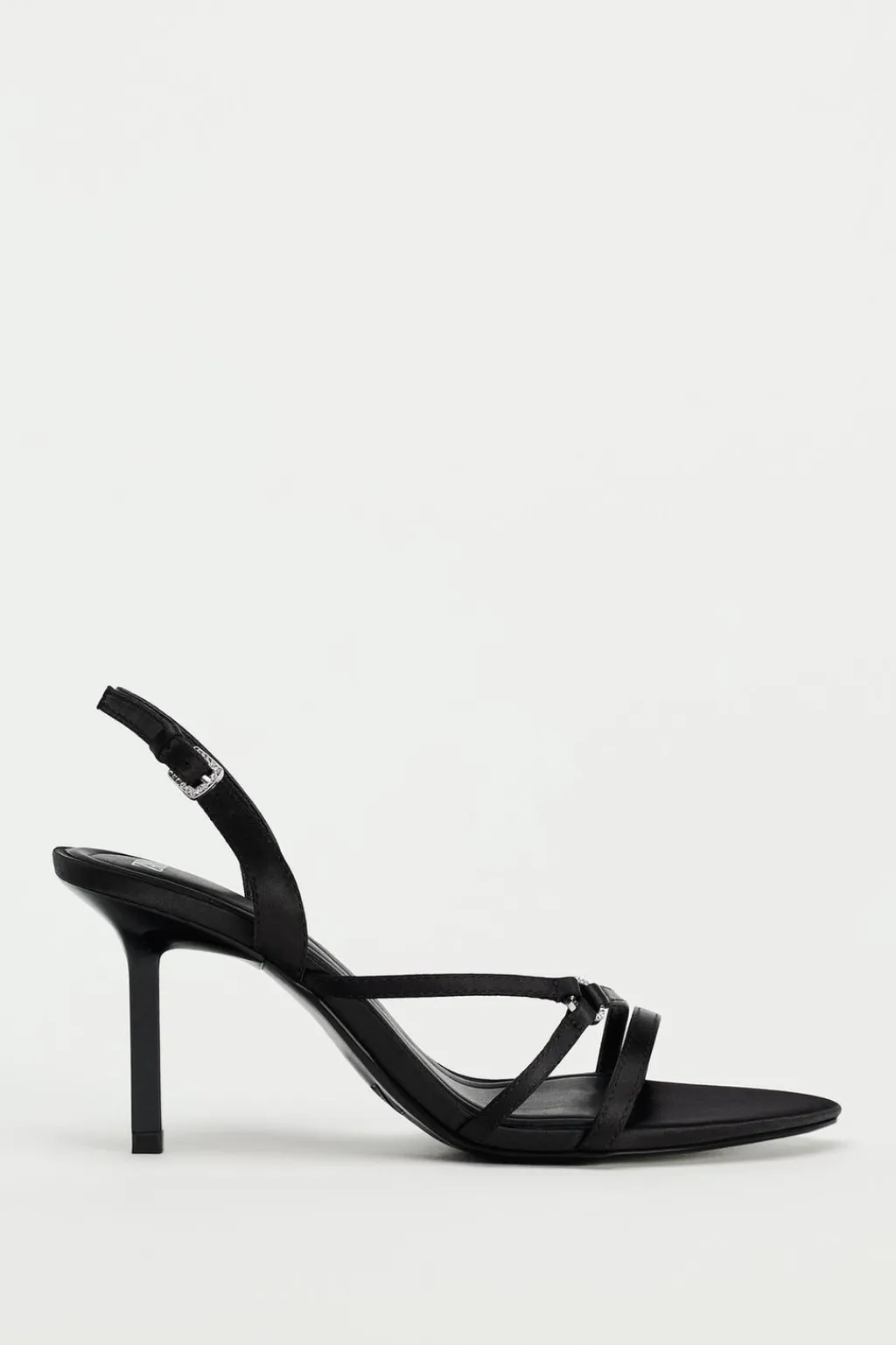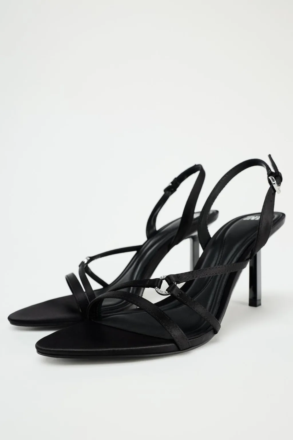 Zapato tipo sandalia de tacón alto y fino. Detalle de tiras en la parte delantera. Cierre de tira de hebilla.