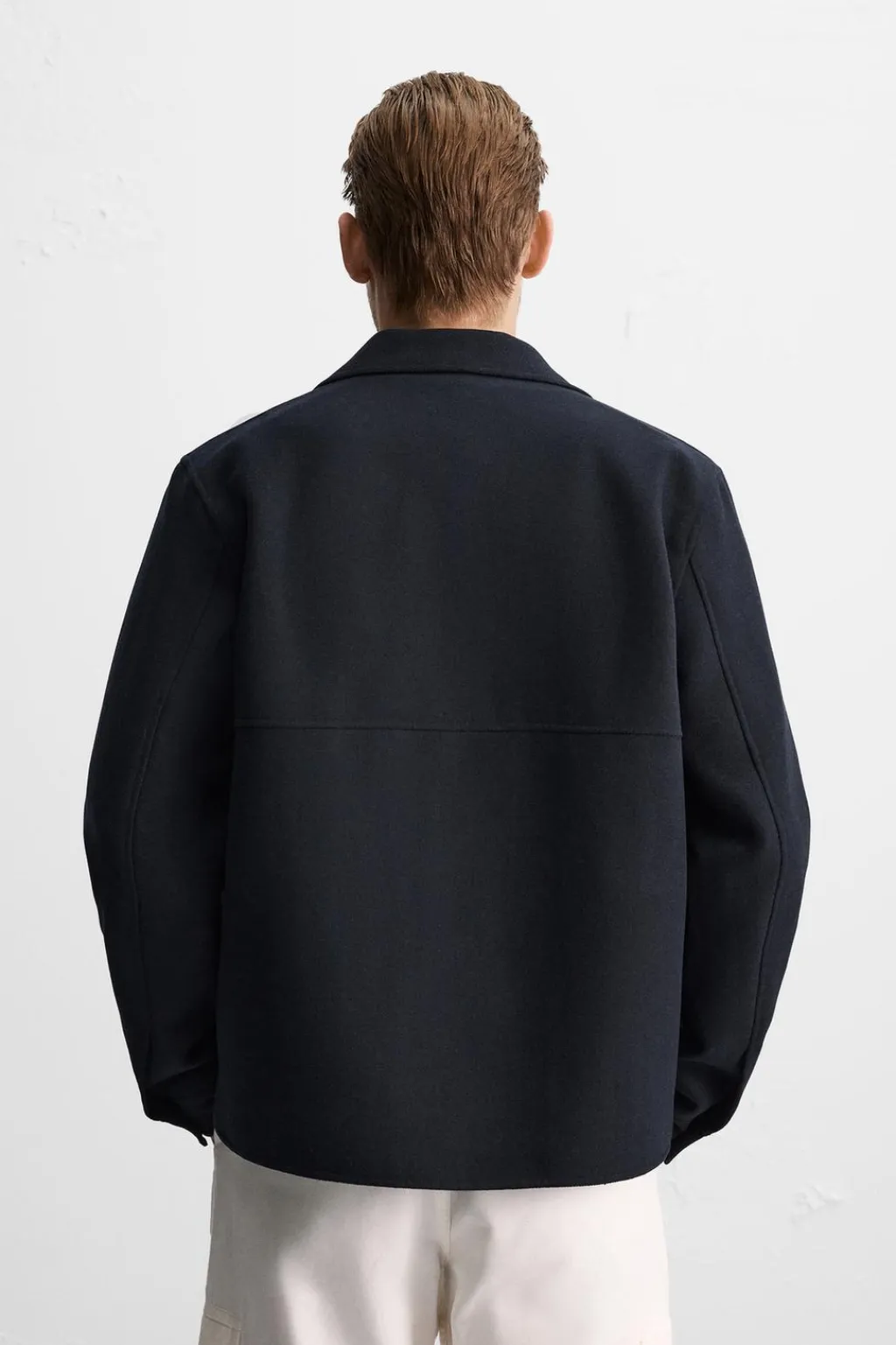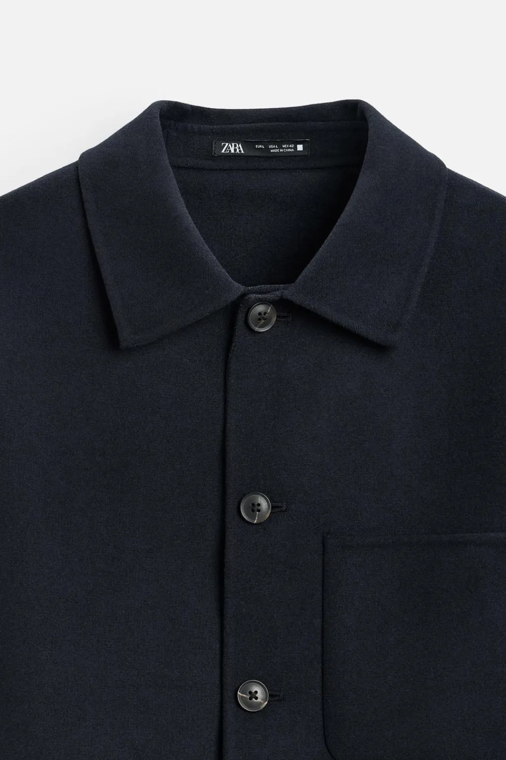 Sobrecamisa relaxed fit confeccionado en tejido con lana. Cuello solapa y manga larga acabada en puño con botón. Bolsillo plastrón en pecho y detalle de bolsillos laterales en cadera. Cierre frontal de botonadura.